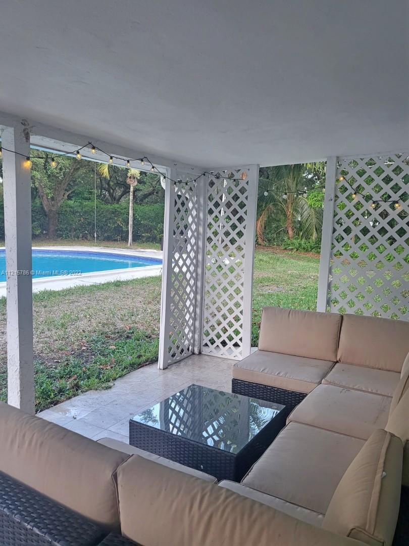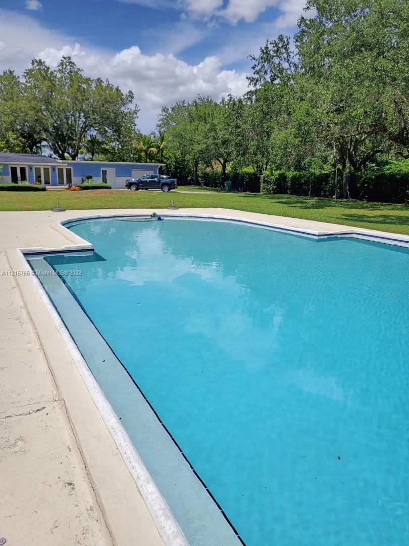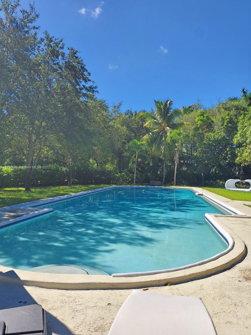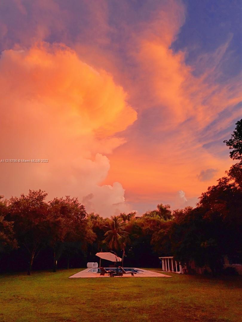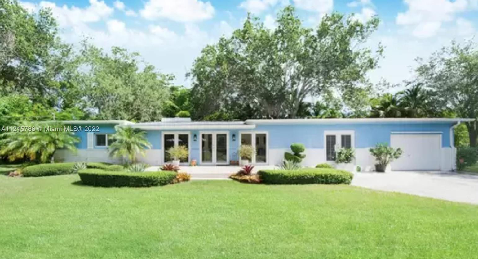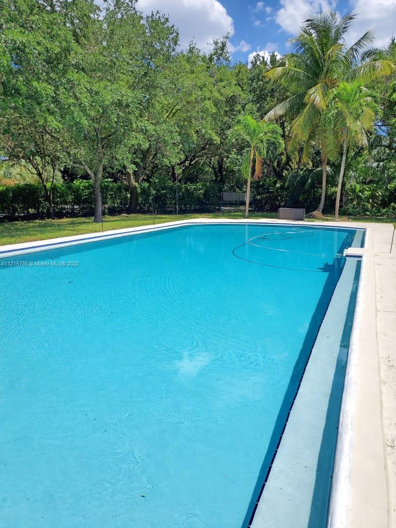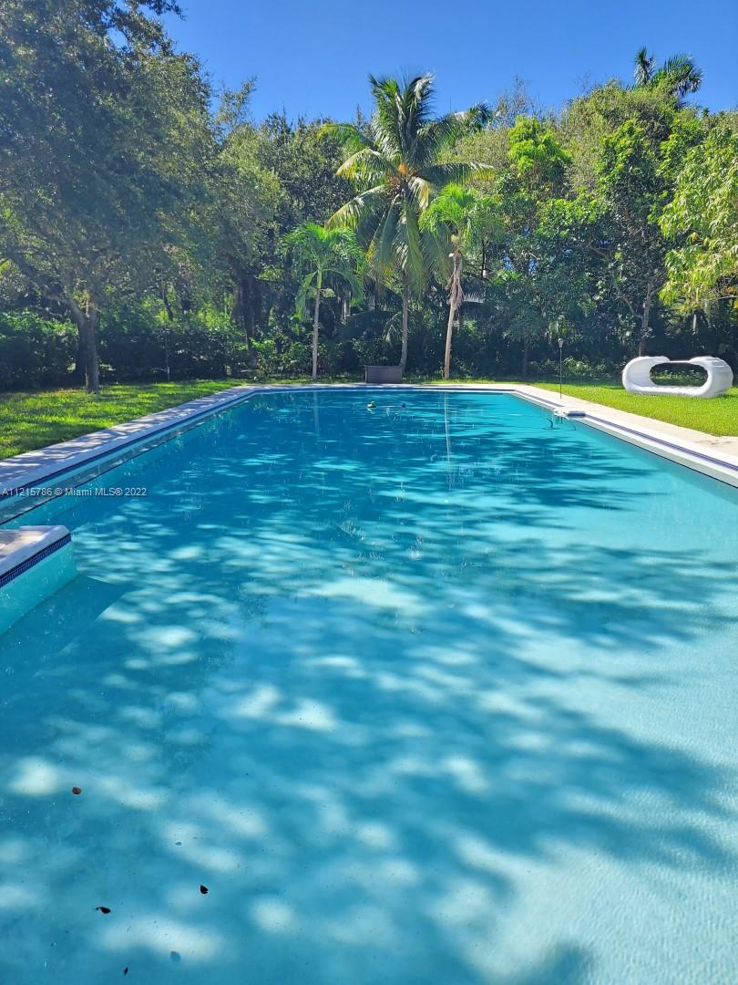 Quiet, inviting, gated North Pinecrest home sitting on over one acre of peaceful greenery. The home is located on a quiet cul-de-sac. The home has multiple mango, avocado and palm trees with a 9' privacy hedge along street. Cottage home has a 3 bed, 2 bath main house, with open floor plan & white Pecky Cypress beam ceilings. The dining area overlooks triple glass doors to an 80' pool & guest house perfect for entertaining. Main house has impact glass and 1-car garage. Pool house was renovated in 2022 with recessed lighting, new kitchen and bath, large porcelain tile floors with 1 bed & full bathroom with an outdoor shower. Guest home can be used as an in-law suite.