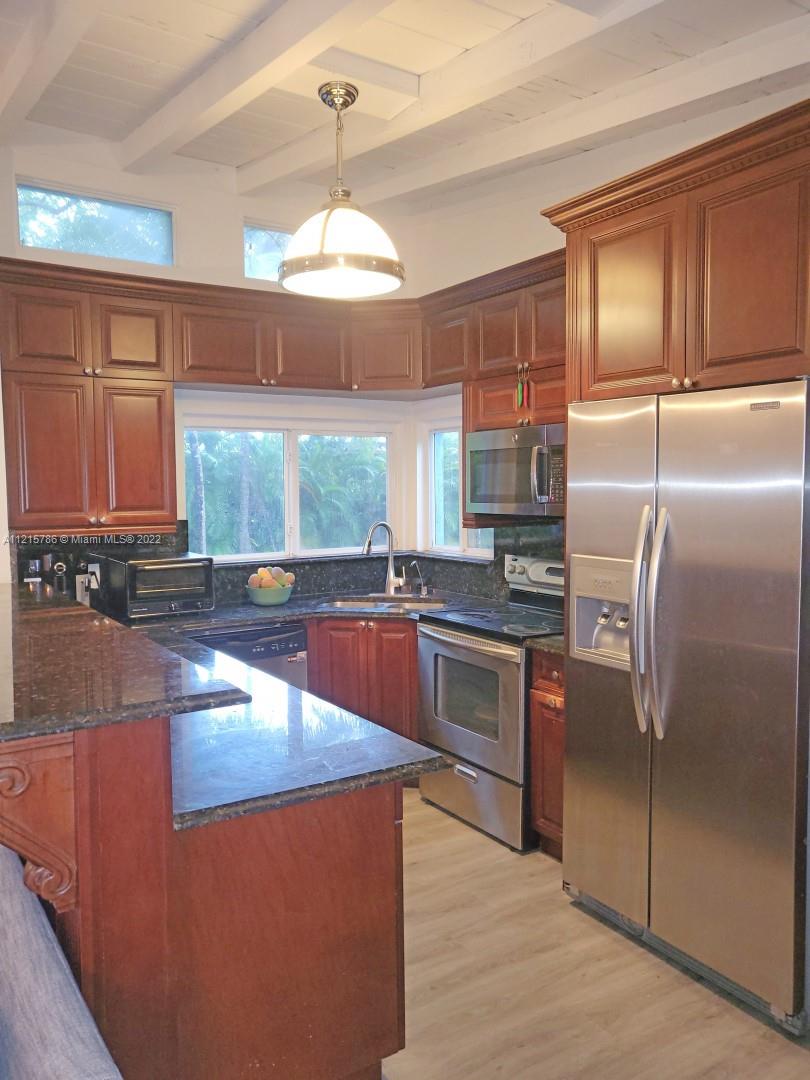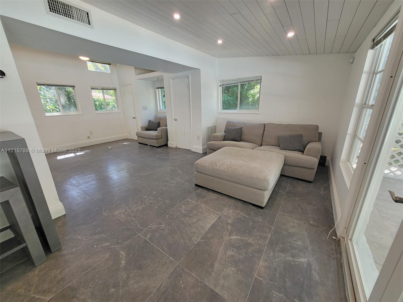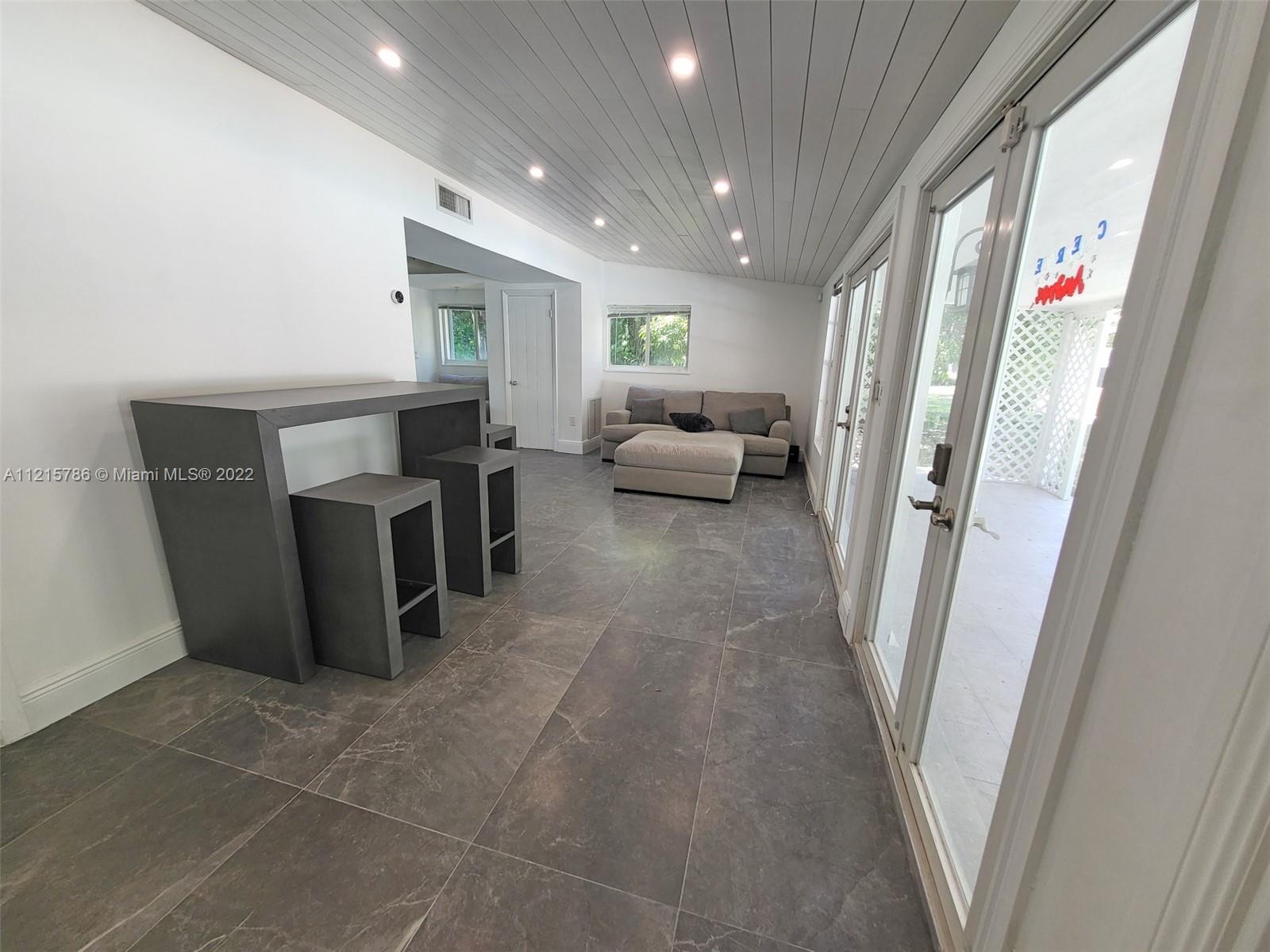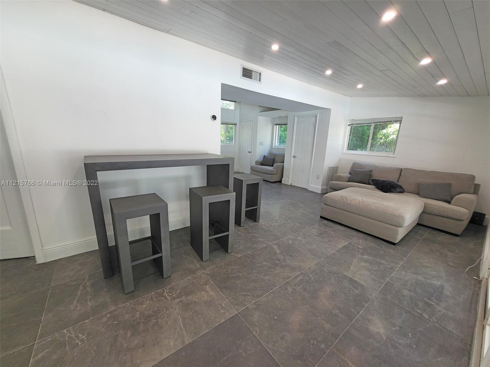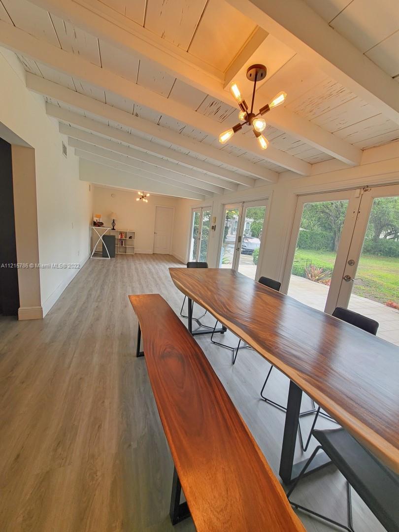 Quiet, inviting, gated North Pinecrest home sitting on over one acre of peaceful greenery. The home is located on a quiet cul-de-sac. The home has multiple mango, avocado and palm trees with a 9' privacy hedge along street. Cottage home has a 3 bed, 2 bath main house, with open floor plan & white Pecky Cypress beam ceilings. The dining area overlooks triple glass doors to an 80' pool & guest house perfect for entertaining. Main house has impact glass and 1-car garage. Pool house was renovated in 2022 with recessed lighting, new kitchen and bath, large porcelain tile floors with 1 bed & full bathroom with an outdoor shower. Guest home can be used as an in-law suite.