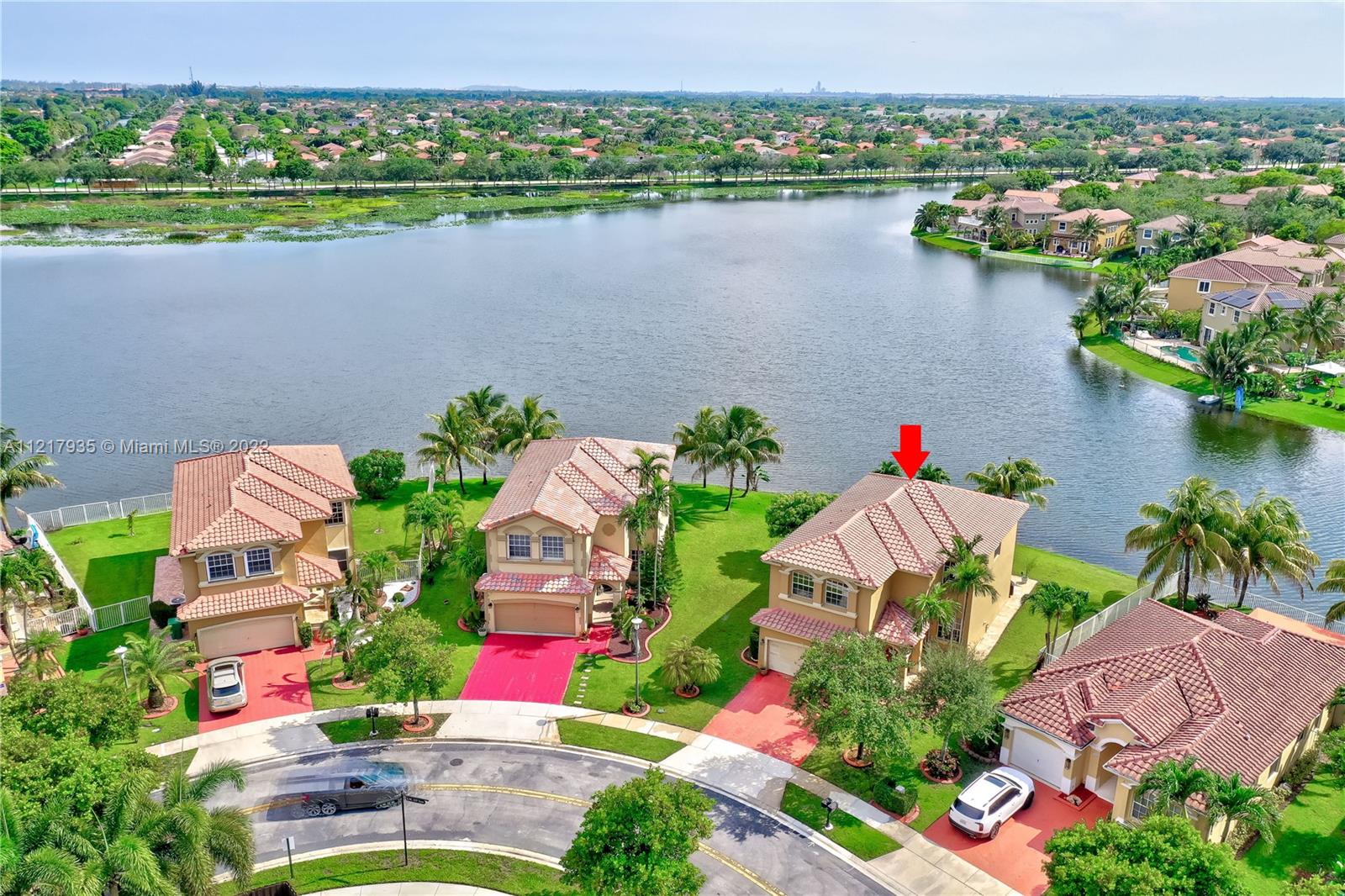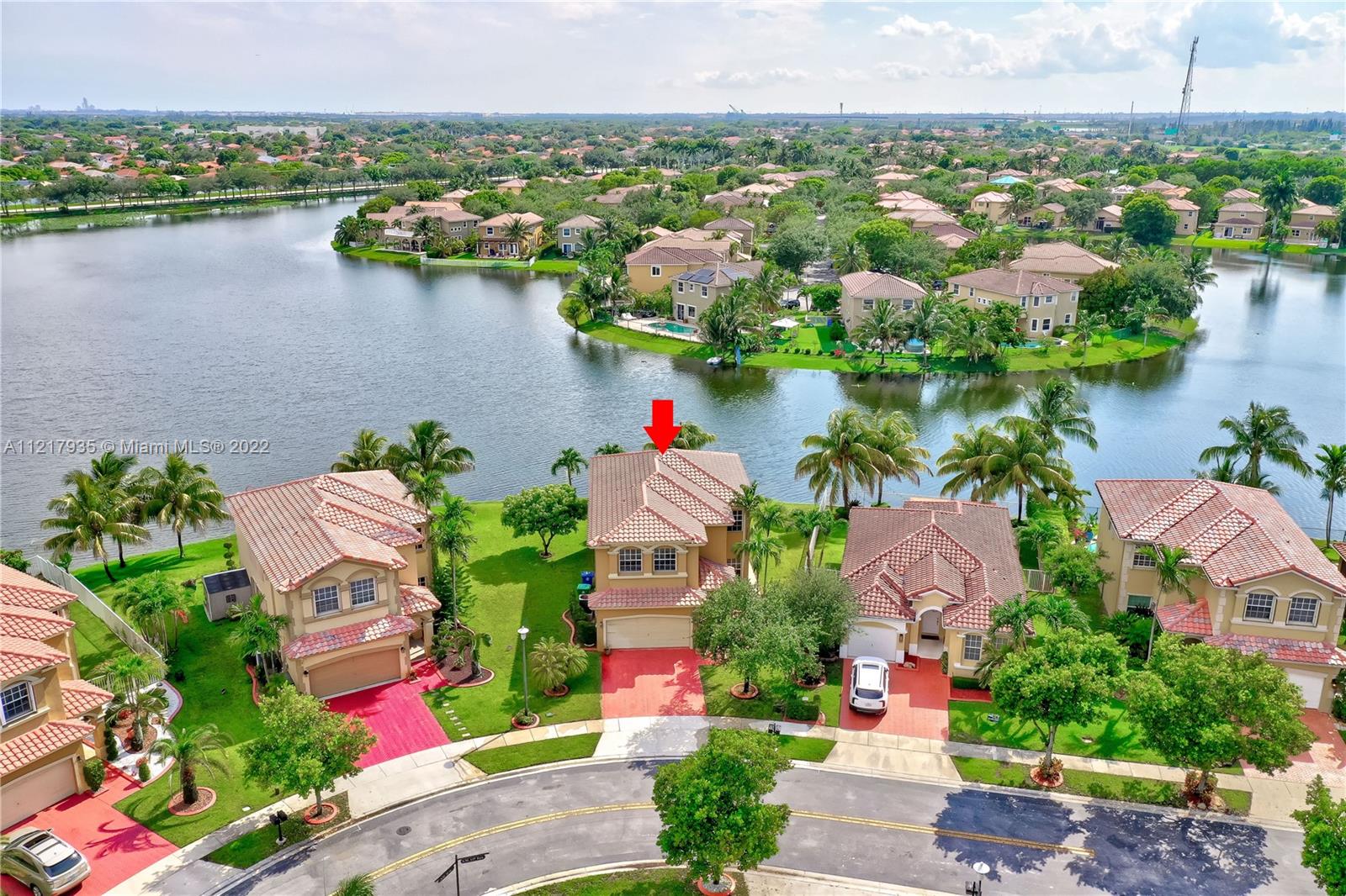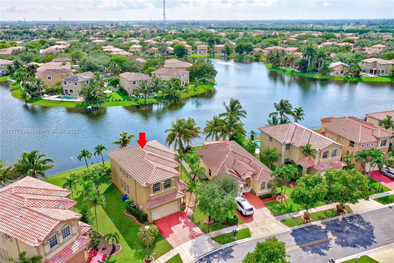4 bed / 2.5 Home in Immaculate condition. Lots of upgrades and pride of ownership is shown. Amazing view of the lake and sunsets. The home features marble floors thru out in great condition and real bamboo wood floors upstairs, Vaulted ceiling with open floor layout and upgraded kitchen. House is located in the very desirable community of Santorini at Vizcaya. This home will not last. Easy to show.
