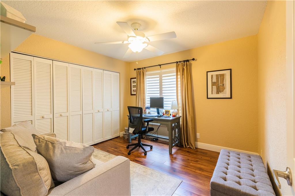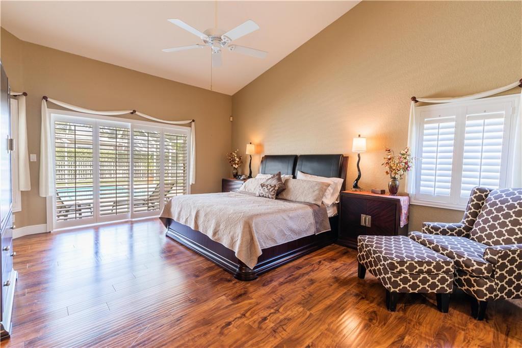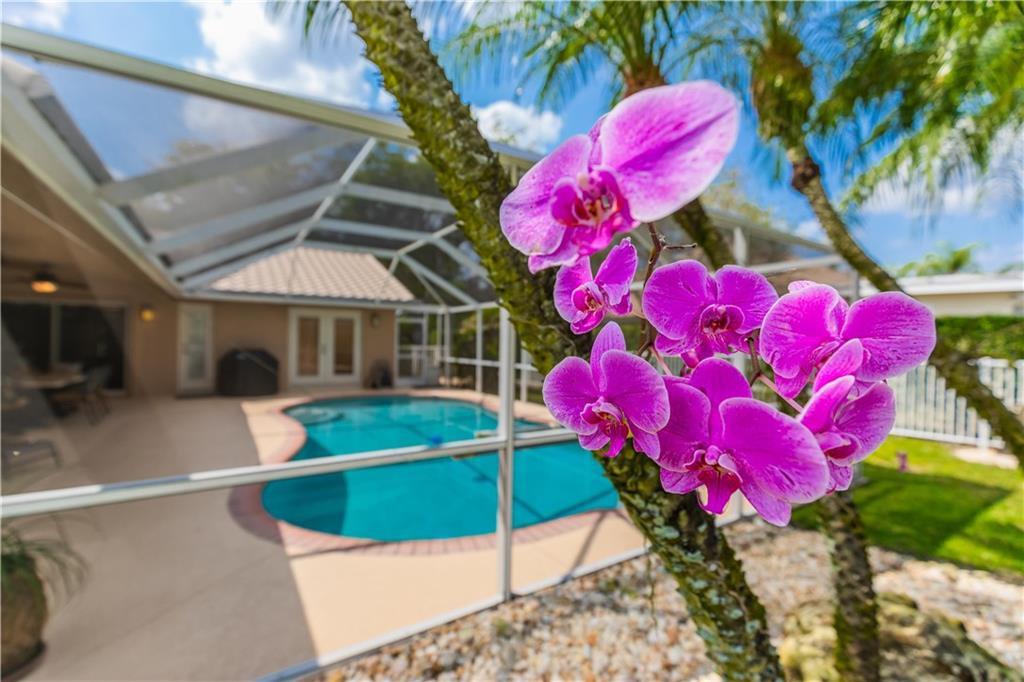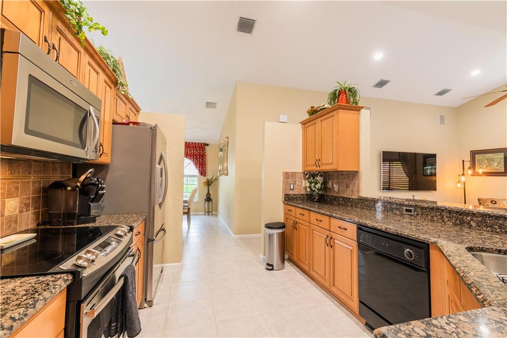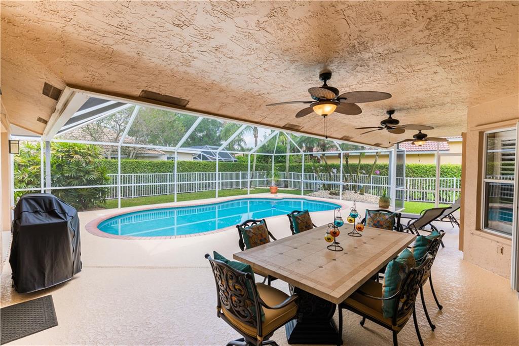 Welcome to Eagle Trace. This 5 bedroom, 3 full bathroom home offers double door entry that opens up to a luxurious living and dining room with vaulted ceilings. Triple split bedroom with ceramic tile throughout main living areas. The updated kitchen has solid wood cabinetry, stainless steel appliances, a beautiful large island, granite countertops. The large primary suite offers an updated bathroom with 2 vanities and spa-like shower. Two walk-in closets. Roof was replaced in 2012. New water heater. Hurricane Shutters. Screened in pool and patio area, fully fenced. Large covered patio area, great for entertaining. Eagle Trace is a 24 hour guard gated community with tennis, playground, pickle-ball, and basketball
