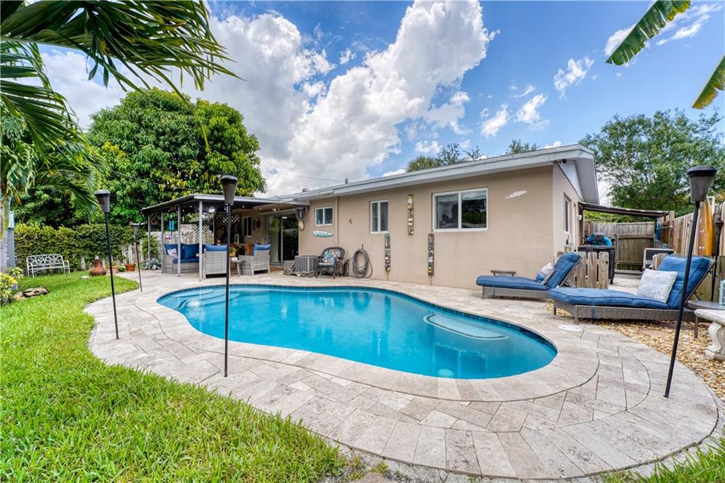 Look no further than this amazing pool home! Located on a quiet cul-de-sac street and offering 3 bedrooms / 2 baths & a covered 1 car carport. Spacious updated kitchen with granite counters and wood cabinets. You will love spending time in this tropical backyard that is equipped with a heated saltwater pool, a covered porch, travertine pavers, and even an extra shed & storage. Other features include impact windows, tile & laminate floors throughout, newer electric. Separate laundry room with extra storage space right off the kitchen. Great starter home or AirBnB. No HOA. Conviniently located in Edgewood community that offers quick & easy access to everything from Ft Lauderdale airport & highways to downtown, beaches & Las Olas Blvd. Call to see it today!