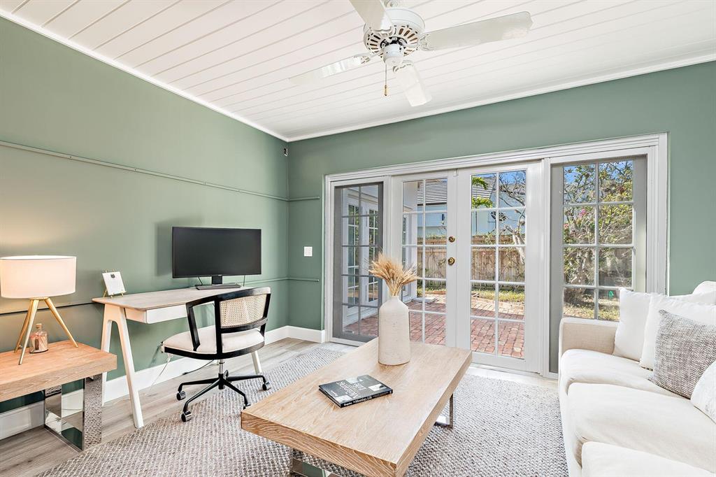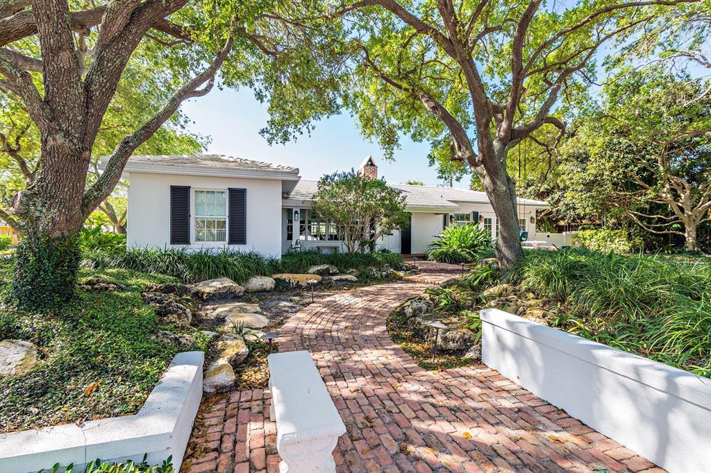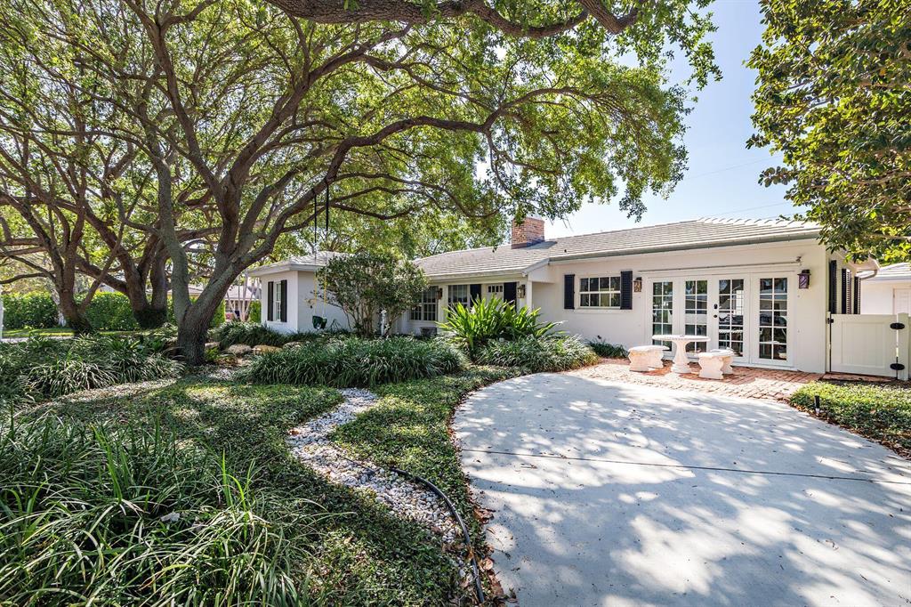 Nestled between a canopy of majestic oak trees, the 3 bedroom 2.5 bath plus library/office and optional family room or 4th bedroom, Southend home sits on an oversized corner lot east of Olive Ave. Dramatic high beamed ceilings and wide plank oak floors throughout grace this one-story residence. The brand new custom kitchen is a Chef's dream. Appointed with a Wolf 5 burner gas range and a fully integrated Subzero refrigerator and freezer. The expansive quartz island was designed for entertaining. The newly renovated, primary suite is wrapped in windows and offers a new luxurious bathroom and large walk-in custom closet. Room for a pool and the secondary structure offers endless possibilities. Additional features include a house generator, wood burning fireplace and a newer roof.