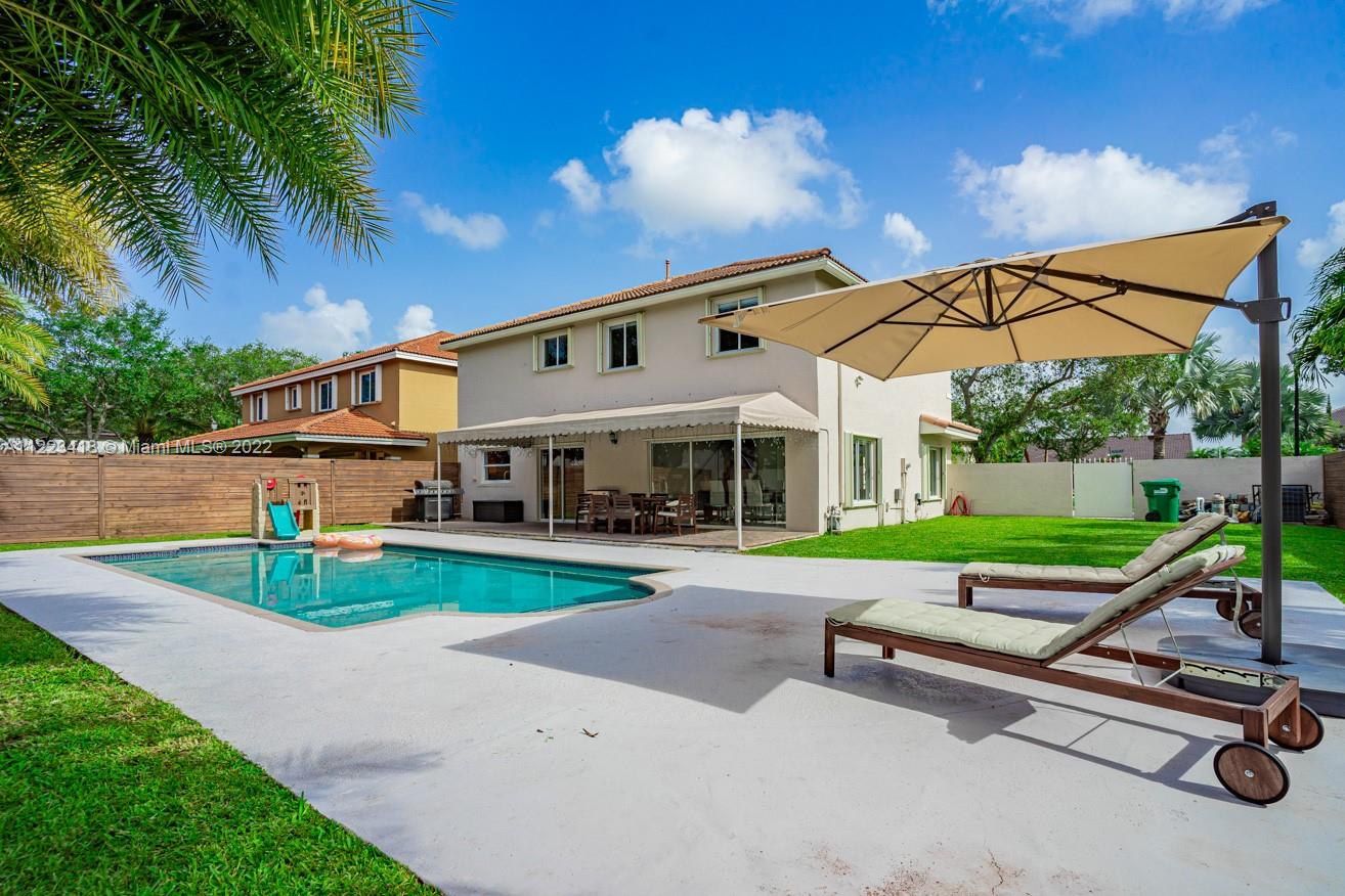 Completely remodeled 4 bedrooms, 2 and 1/2 bathrooms single family home in the exclusive Lakes on the Green complex! With porcelain flooring in the entry level, find a spacious living room with separate dinning room, open concept kitchen with modern cabinetry, granite counter tops and top of the line stainless steel appliances, a half bathroom and a two cars garage (+ 4 spaces outside) Upstair and with wood flooring; are 3 bedrooms with a corridor bathroom, and the master bedroom with lots of space for a sitting area, walk in closet, outside double sinks and master bathroom with tub/shower/bidet. Laundry in the upstairs. Patio with amazing greened area, semi covered area, space for your BBQ and an amazing pool/deck! Beautiful landscaped/enclosed complex with 24/7 security guard on site.