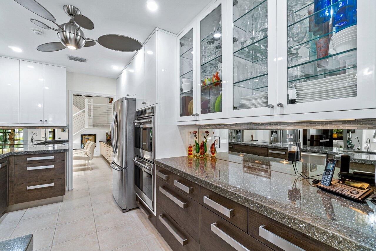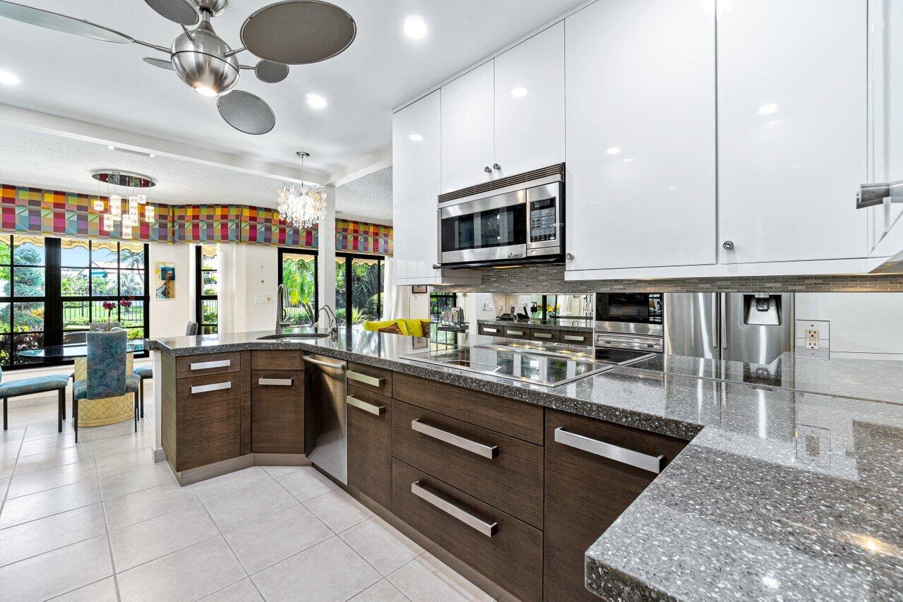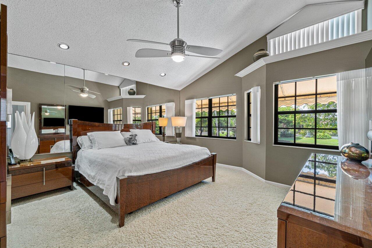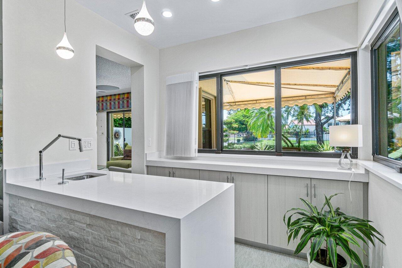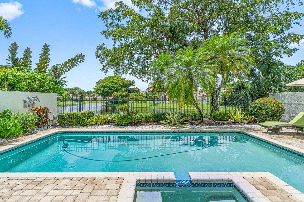 Stunning updated lakefront 4/3 Dominica model perfectly positioned for the best lake & fountain views. Bright open floorplan offers soaring ceilings, floor to ceiling marble fireplace, tile floors & lush carpeting. Gorgeous updated kitchen w/breakfast room, custom two tone cabinets, quartz countertops & stainless appliances. Custom wine bar with wine cooler & white quartz waterfall cabinet. Full bedroom/bath down. Primary suite offers forever lake views, vaulted ceilings, beautiful updated bath w/custom dual vanities, lighted mirrors & spa like shower. Resort style backyard oasis perfect for relaxing, entertaining or dining alfresco. Sparkling private pool & spa. Tropical lushly landscaped courtyard entry leading to patio. Full impact glass, Generac generator and custom fitted 3CG.