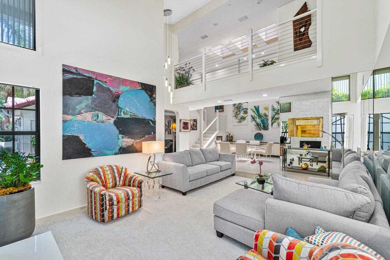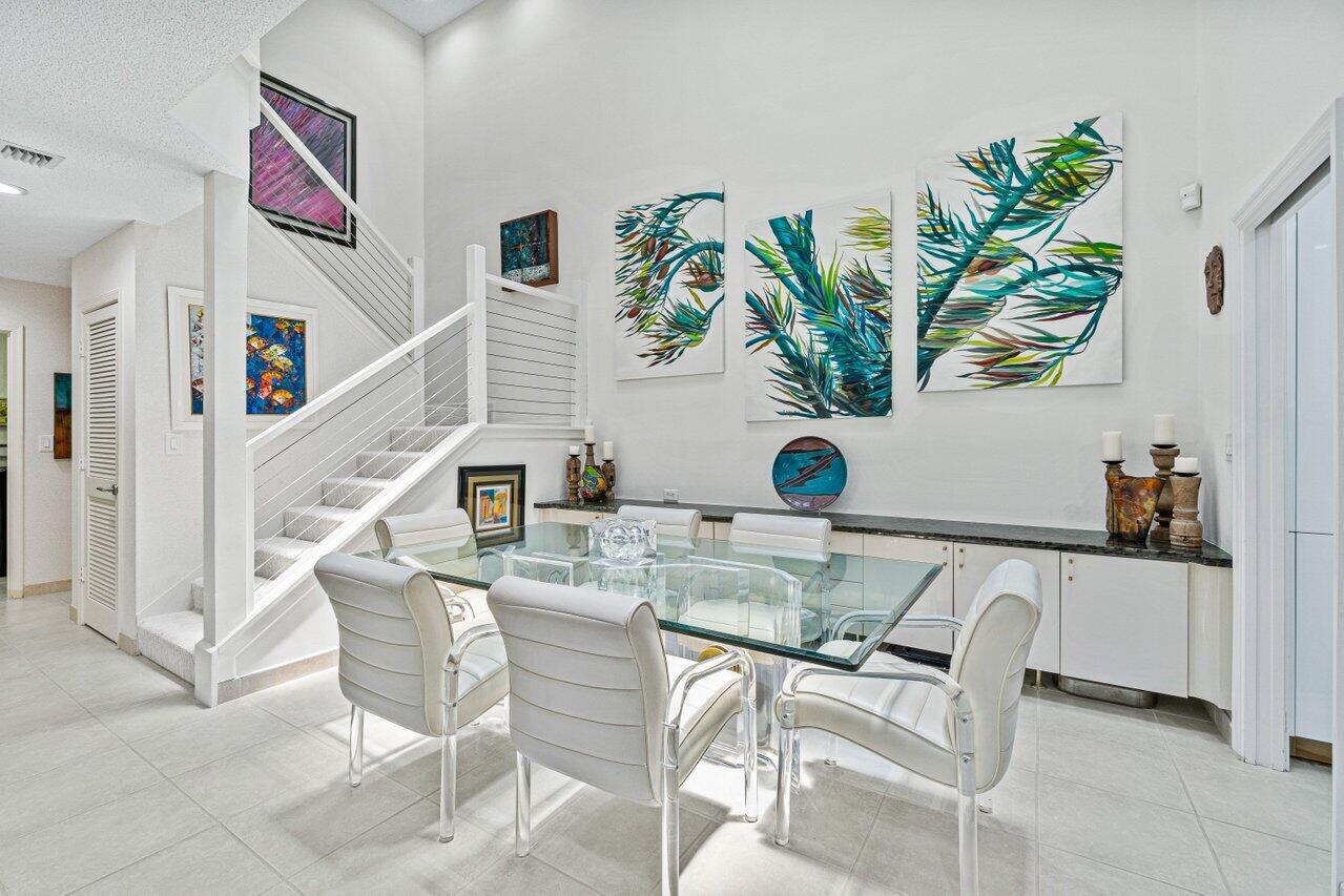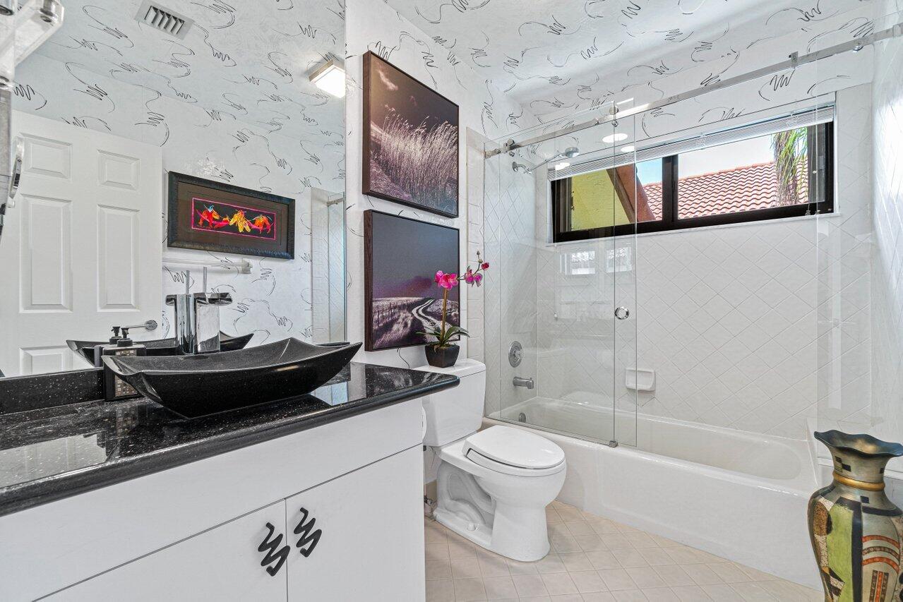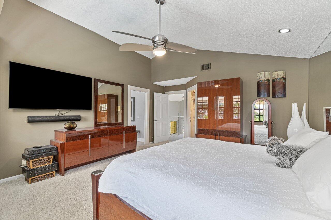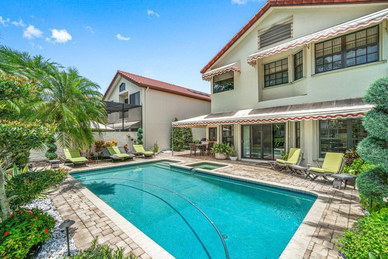 Stunning updated lakefront 4/3 Dominica model perfectly positioned for the best lake & fountain views. Bright open floorplan offers soaring ceilings, floor to ceiling marble fireplace, tile floors & lush carpeting. Gorgeous updated kitchen w/breakfast room, custom two tone cabinets, quartz countertops & stainless appliances. Custom wine bar with wine cooler & white quartz waterfall cabinet. Full bedroom/bath down. Primary suite offers forever lake views, vaulted ceilings, beautiful updated bath w/custom dual vanities, lighted mirrors & spa like shower. Resort style backyard oasis perfect for relaxing, entertaining or dining alfresco. Sparkling private pool & spa. Tropical lushly landscaped courtyard entry leading to patio. Full impact glass, Generac generator and custom fitted 3CG.