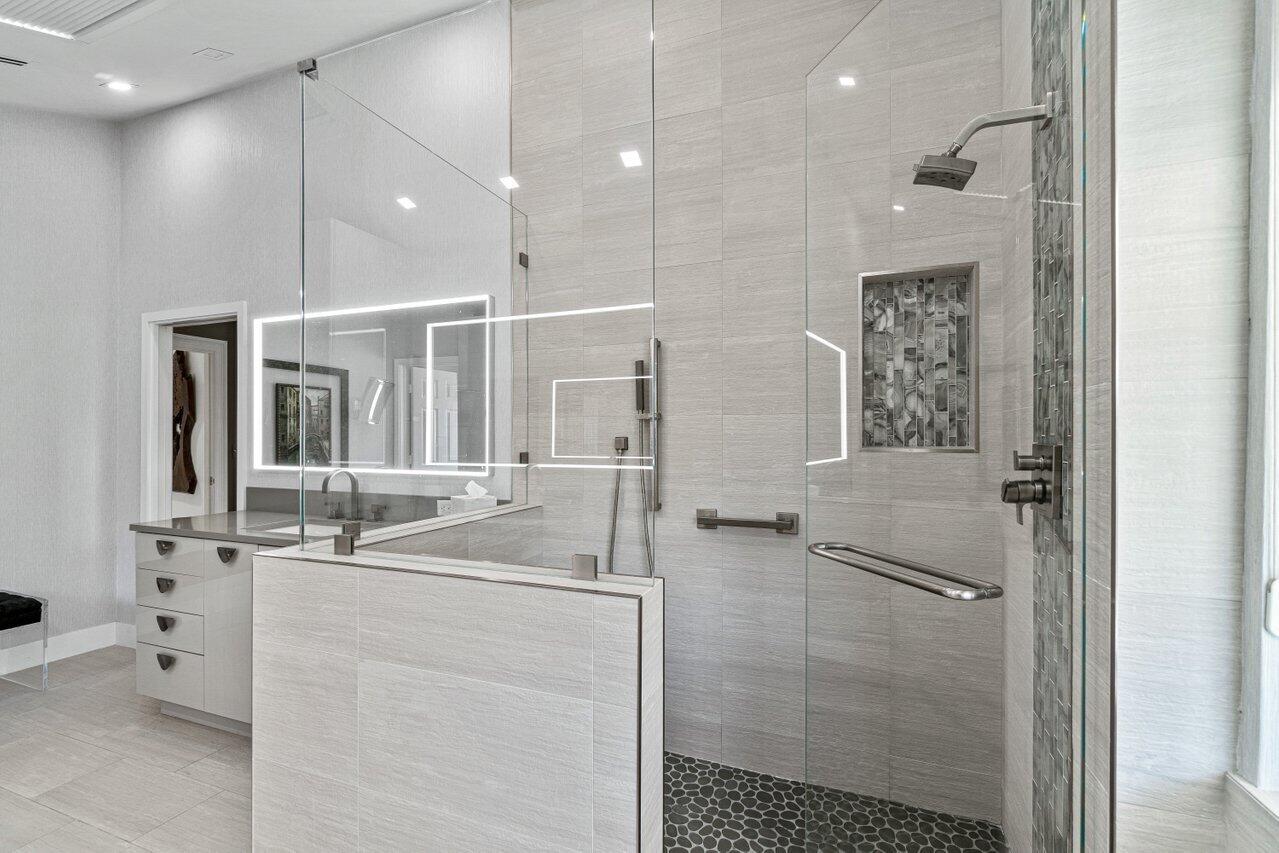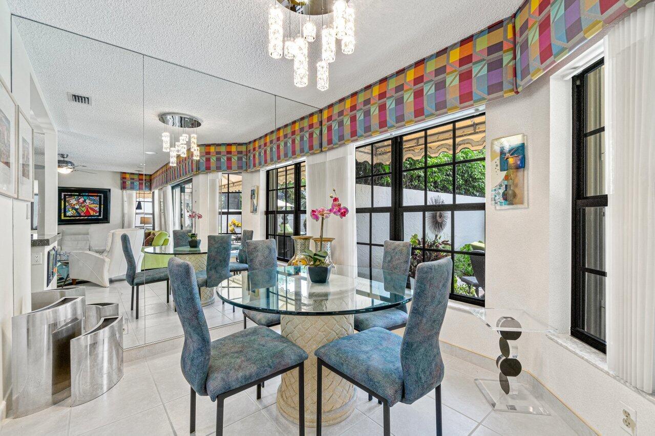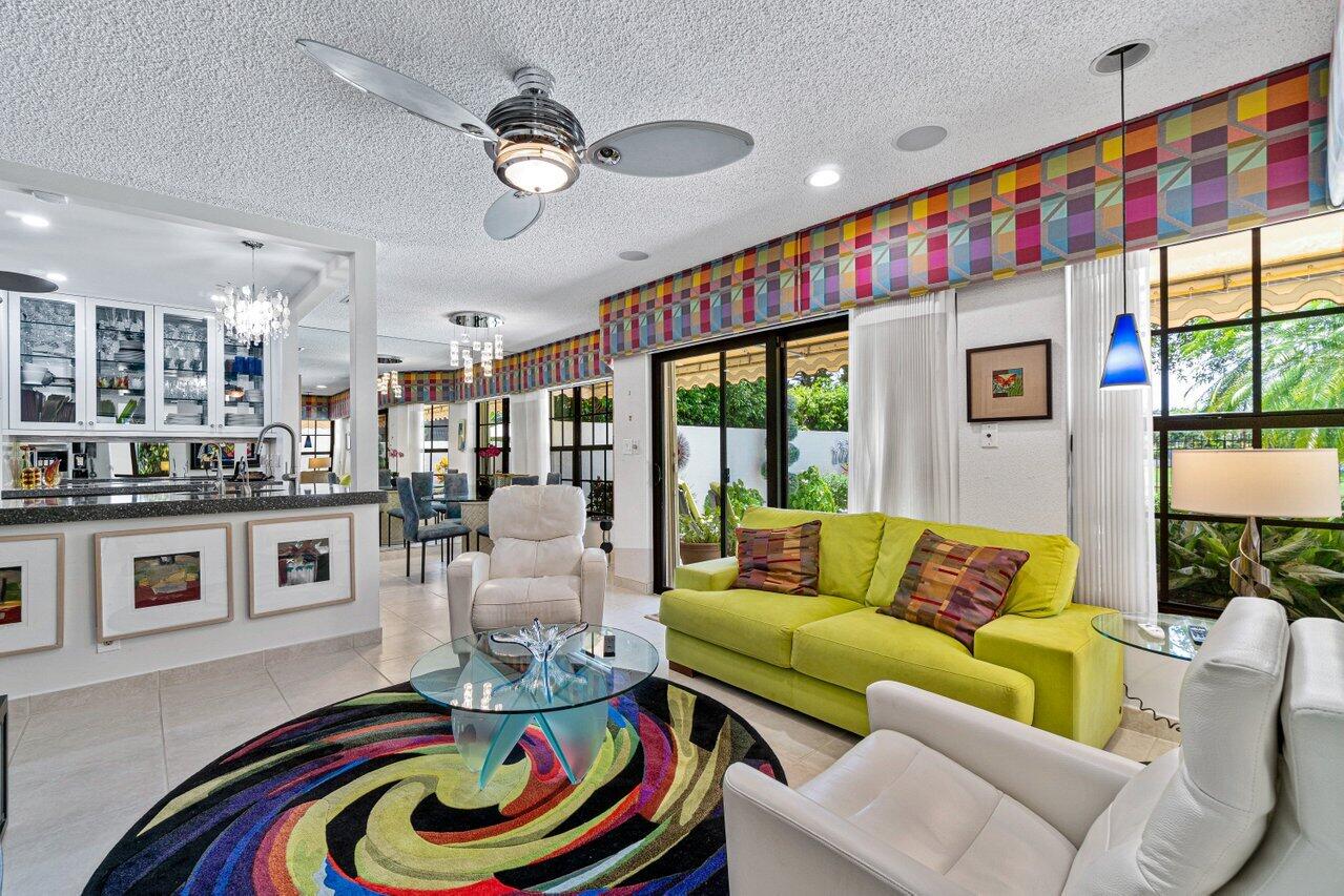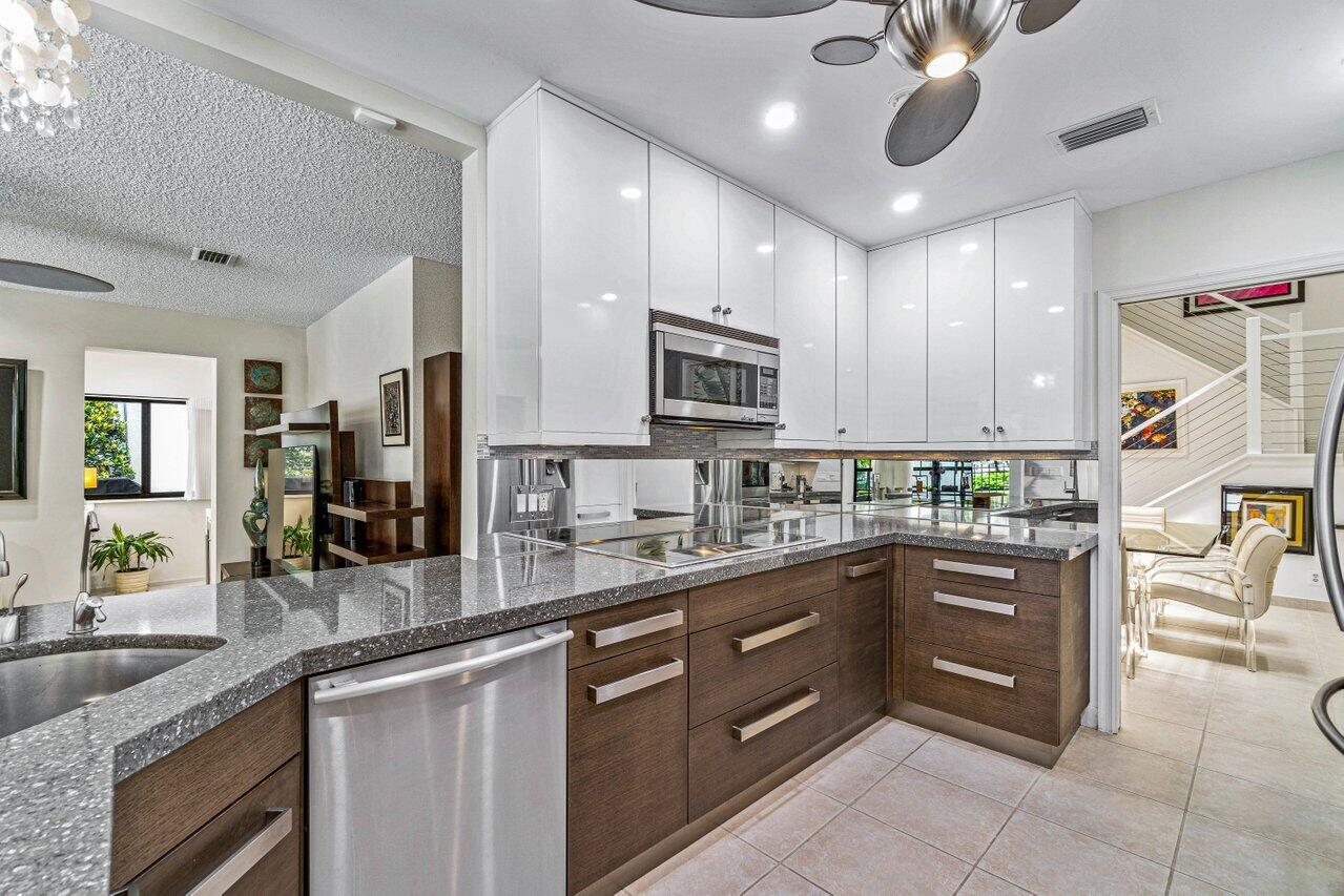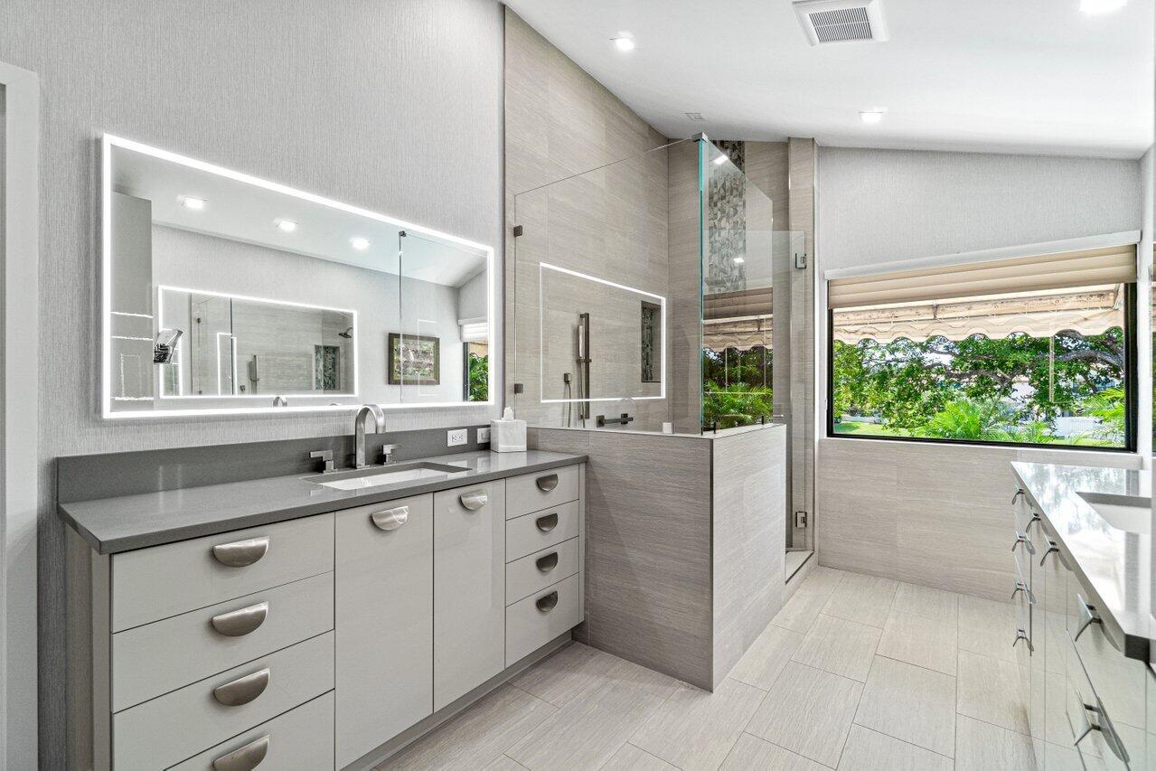 Stunning updated lakefront 4/3 Dominica model perfectly positioned for the best lake & fountain views. Bright open floorplan offers soaring ceilings, floor to ceiling marble fireplace, tile floors & lush carpeting. Gorgeous updated kitchen w/breakfast room, custom two tone cabinets, quartz countertops & stainless appliances. Custom wine bar with wine cooler & white quartz waterfall cabinet. Full bedroom/bath down. Primary suite offers forever lake views, vaulted ceilings, beautiful updated bath w/custom dual vanities, lighted mirrors & spa like shower. Resort style backyard oasis perfect for relaxing, entertaining or dining alfresco. Sparkling private pool & spa. Tropical lushly landscaped courtyard entry leading to patio. Full impact glass, Generac generator and custom fitted 3CG.