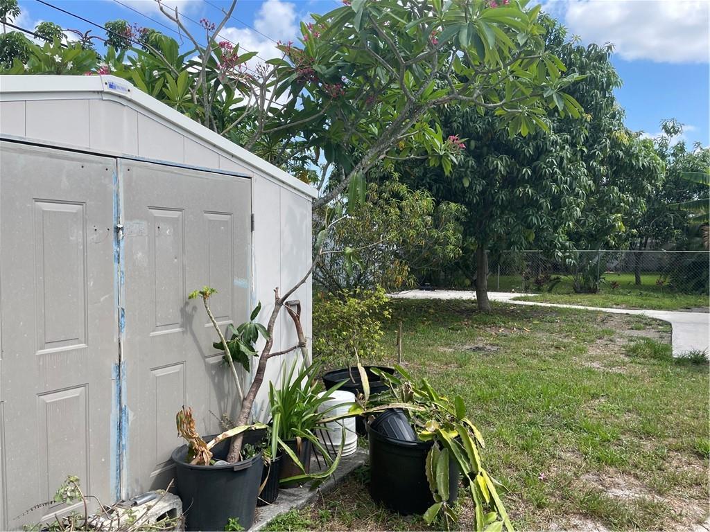 NO HOA!!!! All tiled 3 bedroom 2 bath with an additional room that can be office/den or even a fourth bedroom. Also can be opened to expand dining area. Large Florida room!! IMPACT WINDOWS!!. A/C is only 2 years old. New hot water heater. Storage room in the back. Incredible Fruit trees that include mango, banana, papaya and even a Florida peach tree in this fenced in backyard. Extra storage room, an additional shed and another slab already there for a playhouse or extra storage. Covered front porch. Driveway large enough for 4 cars plus a space for your boat.