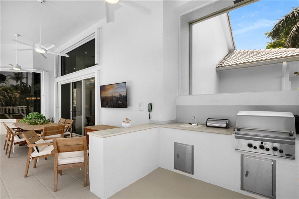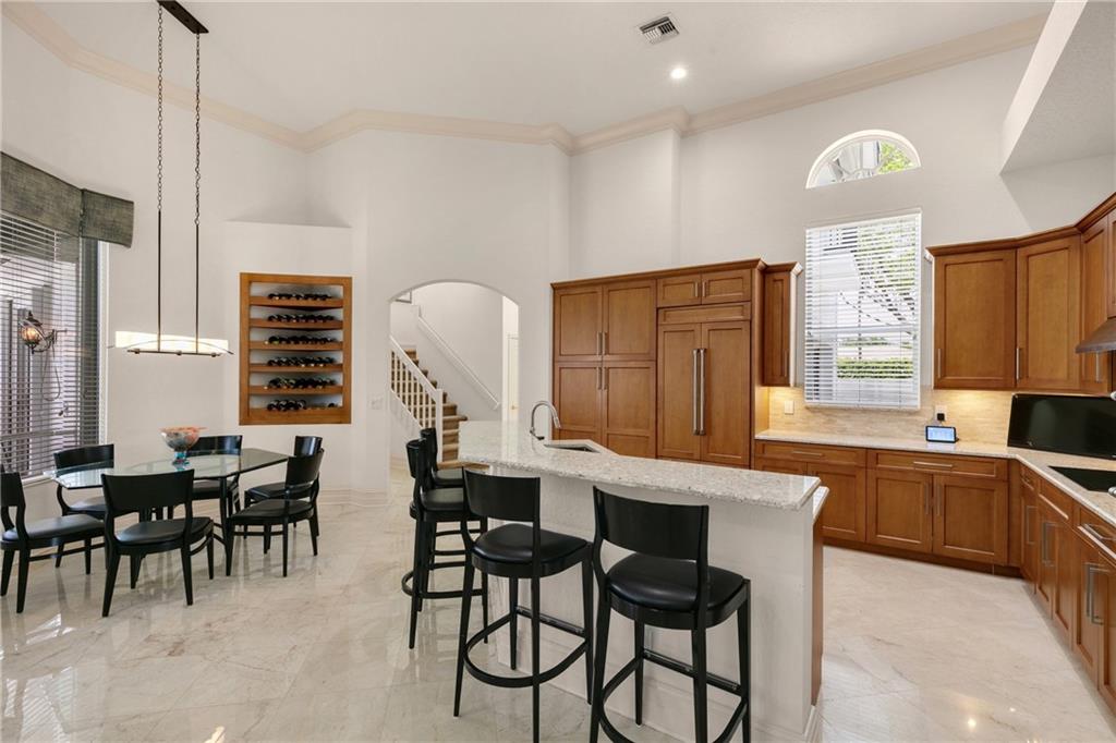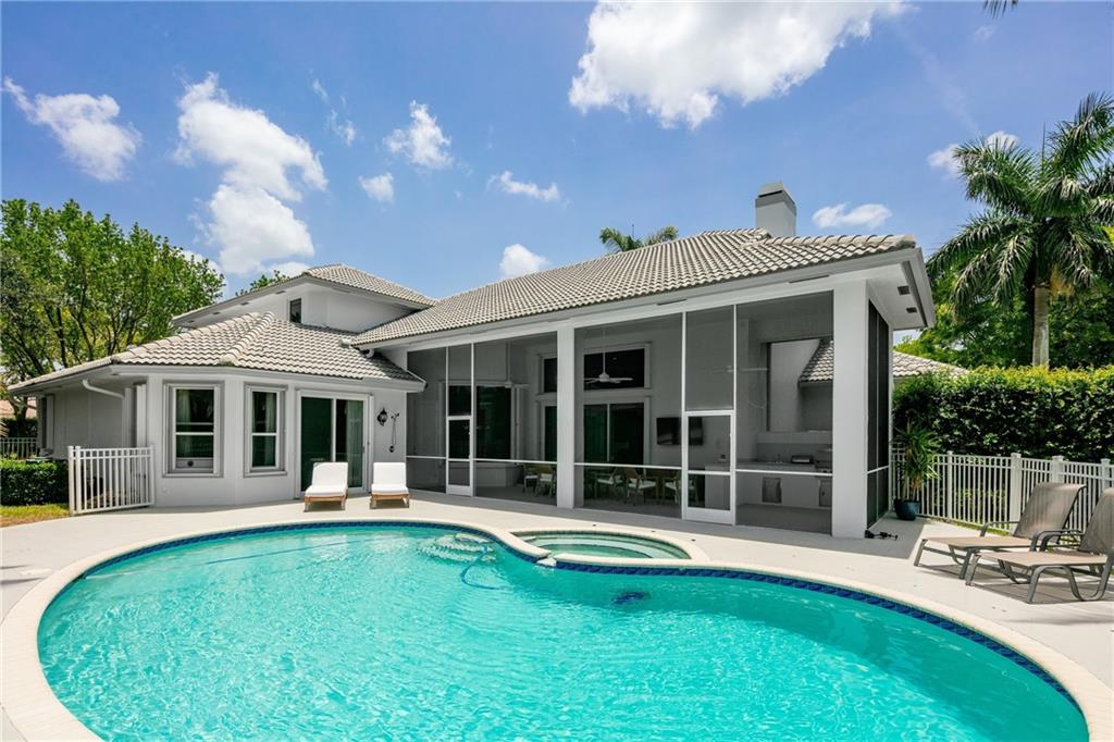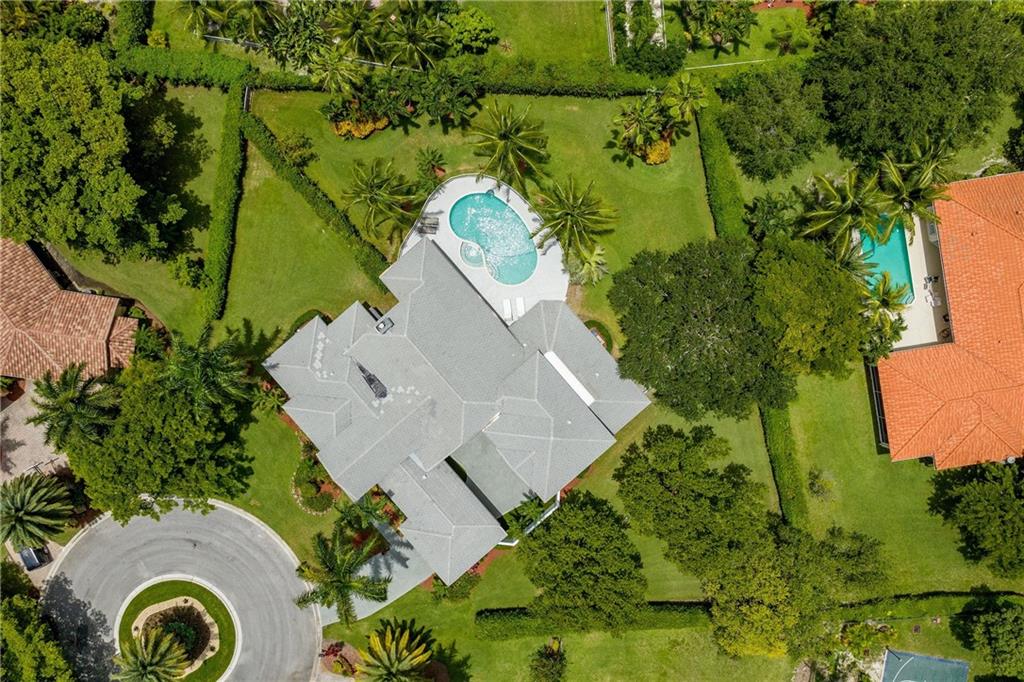 Updated 5 BR 4 1/2 BTH PLUS Media room (6th BR) on .66 Acres, fenced Cul du Sac lot. Natural light & luxe finishes, volume ceilings, marble in living areas & baths, foyer, formal living/dining, open eat-in kitchen, quartz counters/bar, stone backsplash, wood cabs w pantry. Family room w fireplace overlooks pool. Master w sitting area & large bath, over-sized secondary bedrooms & baths. Separate upstairs Bedroom Suite/In-law Quarters w full bath & private stairway off family room. Large freeform pool/spa w big sun deck, covered/screened patio w built-in summer kitchen. Gated motor court w Porte Cochere, 2 car garage & separate entry. Newer JennAire appliances, fixtures, AC's, LED lighting, impact windows & doors on front of house,courtyard & entire 2nd story, accordions on rear windows.