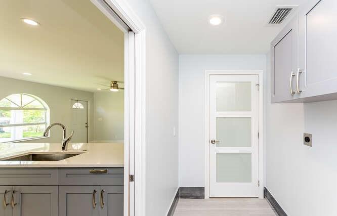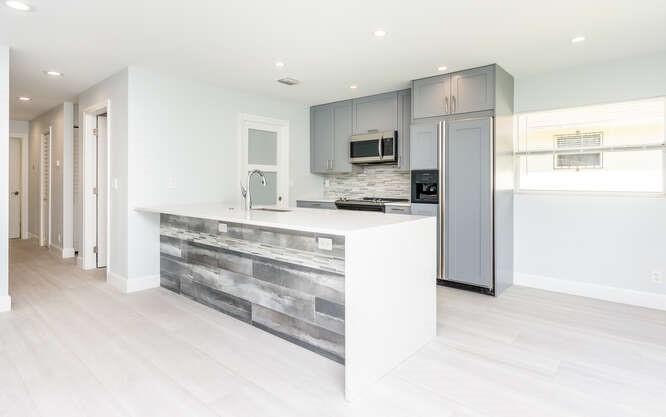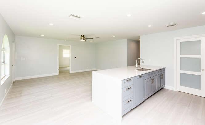 Move in ready!! 2.7 miles to beach.This home has been totally renovated from top to bottom with permits! 4/2 nice sized laundry room off new high-end kitchen. Hurricane Impact windows and doors throughout. Brand new roof! Landscaped with all new sod, new sprinkler system and new fence. Extra wide covered carport. New Smoke/Carbon Monoxide alarm. New fans in every room. All new air ducts with a 3.5 ton A/C. All cast iron pipes replaced. New grey rectified wood grain porcelain tile throughout. Open concept, all new kitchen with quartz waterfall countertops, undermount stainless sink, disposal, KitchenAid dishwasher and refrigerator with water/ice maker. Electric glass cooktop stove with convection oven. Grey, soft-close shaker style cabinetry including front panels on fridge and dishwasher.