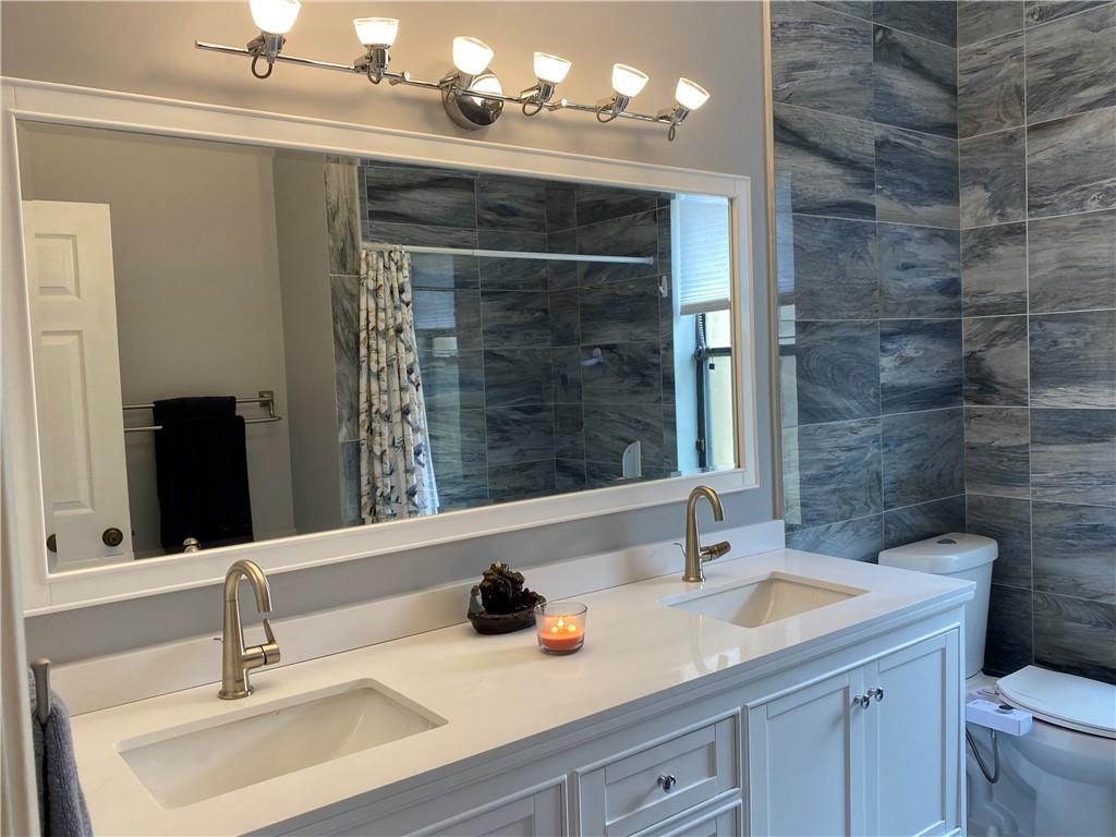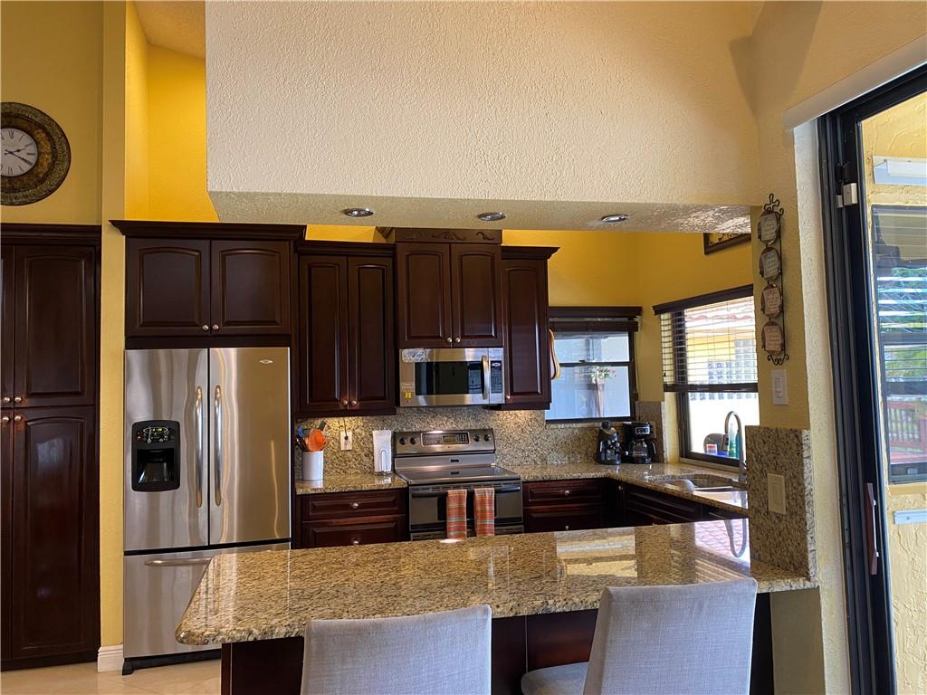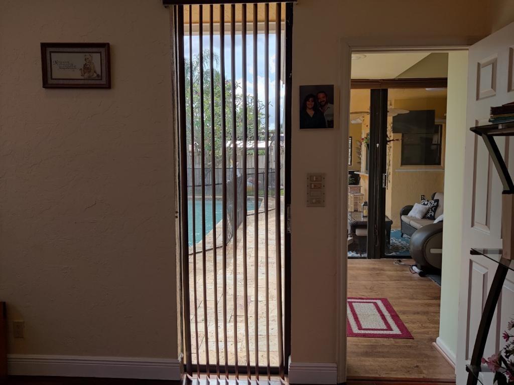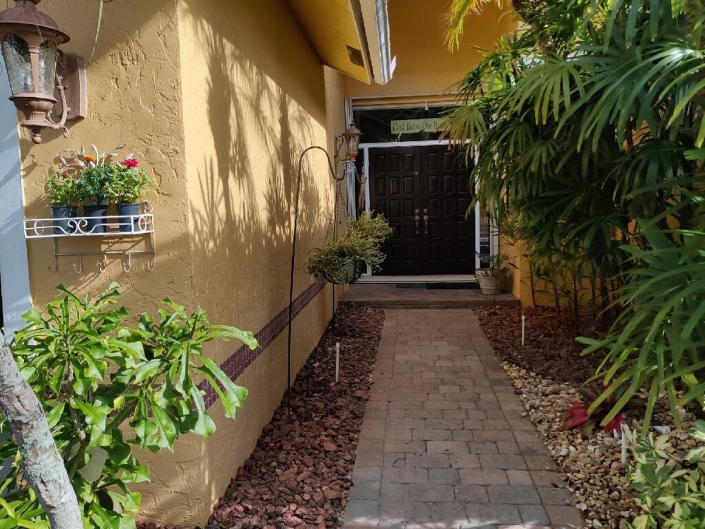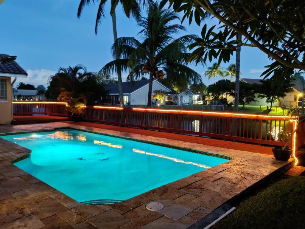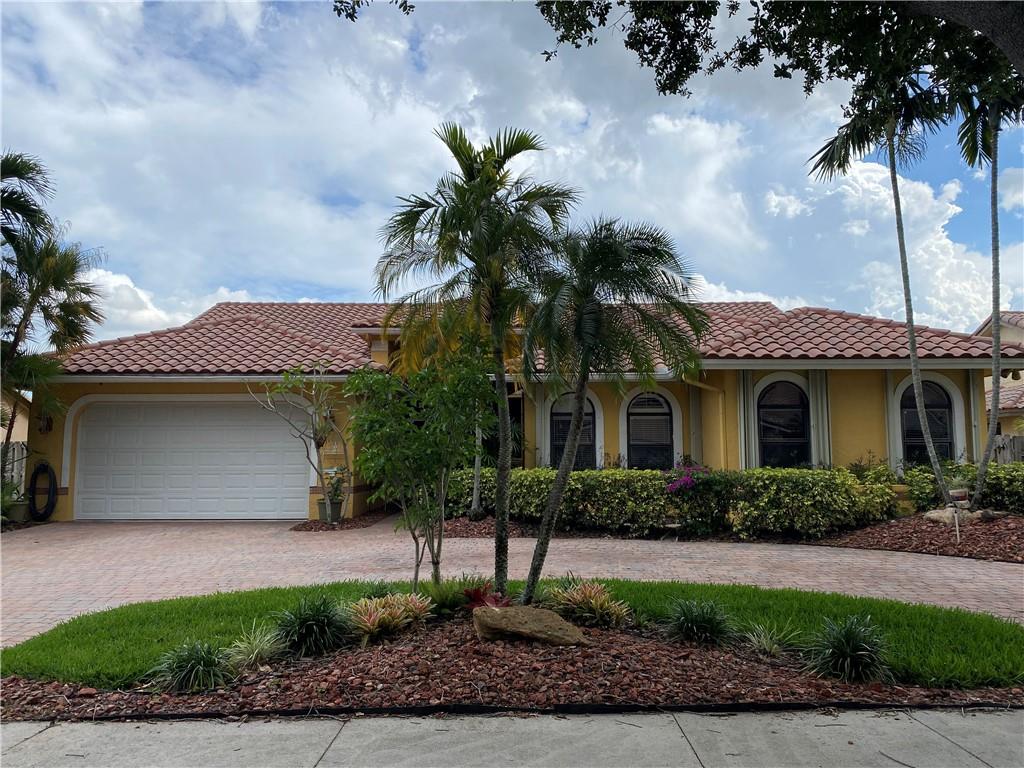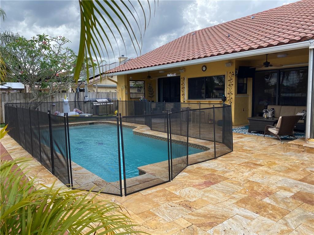 Lakefront pool home w/ BONUS 5th room. Boasting over 3,100 SQ FT under air, this waterfront pool home is nestled in sought-after Jacaranda Lakes. Split floor plan offers private, generous master suite with pool/patio access & master bath for his/hers. BONUS office/den/bedroom w/ private entrance. Three spacious bedrooms w/ updated laminate flooring (2021) & remodeled bathroom (2020). Lg family room w/ soaring ceilings, dry-bar, formal living room & open-concept kitchen w/ SS appliances & granite. Screened front door & 24x24 porcelain tile. Fenced-in yard w/ sparkling, upgraded salt-system pool; wood deck, travertine deck/patio, large lanai(s) & pool safety net. New AC & hot water heater (2022). You're safe w/ shutters & impact garage door.