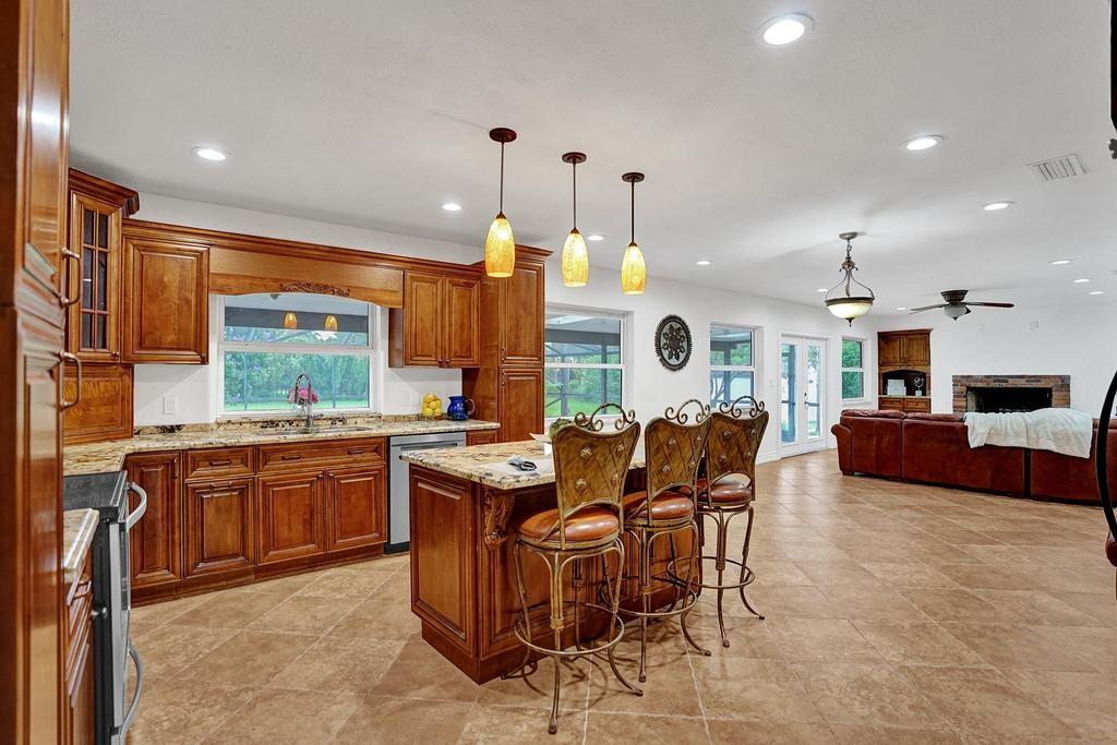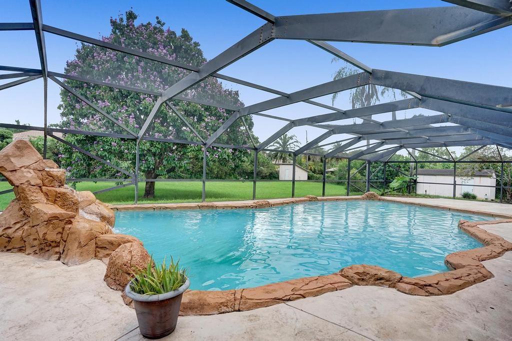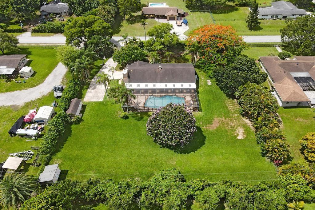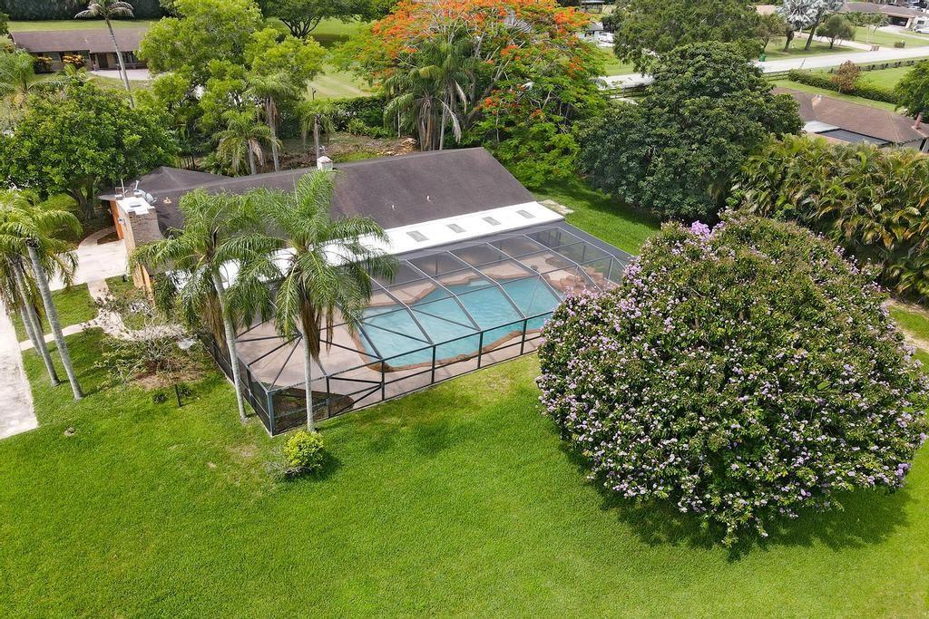 Serene 3 bedroom 2 bathroom home with a pool on a builders acre in Davie's pristine equestrian community. The home has impact windows & doors. Enjoy a luxurious spa-like cabana bathroom remodeled in 2019 with granite counters and a frameless glass door shower. A spacious updated kitchen with stainless appliances (most replaced 2021), exotic granite & wood cabinets opens to a dining area and a cozy family room with a wood burning fireplace. Entertain family & friends in the sparkling pool on a huge screened patio overlooking a gorgeous tree lined lot. Long gated driveway accommodates RV's, boats or 8-10 cars plus a 2 car garage. Located near 150 acre preserve with equestrian & nature trail & picnic area. No HOA. (A/C, Roof & screen enclo 2006). A-rated schools. Realtors read broker remarks.