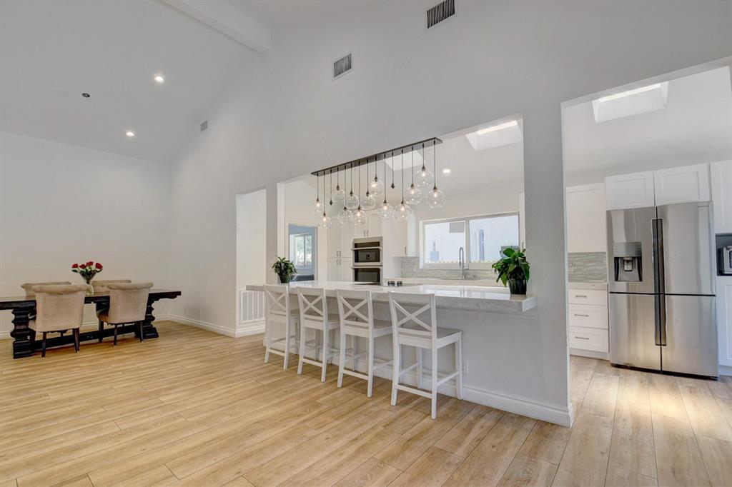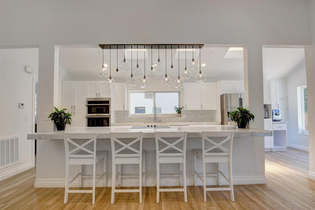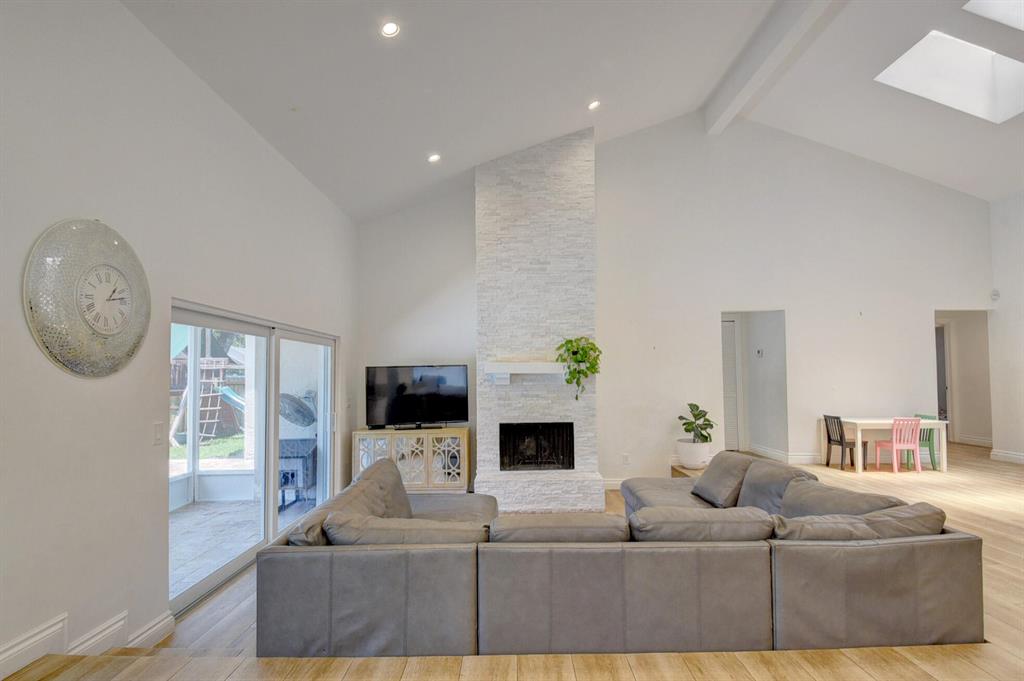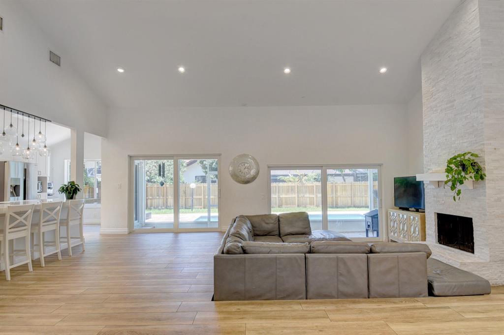 This extravagant home is located on a quiet cut-de-sac street lined with majestic oak trees in the heart of luxurious Colonnade. This home offers a soaring vaulted ceiling w/beam, wood designed tile throughout the home, a sunken family room by the floor to ceiling stone fireplace, updated ceiling fans, skylights promoting lots of natural light, an open kitchen with white shaker cabinets, newer stainless steel appliances, massive deep sink, marble countertops with a designer glass backsplash and breakfast dining over looking the pool. A large bar area for casual dining, All new impact windows and doors, all newly renovated bathrooms. The master suite offers a vaulted ceiling, large step down marble shower, extended dual sink vanity and cabana access to the poo