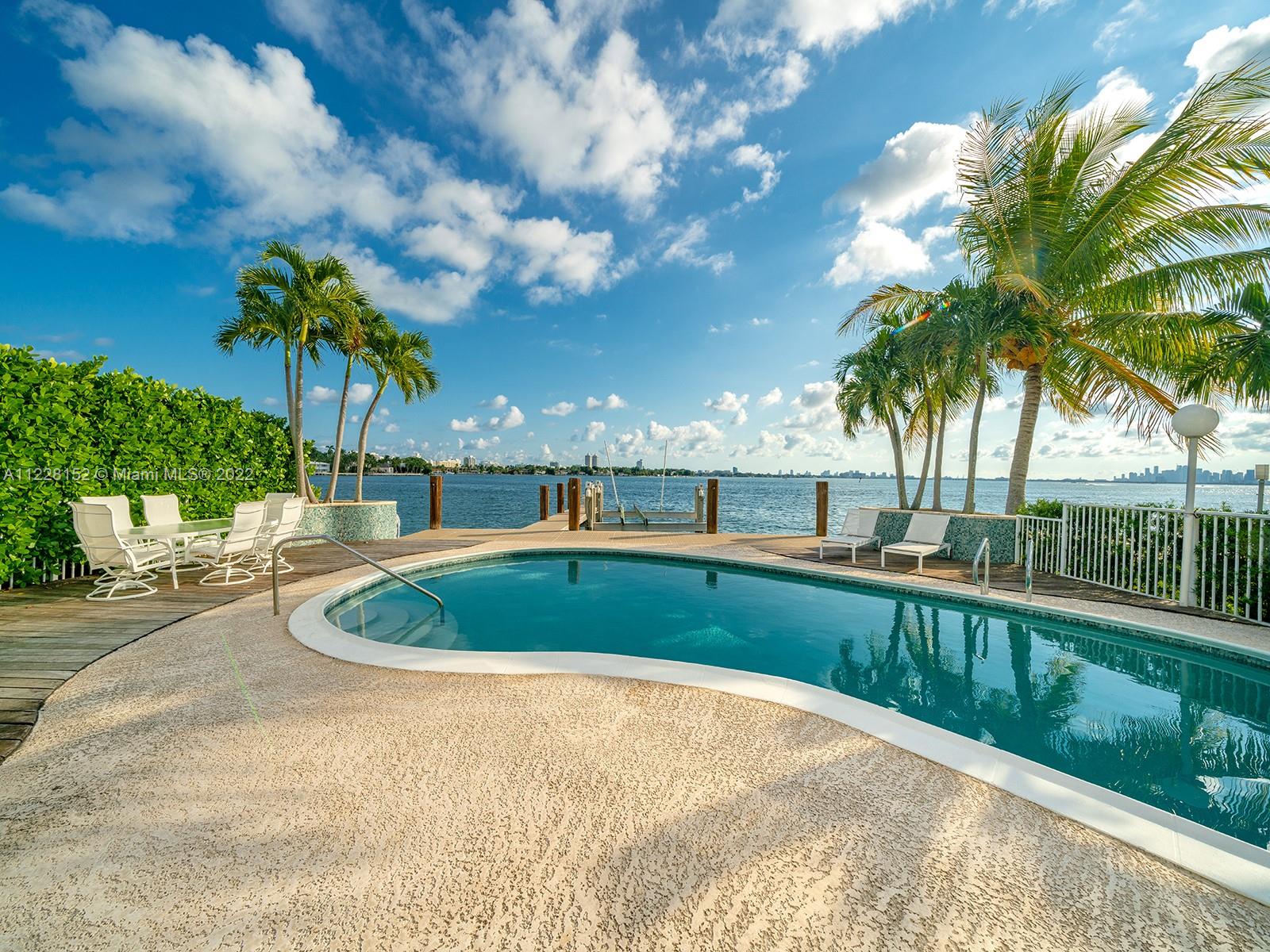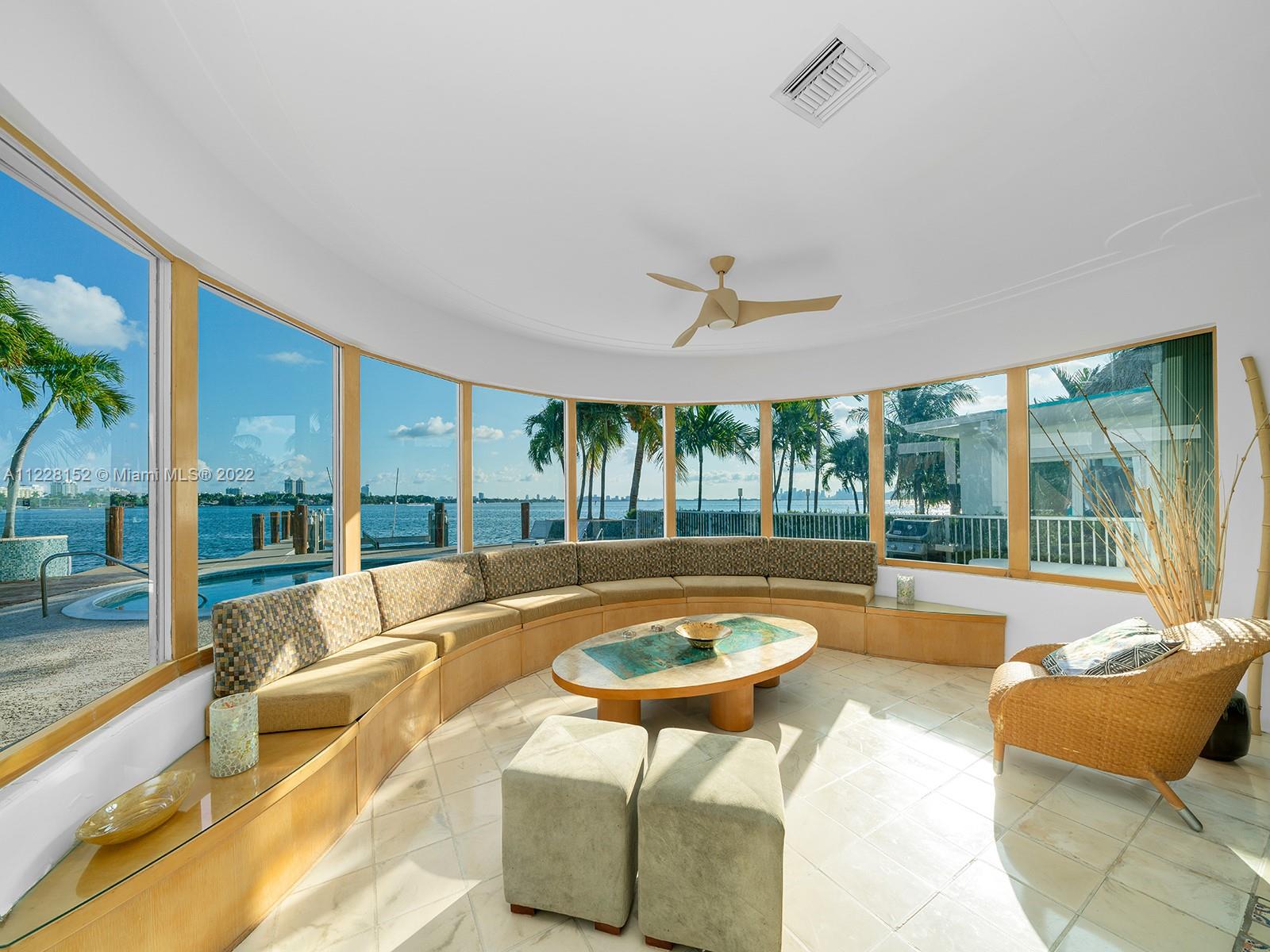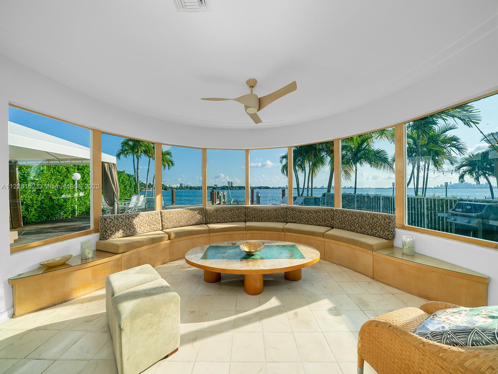 Rare opportunity to acquire Miami Beach home with unobstructed, panoramic wide bay view of Biscayne Bay, South Beach, Downtown Miami skyline, Port of Miami, and North Bay Road estates with coveted southern sunrise to sunset exposure. Permitted private, full service (electric and fresh water) dock with 30,000 pound boatlift. Ocean access, no fixed bridges. Large 8 ft depth pool with iconic diving board. Entry features double, LCD glass French doors with spectacular water view the moment you enter. Inviting, bright open floor plan with 9 ft ceilings, Impressive foyer, modern kitchen with wine cooler, quartz counters. 3 BR/3 BA plus flex room with closet, and laundry room. Sunroom, family room, dining room, Ipe deck, Cabana, and 2 car attached garage plus 6 car parking on circular driveway.