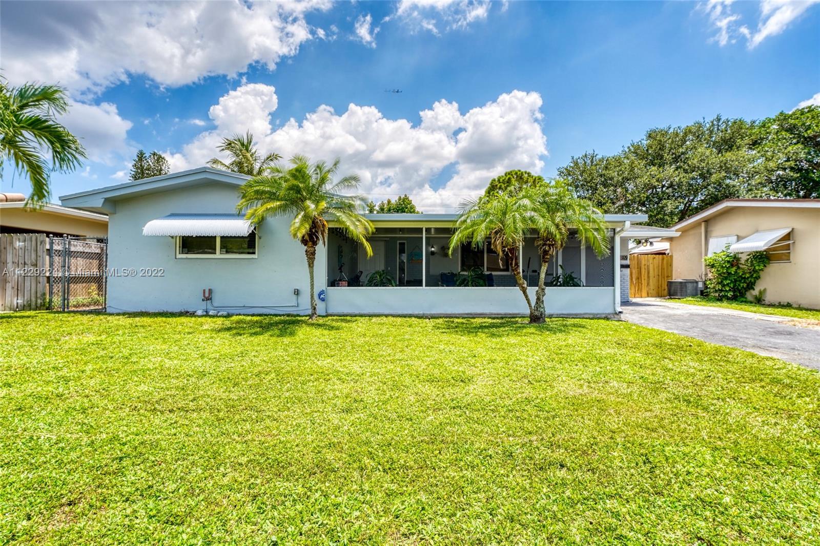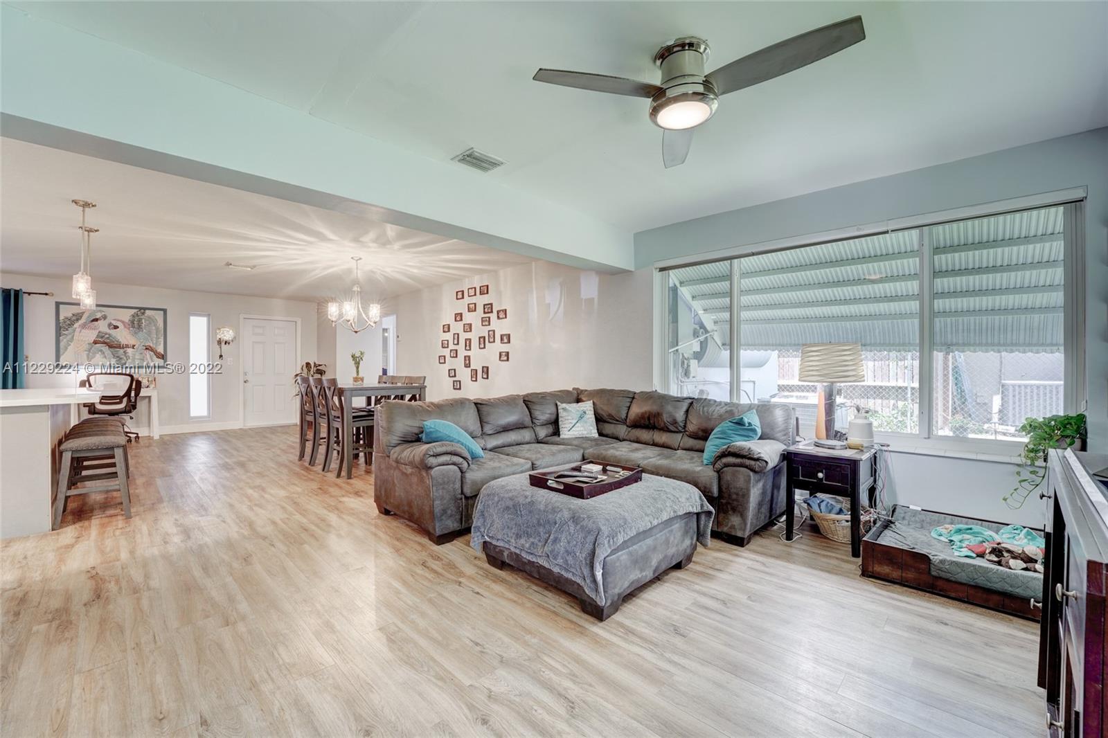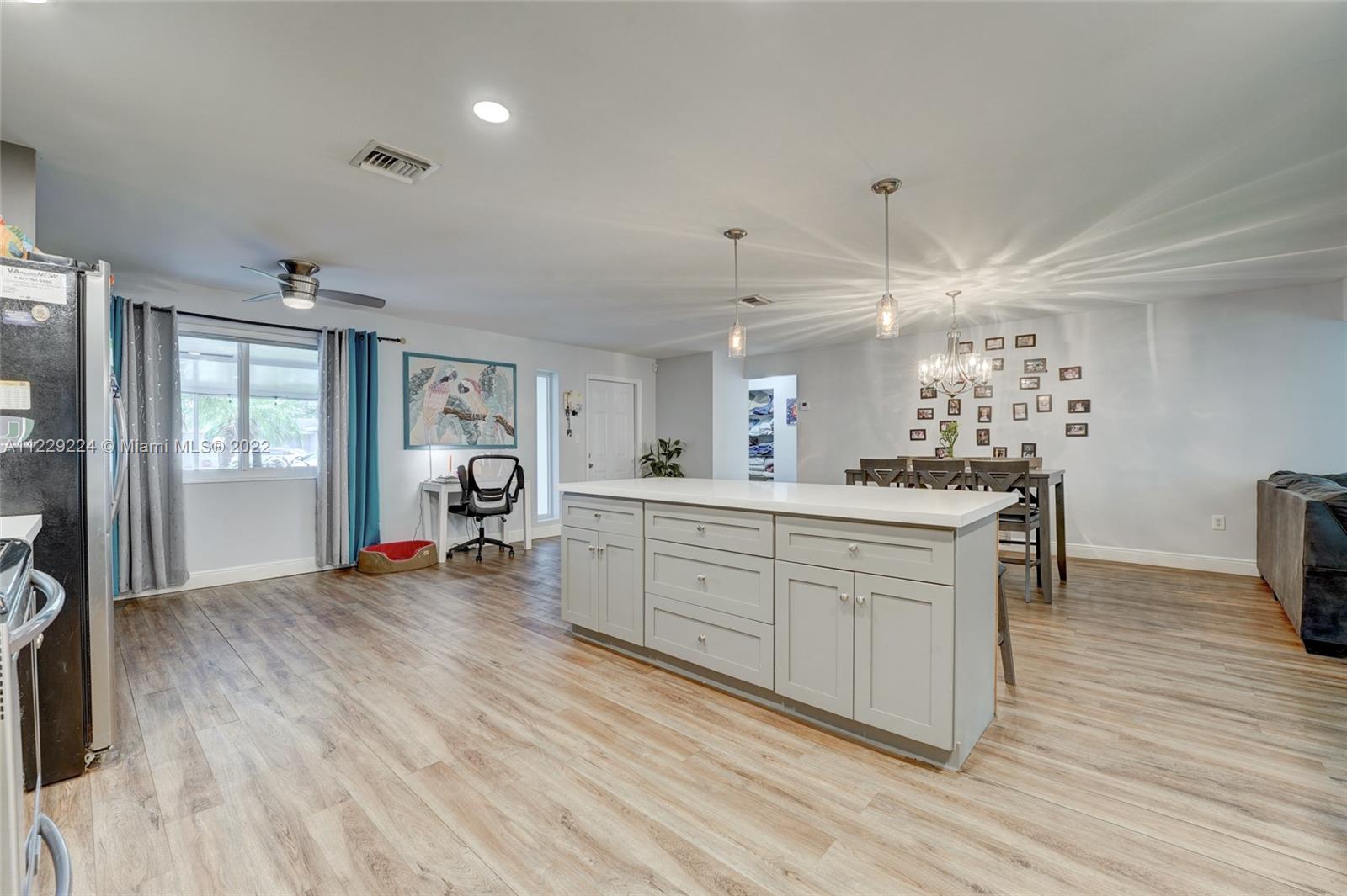1400 sqft of open concept living space in this beautifully remodeled 2/2 plus an enclosed Florida room that is being used as huge 3rd bedroom. Amazing updated kitchen featuring huge center island with quartz countertops, soft closed drawers, wood cabinets and s/s appliances which is the centerpiece of the house. Neutral vinyl flooring throughout. 90% of the home is impact windows except for the enclosed family room. Huge fence in yard with plenty of room for a pool. Large front screened in enclosure. No HOA. AS IS. Can rent right away.