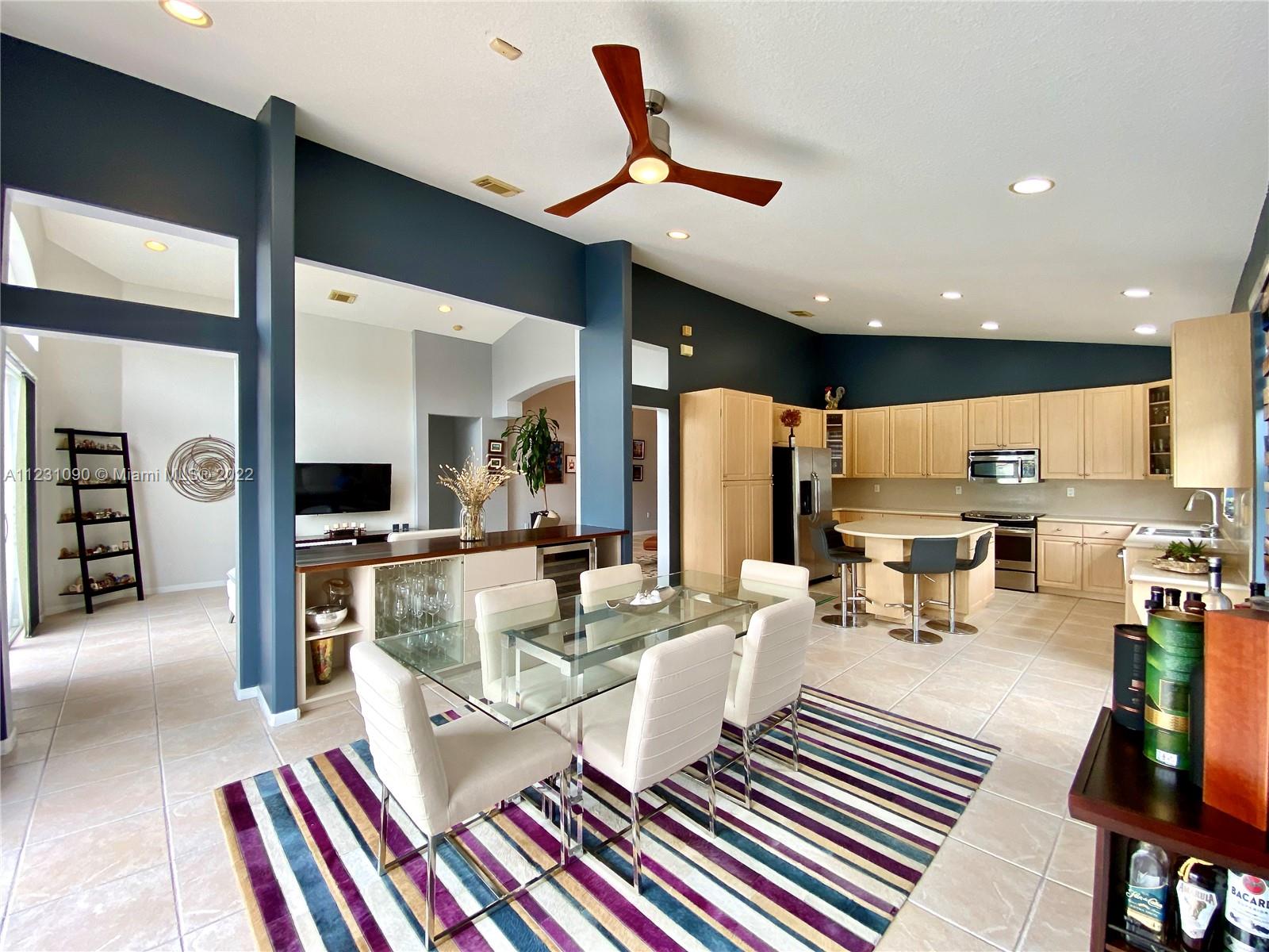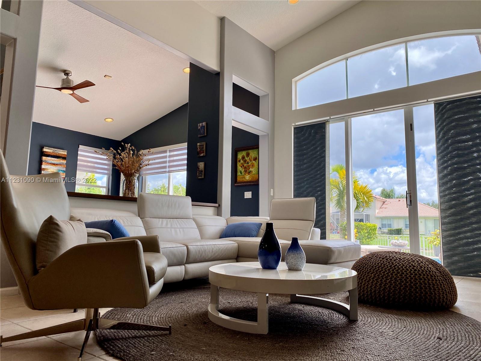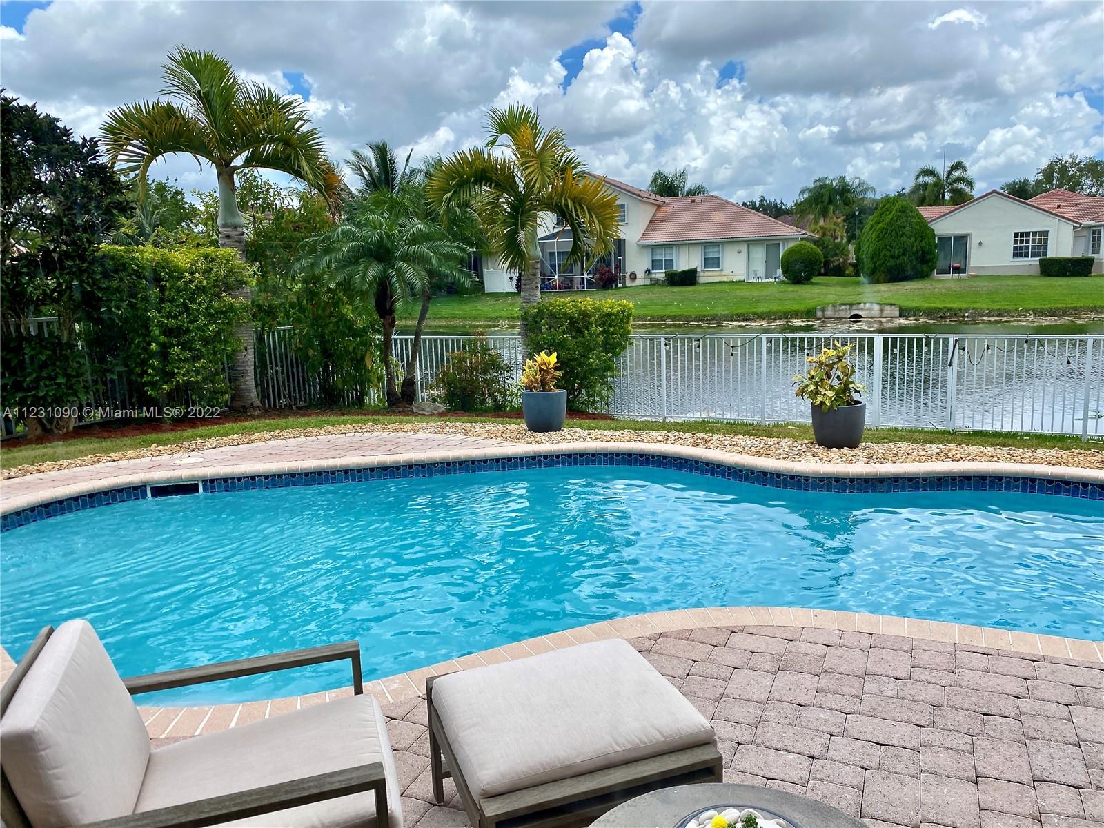 Fabulous ONE STORY 4-Bedroom 3-Bathroom LAKEFRONT home. Peaceful lakeview to enjoy and relax in a recently renovated pool. Plenty of natural light throughout the home, located in the resort style and prestige gated community of Sunset Lakes. Stunning Clubhouse with recently renovated and expanded gym and plenty of amenities. Close to great schools. Tile flooring, cathedral ceiling, spacious master bedroom. Open concept eat-in kitchen with island, lots of space, and great for entertaining. Built-in wine cooler and cabinet area in dining room that opens to living room for modern looking OPEN FLOOR PLAN. Energy efficient central air system replaced in the last 5 years. Some furniture available for sale. Call listing agent for appointment!