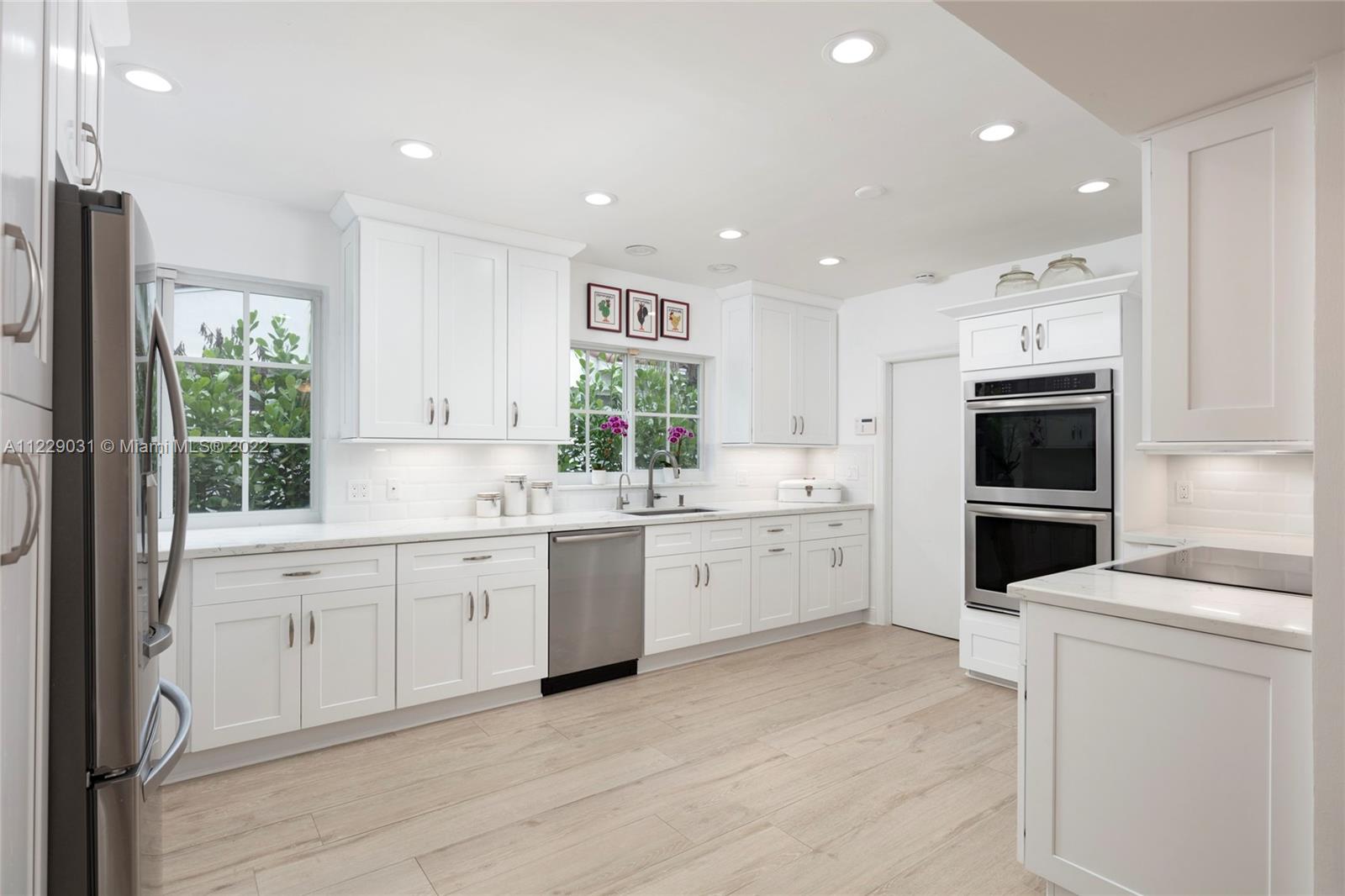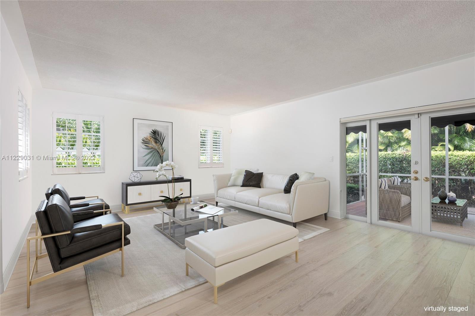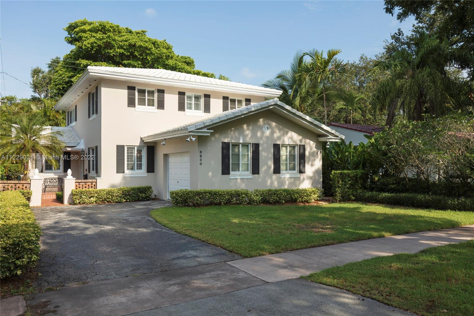 A special opportunity to live in the desirable South Gables on a tree-lined street within the Sunset Elementary school zone. Step through a charming, walled courtyard into this warm and completely renovated home. Downstairs offers a foyer entry, well-appointed kitchen, formal dining room, bedroom or den with adjacent full bath, and living room with French doors to the covered terrace and private garden. Upstairs are three generously sized bedrooms with the primary suite featuring two walk-in closets and renovated bathroom. Wood-look porcelain floors, plantation shutters, fresh white paint, and neutral finishes make this home the perfect canvas for your design. New roof, electrical, plumbing and septic tank. All impact windows and doors. **Some photos virtually staged.