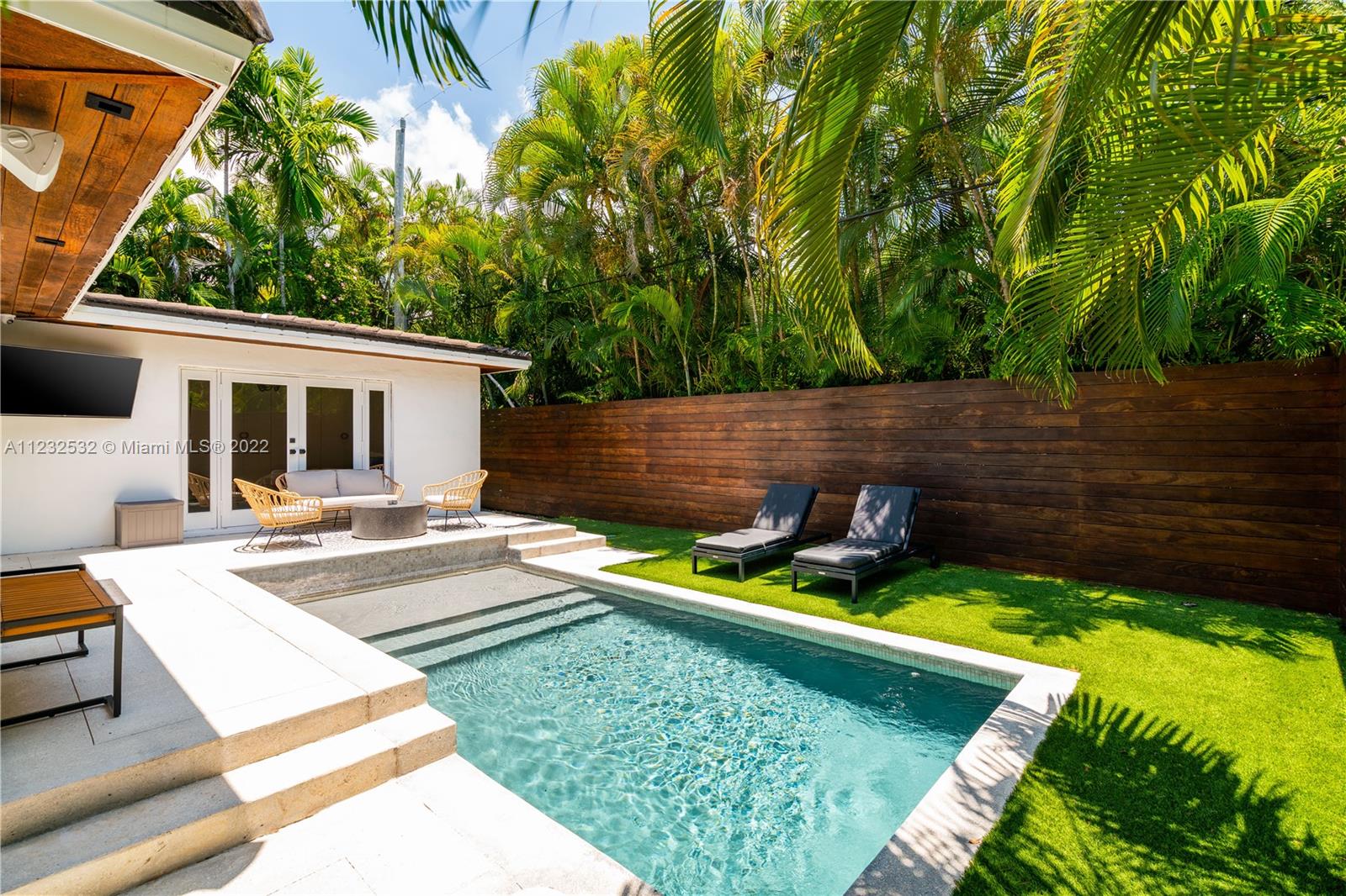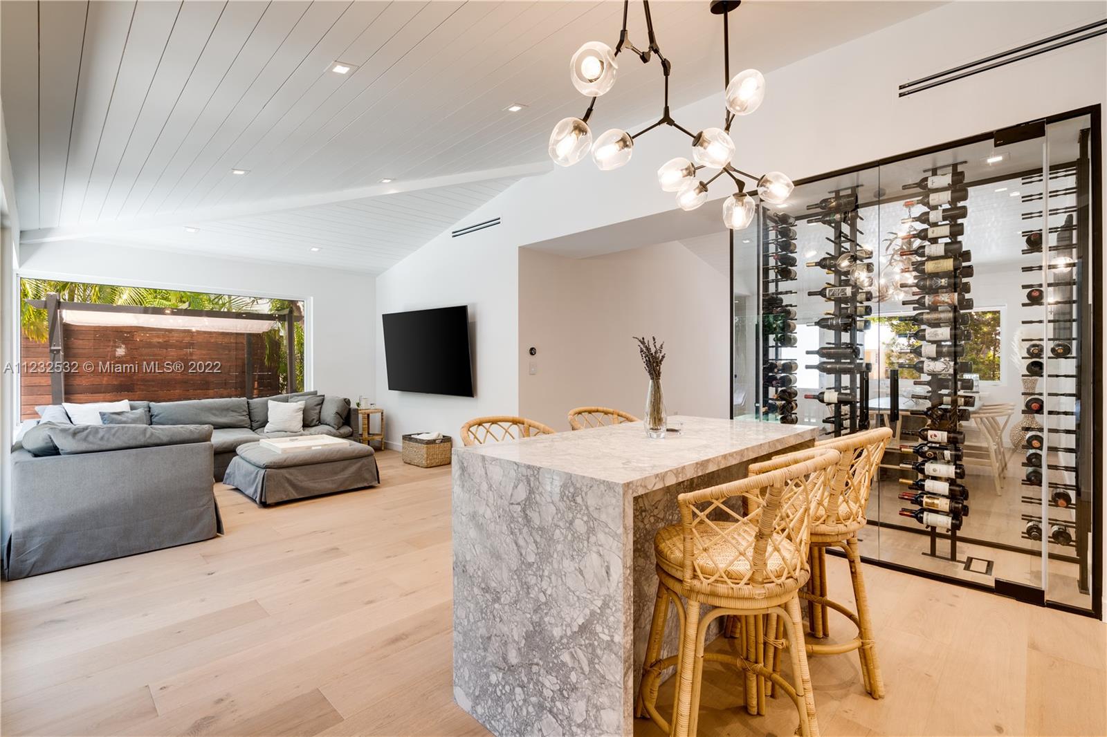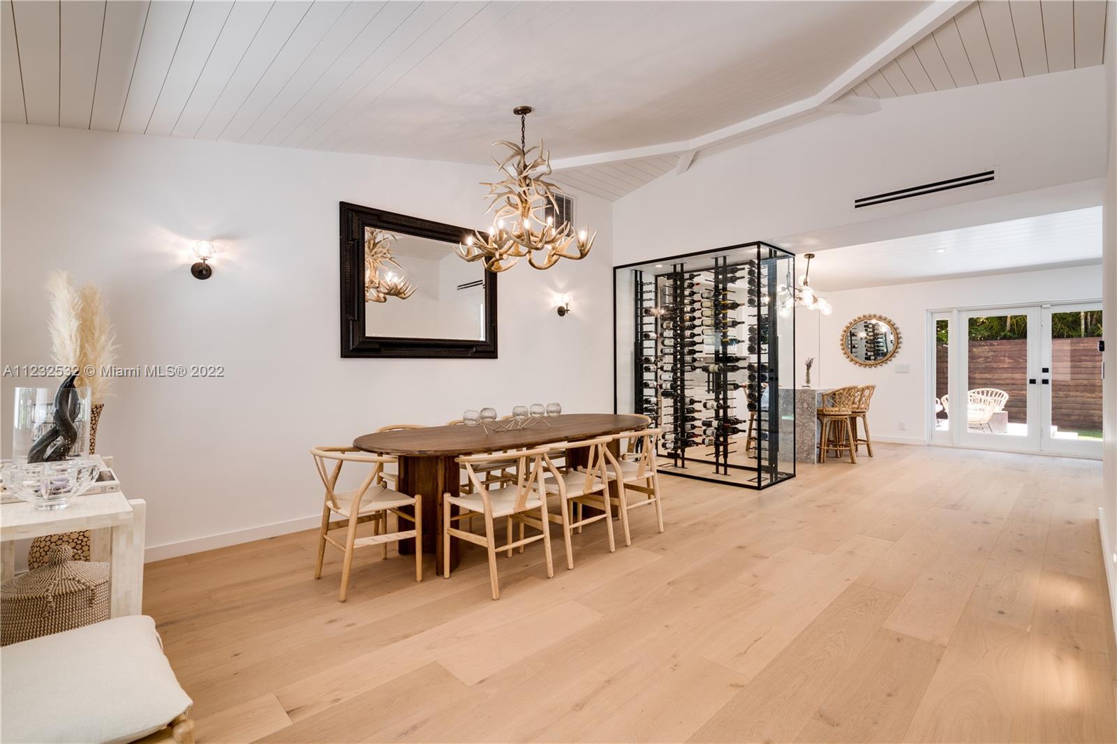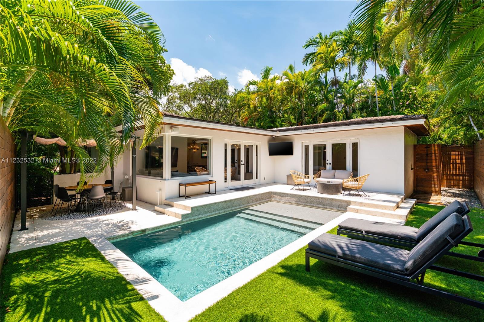 Hidden Treasure in Coral Gables! Completely renovated in 2021, this 3 bedroom, 2 bathroom home rests on quiet Michelangelo Street. Welcomed by lush landscaping, and brick driveway leading into 1-car garage. Spacious formal dining area, eat-in kitchen with custom quartzite countertops, and glass-enclosed wine bottle storage highlights the main living areas. Vaulted tongue and groove ceilings, hardwood flooring throughout the bedrooms, and sleek-modern designed master bath with dual sinks. Cumaru hardwood fence encompasses the backyard with outdoor shower, pool, polished concrete deck and artificial turf.