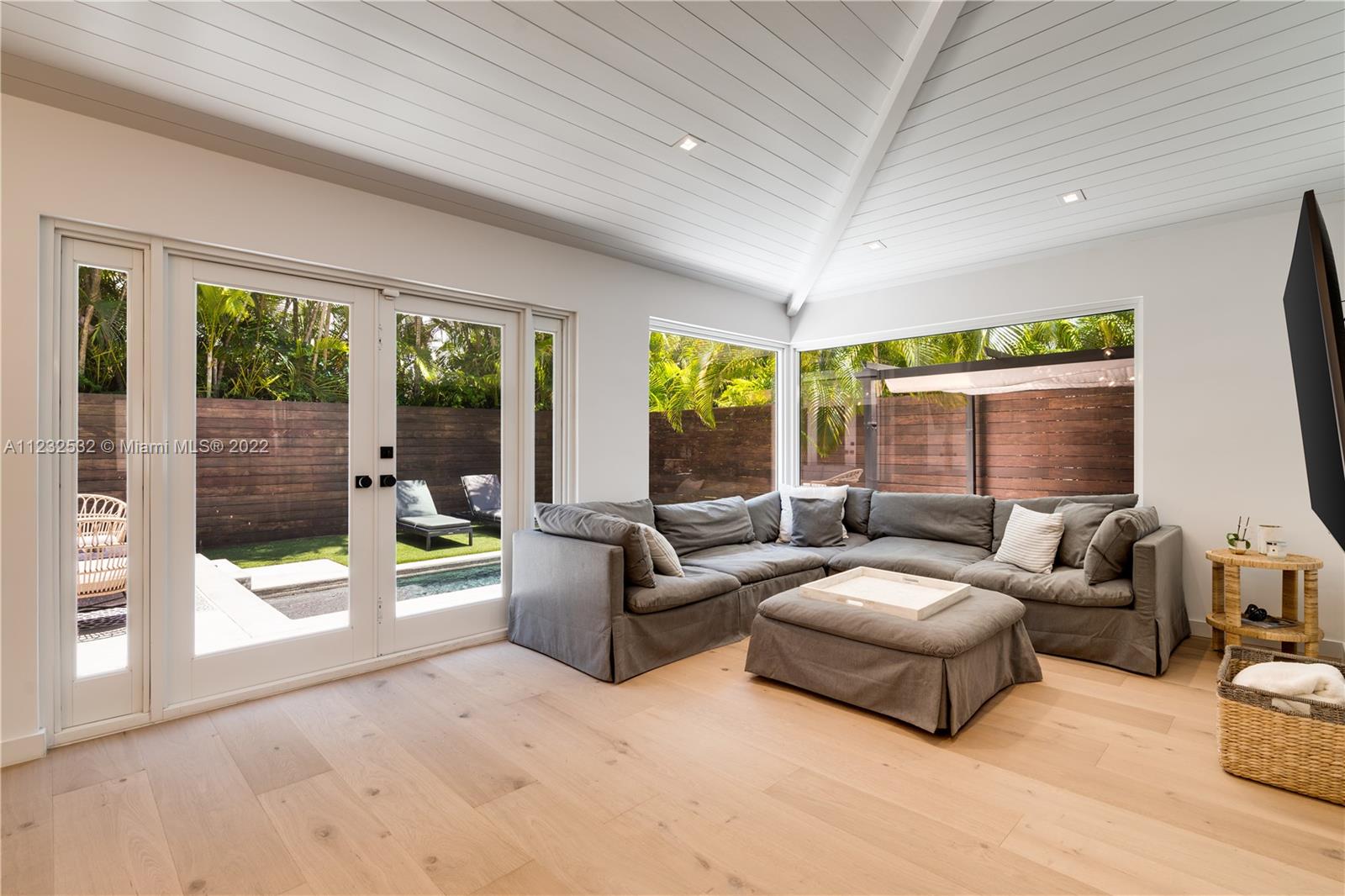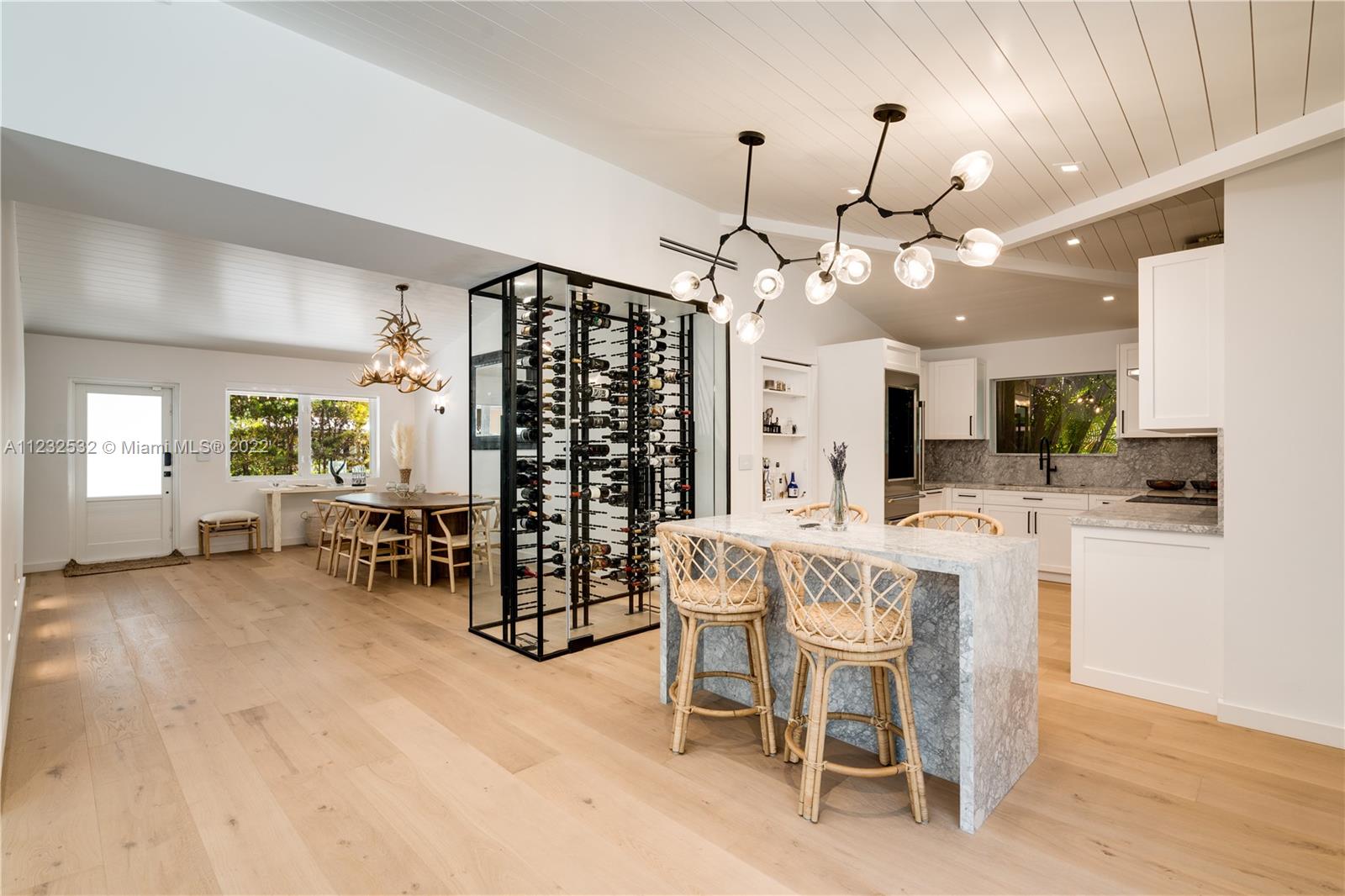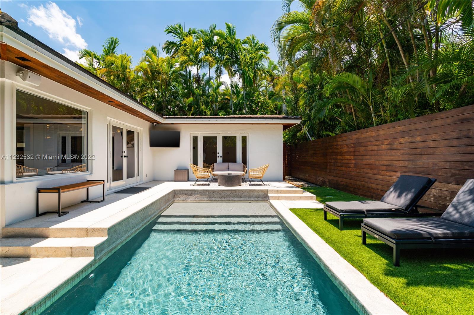 Hidden Treasure in Coral Gables! Completely renovated in 2021, this 3 bedroom, 2 bathroom home rests on quiet Michelangelo Street. Welcomed by lush landscaping, and brick driveway leading into 1-car garage. Spacious formal dining area, eat-in kitchen with custom quartzite countertops, and glass-enclosed wine bottle storage highlights the main living areas. Vaulted tongue and groove ceilings, hardwood flooring throughout the bedrooms, and sleek-modern designed master bath with dual sinks. Cumaru hardwood fence encompasses the backyard with outdoor shower, pool, polished concrete deck and artificial turf.