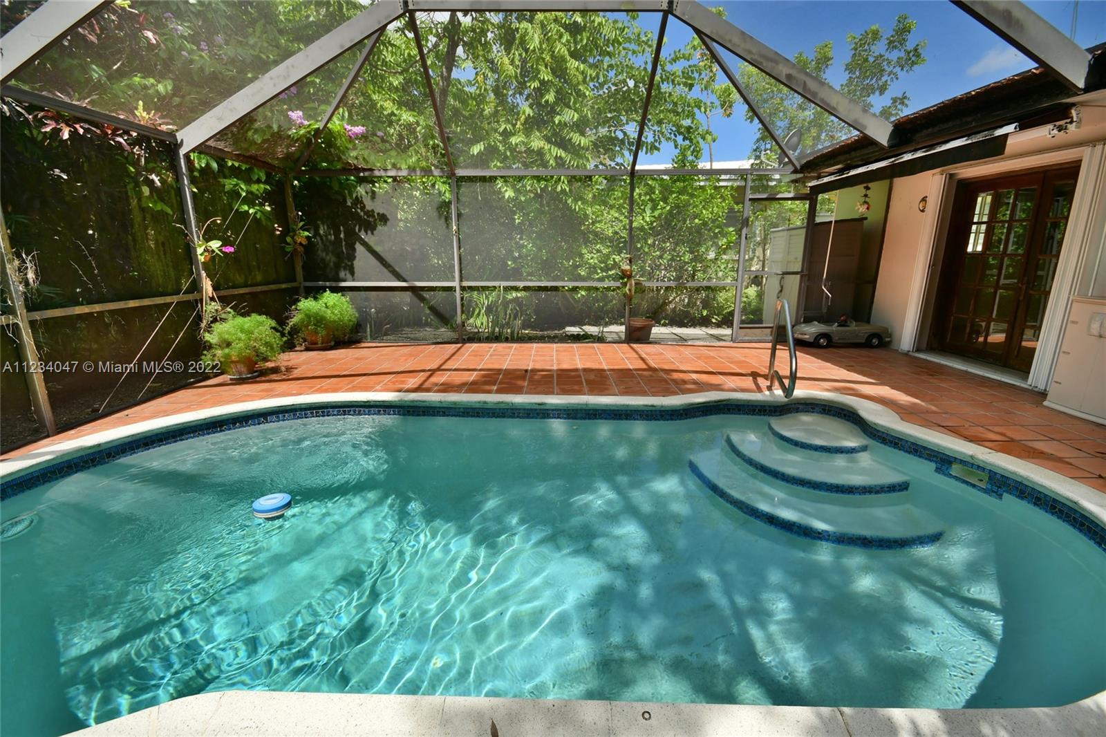Beautiful Cozy Gables Home in an excellent area - 2/2 with Dining Room, Family Room with French Doors leading to a beautiful Screened Pool Patio Area - Kitchen with stainless steel appliances - Newer Bathrooms - Master with a big walk in closet - Shutters throughout - Tile Roof - 1 car garage - Sprinkler System - Alarm system and much more. OPEN HOUSE: SEE BROKER'S REMARKS