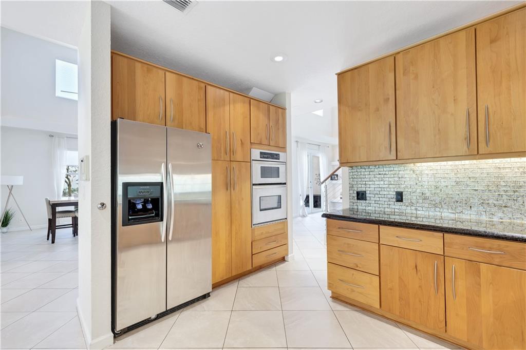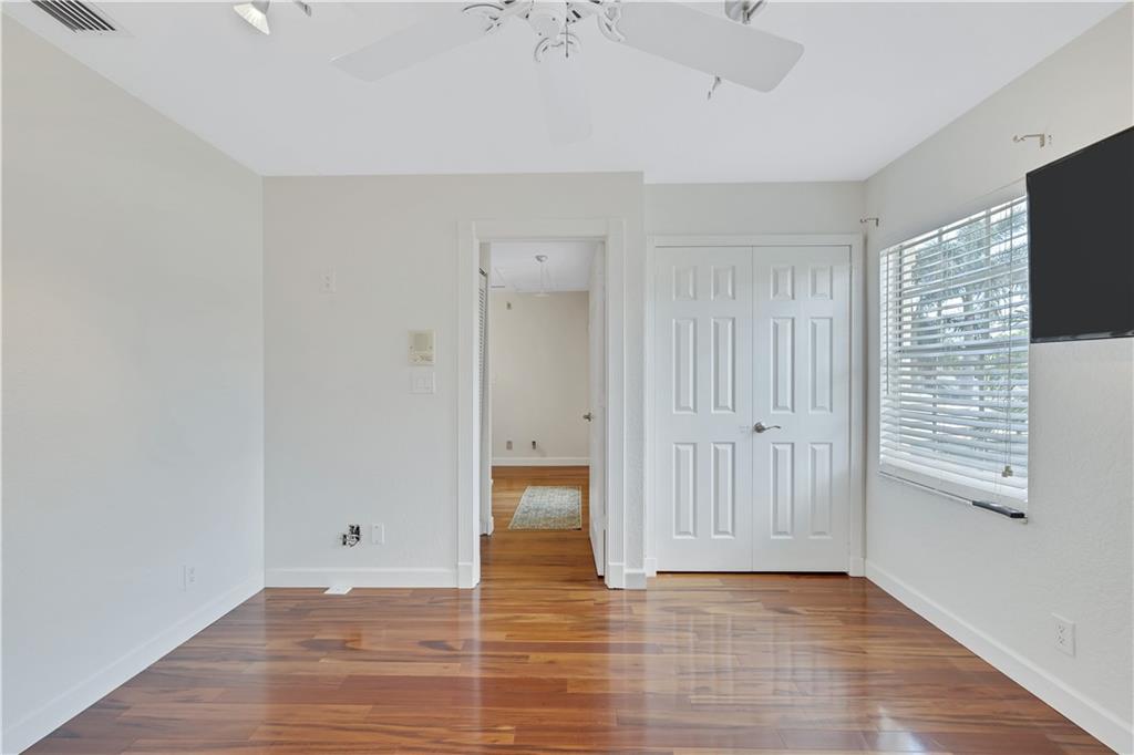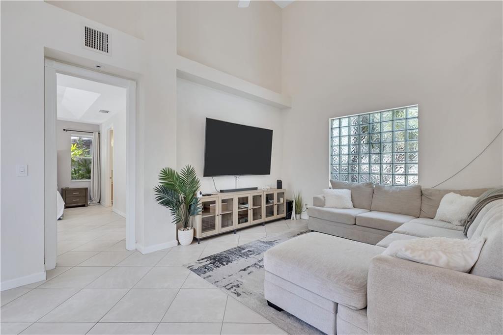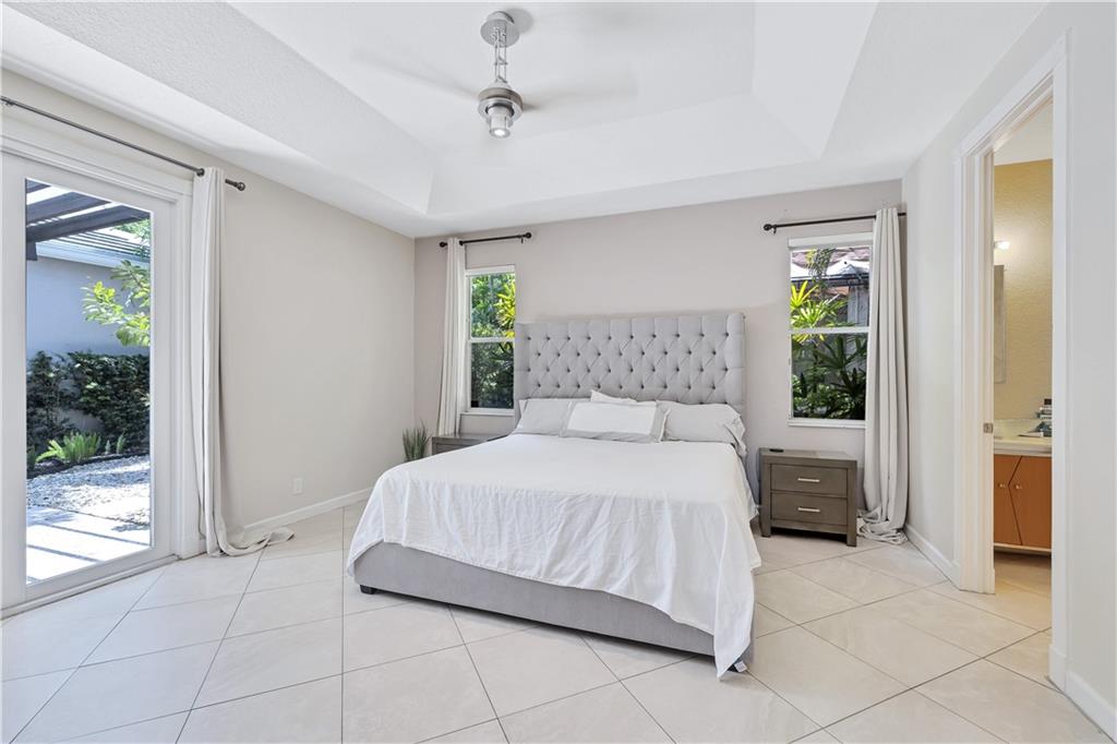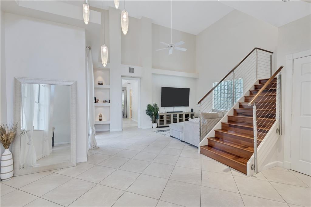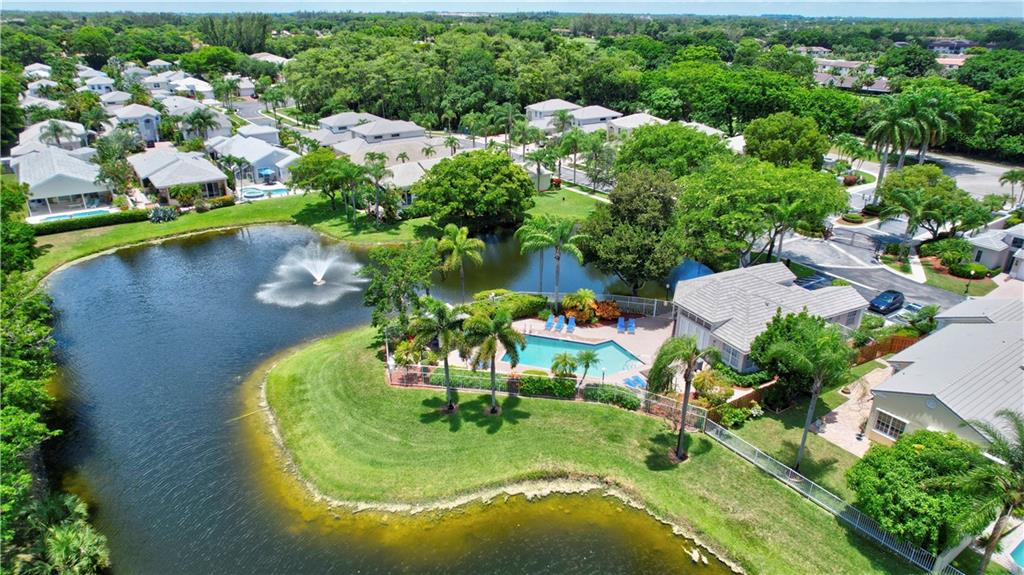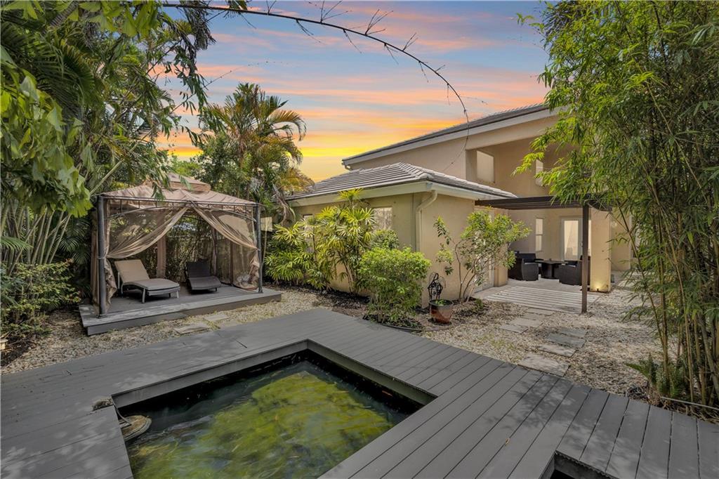 One of the best layouts I've seen in awhile. Walk into extremely high & open ceilings w/modern touches everywhere. The unique & stylish wire stair railing carries up to the 2nd floor walkway that leads you to the 2 secondary bedrms, 2nd bath, & balcony. Downstairs features a breakfast nook, formal dining, living room, & the primary suite. The primary suite's French doors open to a private zen like deck w/a relaxing fountain, gazebo & Koi Pond. The community features a gate, workout room, & pool while being located in great school districts, less than 7 miles from the beach, a quick hop on the turnpike to take you anywhere and it's low on the crime index map. **IMPROVED PRICE. NEW ROOF** Welcome home & stay friendly!