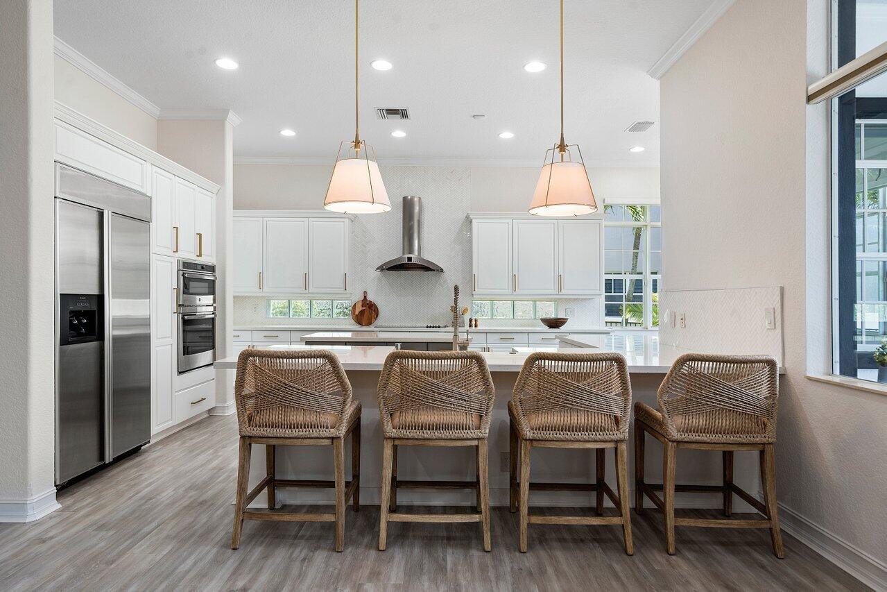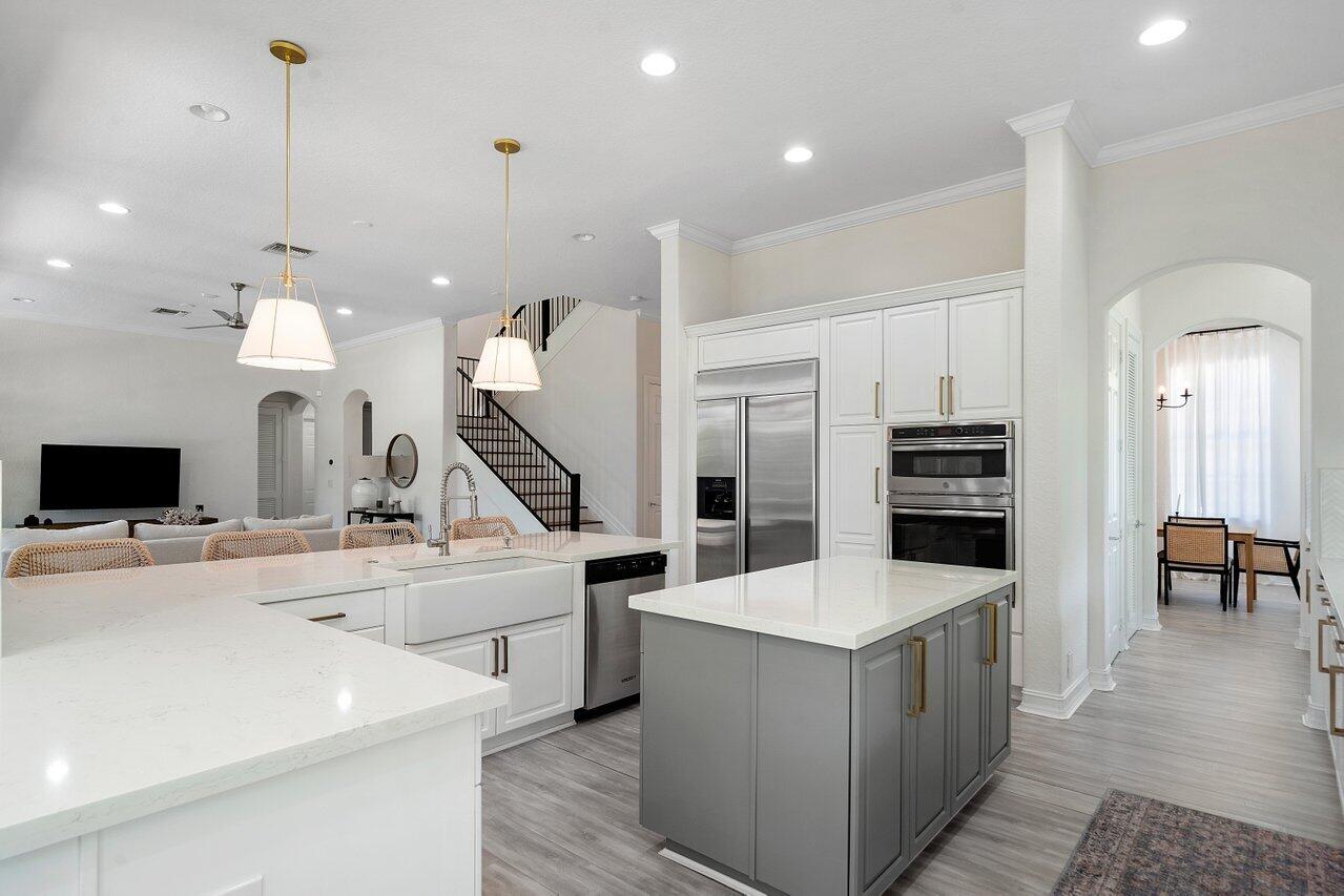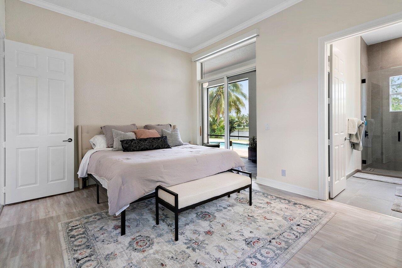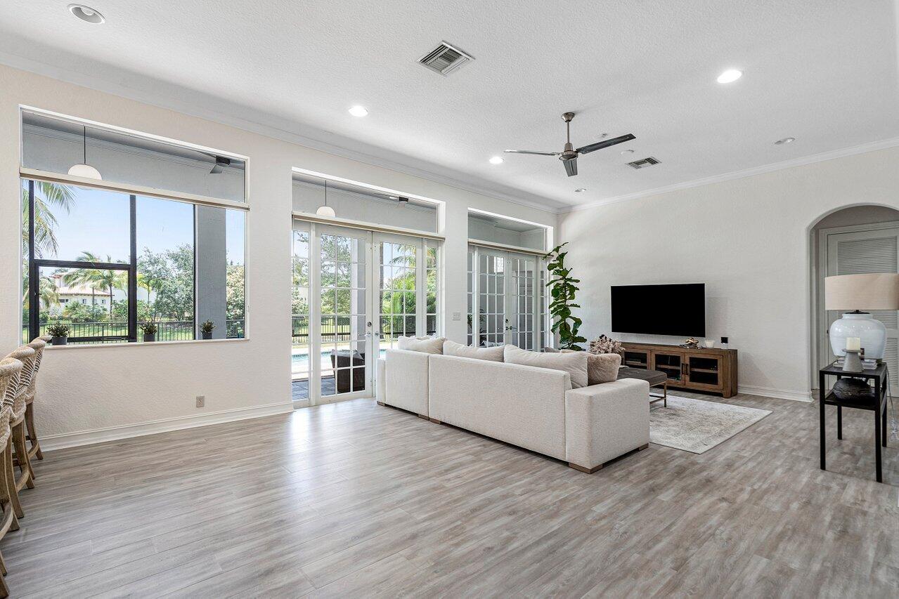 This gorgeous, upgraded lakefront pool home is situated on a 0.37 acre lot with huge side yards. 5 bedrooms, 4.5 bathrooms and 3 garages, (one two car and one one car) with long driveways and many other great features included. Sizeable custom white open modern kitchen complete with butler's pantry and eat-in dining. A heated pool surrounded by lake views and lush landscaping and a screened in patio makes for enjoyable outdoor living. The main level also offers a large family room, formal living area and formal dining room, wet bar, mud room, and a junior suite with a fully remodeled bath. On the upper level you'll find a generously sized owner's suite with sitting room, dual walk in closets and balcony access with pool and lake views. Laundry room with extra storage is upstairs.