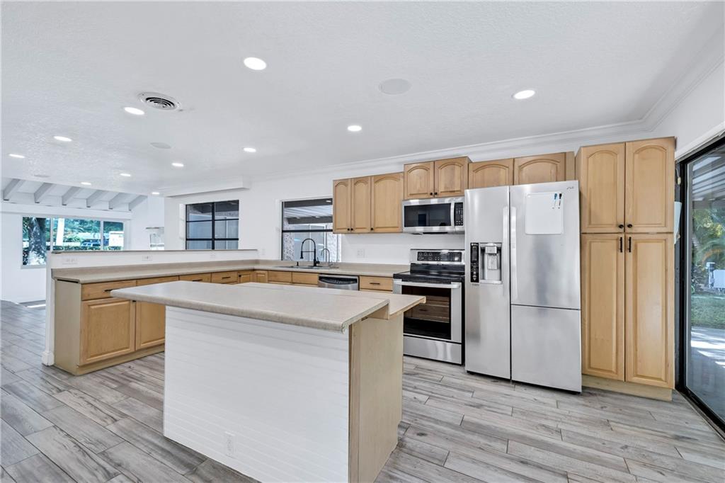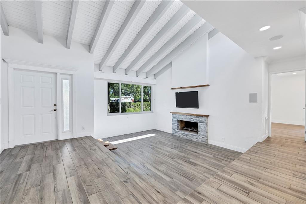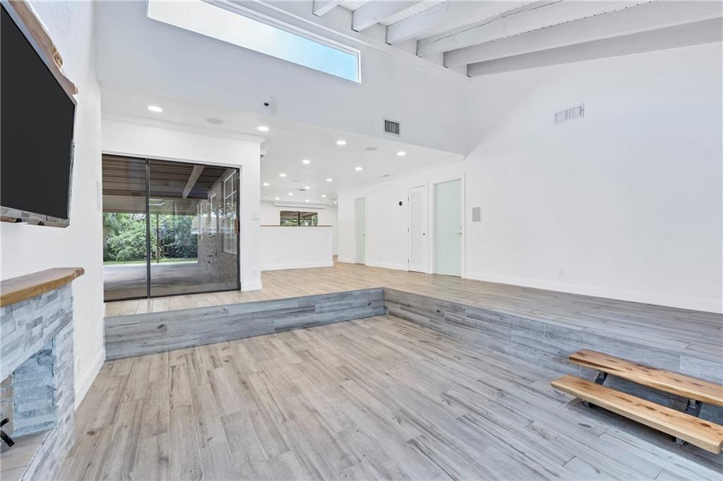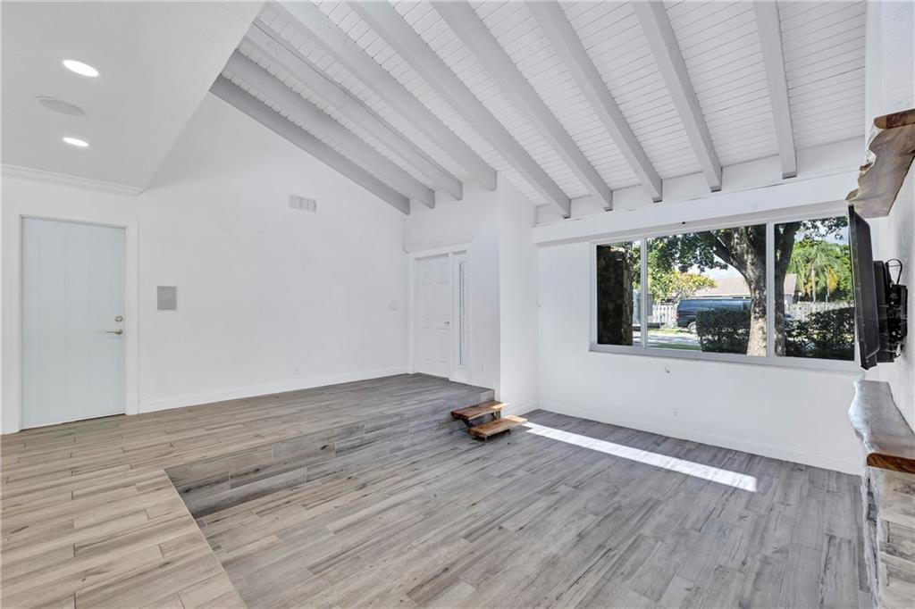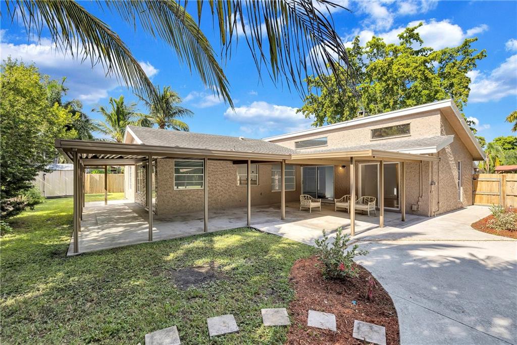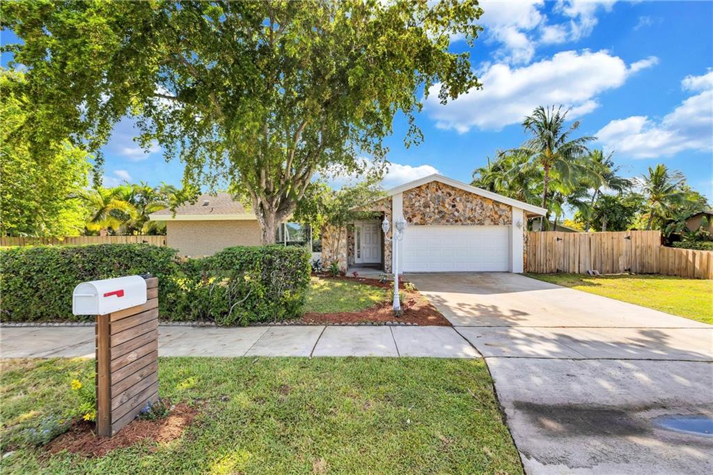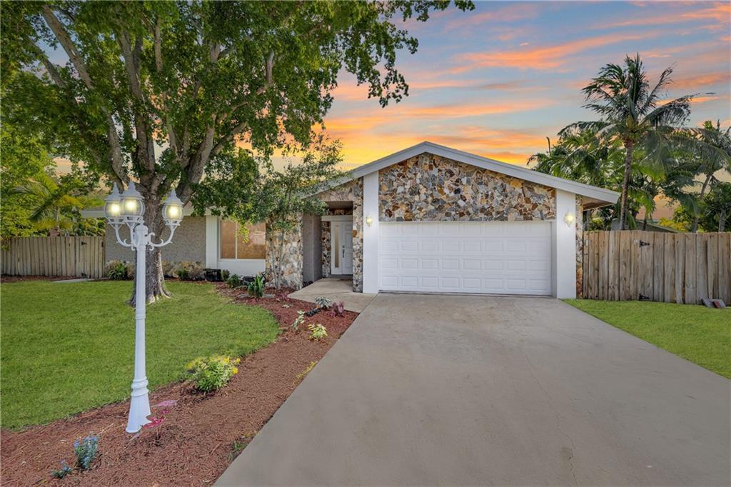 Sitting proudly on an oversized lot, right on the corner of a cul-de-sac, this stunning home is located in the sought after community of Palm Aire Gardens. This unique 3/2 home offers a spacious living area with large windows many upgrades throughout the home making it perfect for entertaining guests. The sunken living room with beautiful fireplace & custom stone wall will be the center of attention for your friends & family. Updates include new tile throughout the primary & main living area, spacious kitchen w/ island, new landscaping & much more! A clean, covered patio leads to a beautiful saltwater pool & spa! Did I mention the yard? This oversized lot and yard could fit a camper or a boat for a morning out on the water with friends. Garage was renovated & fitted to be a workshop.