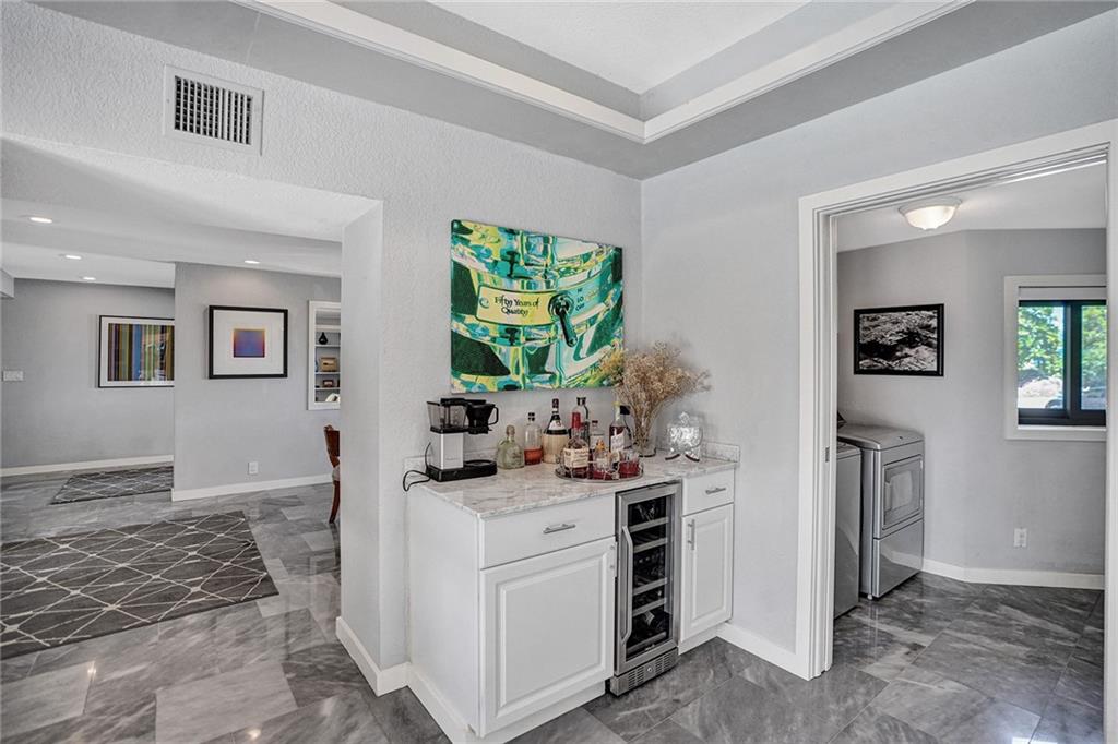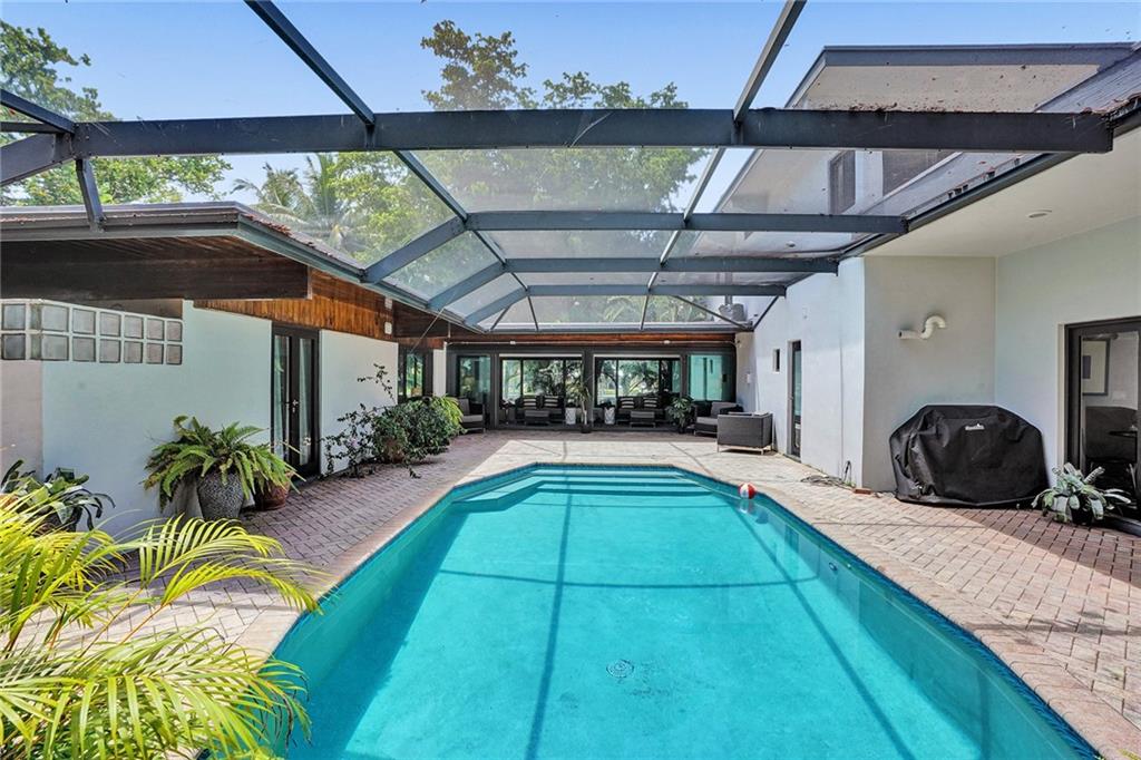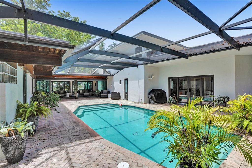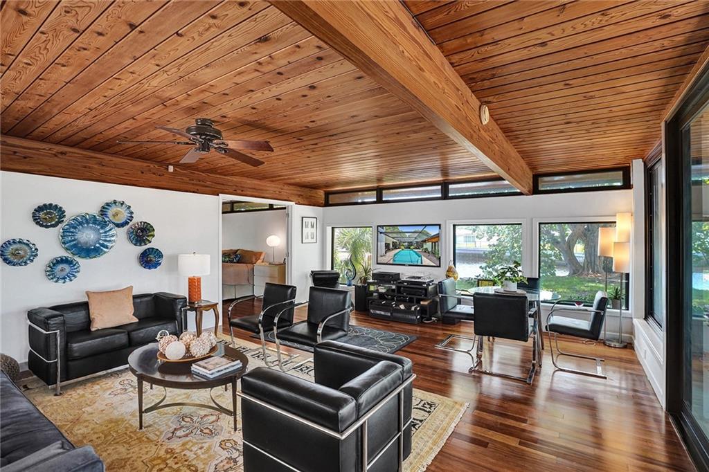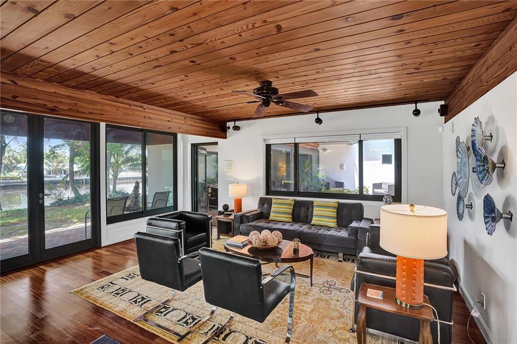 Welcome to this special waterfront oasis. The massive 16,000 sq foot lot operates closer to 20,000 when factoring in land easements and sits at the end of a quiet Cul-de-sac. Almost 450' of waterfrontage. This house has a very mid-century feel. Large 4BR/3.5 bath home with 3576 sq feet under air and massive 600+ sq foot garage. All impact glass. 3 new baths. New marble floors. Newer 10,000LB boat lift. Wide water views from multiple vantage points. An incredible combination of views and privacy. Immense tree canopy. The downstairs wing has a family room and large ensuite bedroom..this wing has its own Air conditioner and can easily convert to a massive master suite..currently makes an ideal "mother in law" or massive home office. Great set up for RV parking.