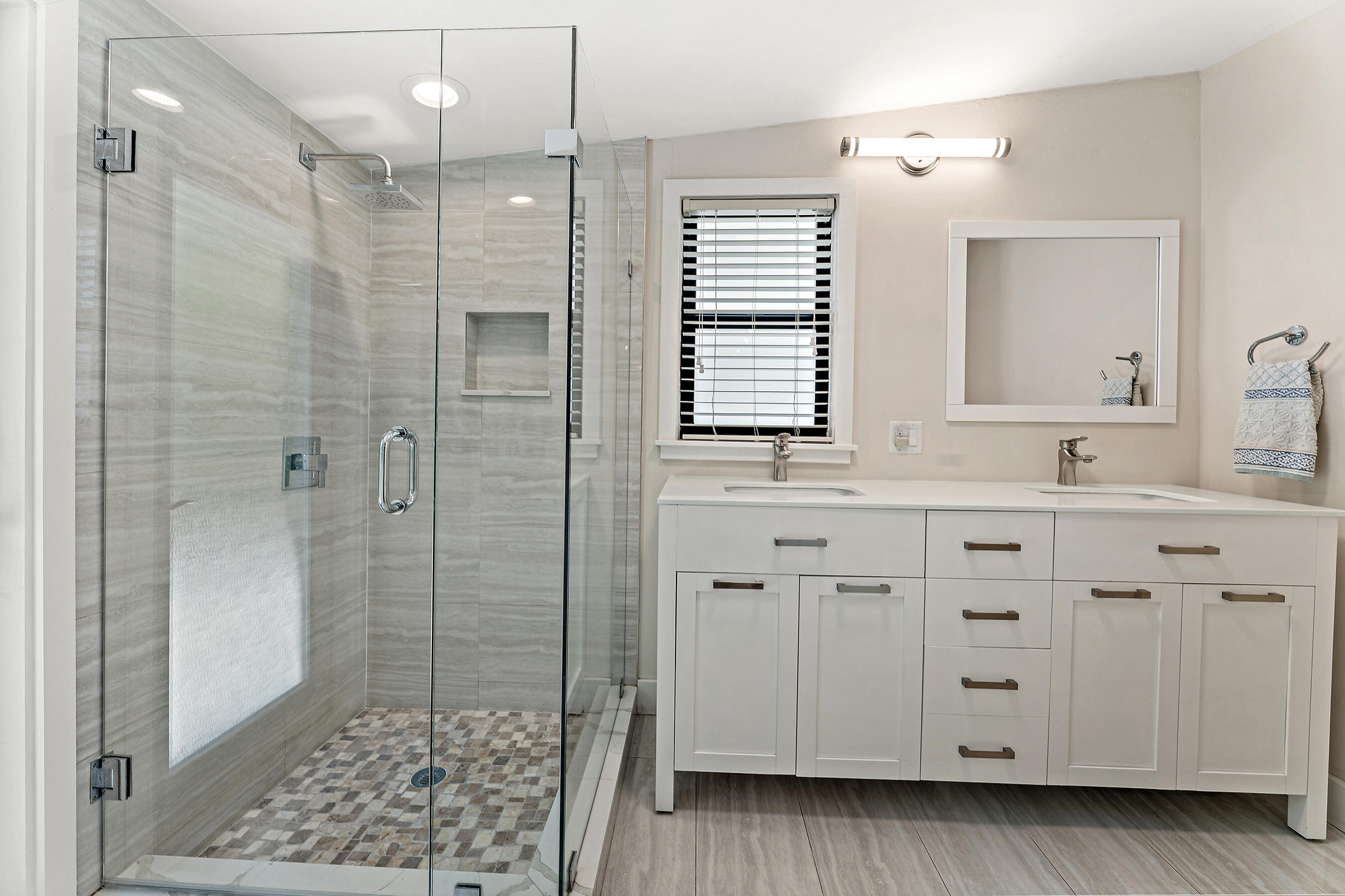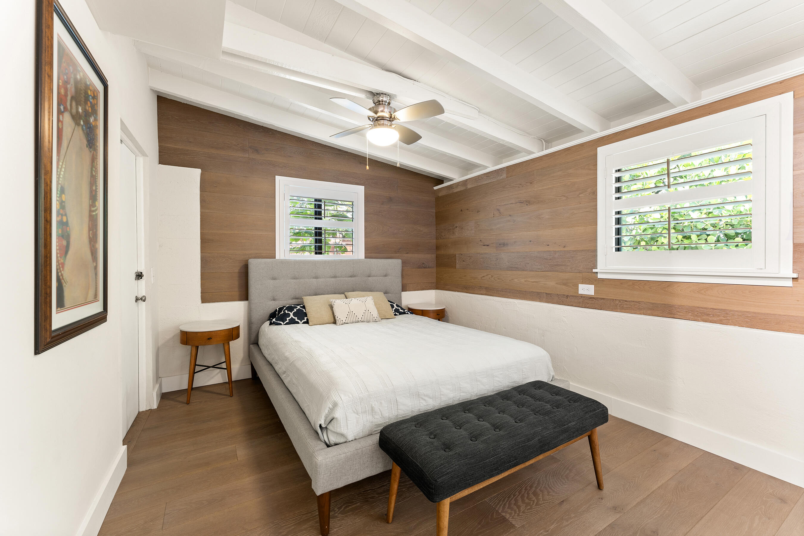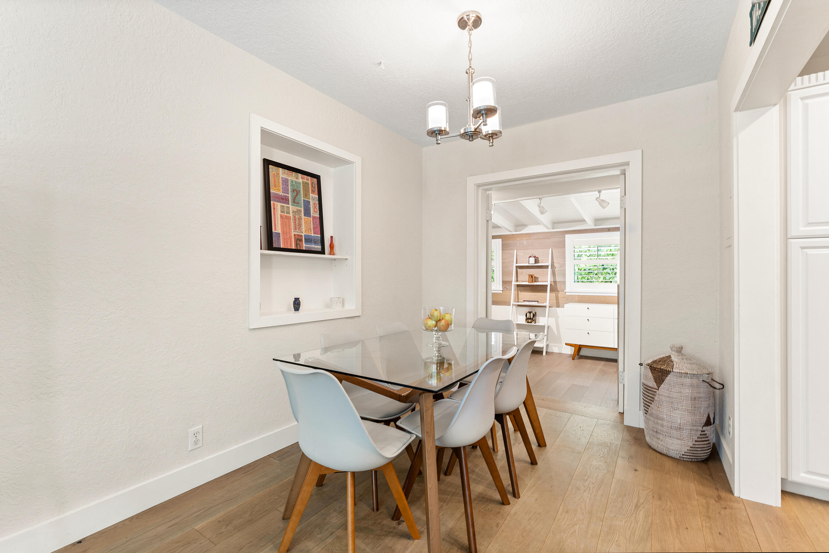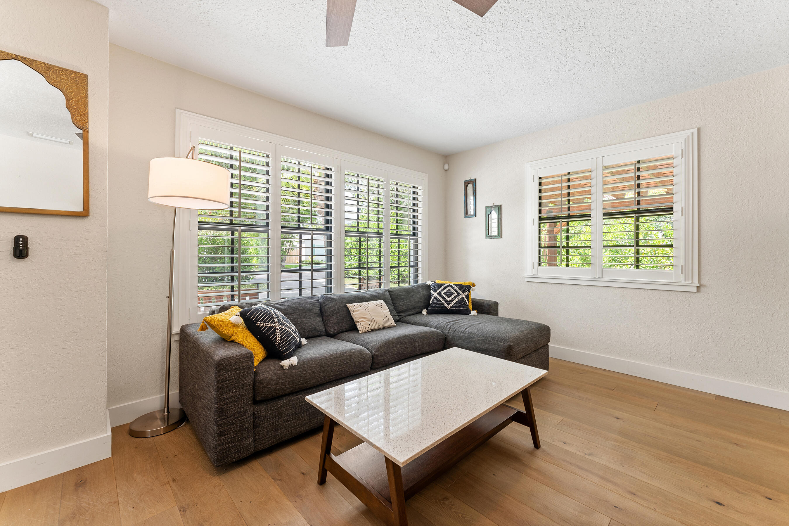 Beautifully Renovated & Centrally Located Home with Pool and Outdoor Oasis! Nestled in the highly sought-out SoSo neighborhood, this 3 bedroom, 2 bathroom residence sits on a perfectly manicured lot with lush landscaping, large circular driveway, and tastefully adorned exterior. Upon entering, you'll find European oak hardwood floors, plantation shutters, and impact windows & doors throughout. The kitchen showcases white cabinetry, granite countertops, tile backsplash, pantry, stainless steel appliances, and adjoining dining area. The primary bedroom suite is situated opposite of the 2 other bedrooms and features European oak wood accent walls, walk-in closet, and a recently updated en-suite bathroom. The primary en-suite bath comes equipped with dual sinks, glass shower enclosure, and...