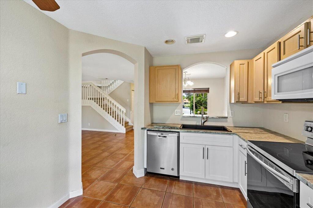 CBS townhouse with updated kitchen and enhanced landscaping. Located in a quiet cul de sac across from the lake. This home features upgraded granite countertops, stainless appliances, updated powder bath and low maintenance. Additional features include a covered entry for your deliveries, a covered and screened patio open to a large green area, a 2 Car Driveway with 1 Car Garage and guest parking next door on the lake. Briar Bay has impressive community amenities included with the low HOA fee.