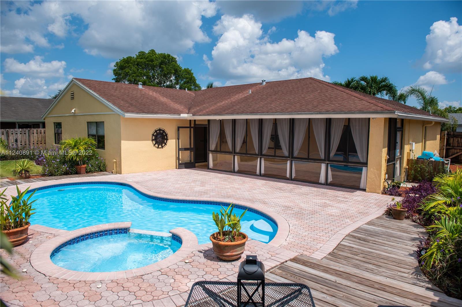 Located in the heart of Flamingo Gardens, this spacious split floorpan screams "Pride of Ownership". With natural lighting throughout, you will feel right at home walking into this immaculately kept 3/2 in the most family oriented neighborhood in Cooper City. An updated kitchen is the heart of the residence with brand new appliances, recessed lighting, and enough room to fit your entire family at the bar countertop. The property boasts an enclosed patio with wall to wall windows and an easy option to convert back into a Florida room with full ac duct work installed. After stepping out onto the beautifully paved deck surrounding the salt water pool and lush landscaping, you will know this is exactly what you have been searching for.