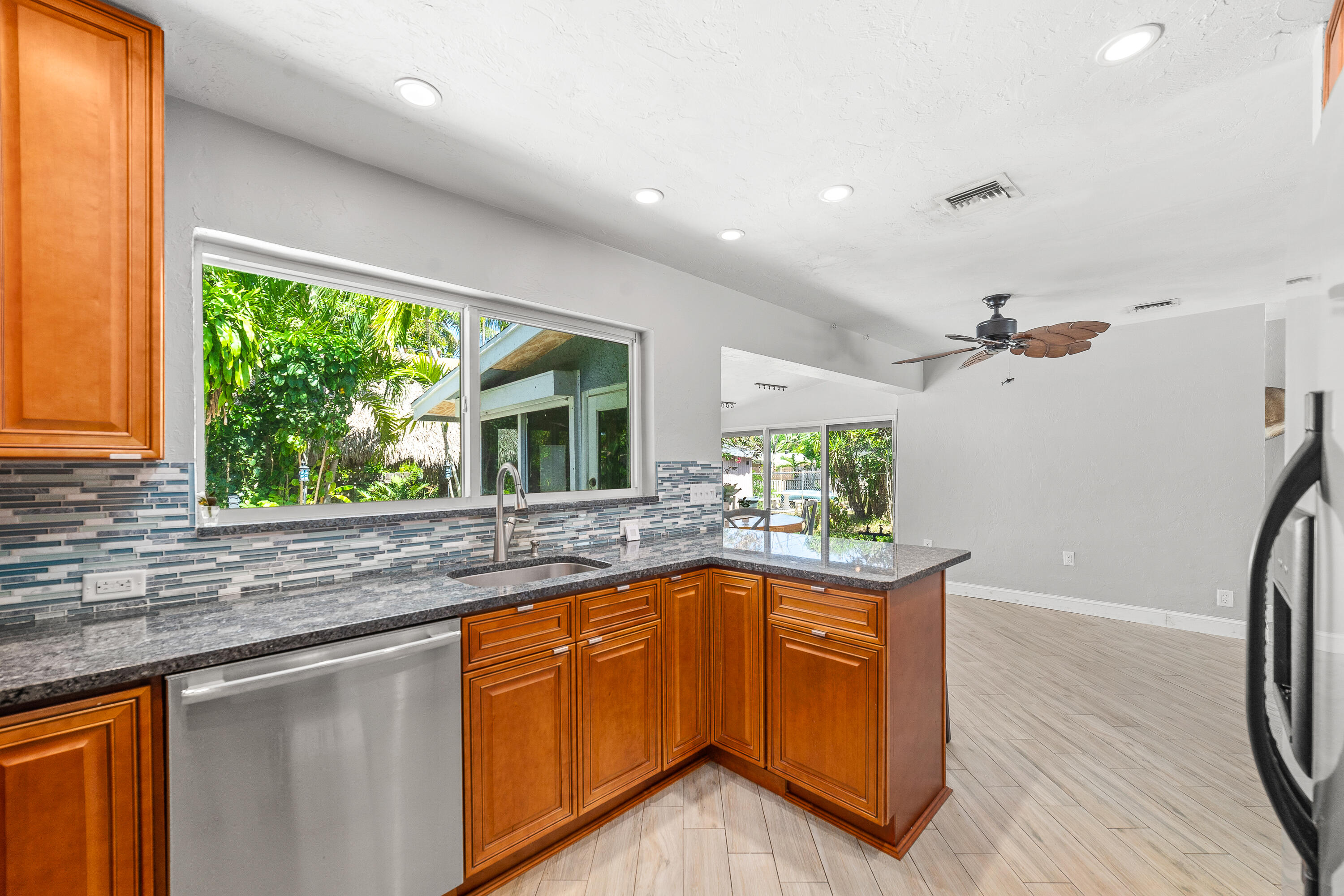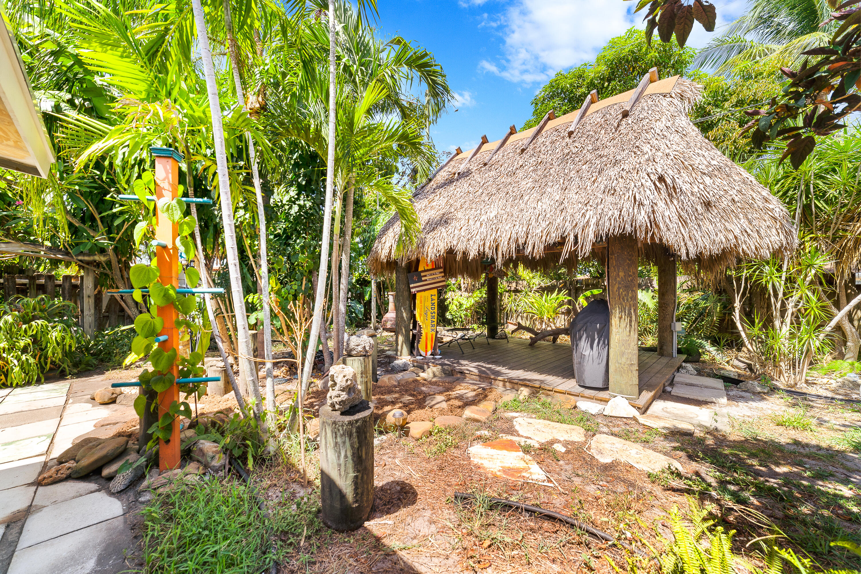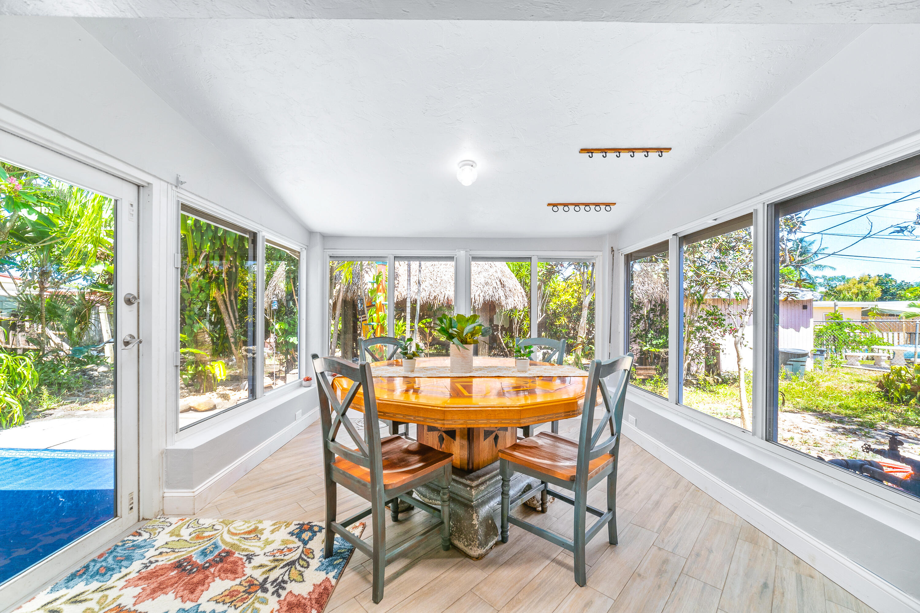STUNNING! This adorable 3 bed, 2 bath single family home has an upgraded kitchen that directly flows to the dining room. Relax in the cozy Florida Room or step outside to the backyard oasis where there is a tiki hut for you to relax in! Brand new Roof(2022) & Impact glass windows throughout that provide nice natural sunlight. Nice updated porcelain wood-like tile throughout the living room, kitchen, and dining room. Just a short bike ride or walk to the beach. This is a must see in person- call now and make this your new home.