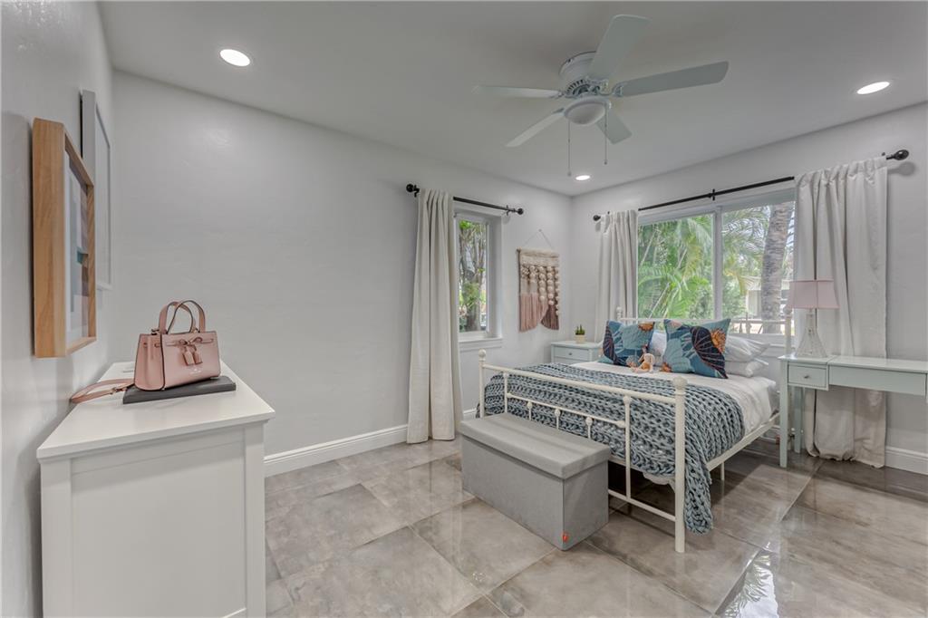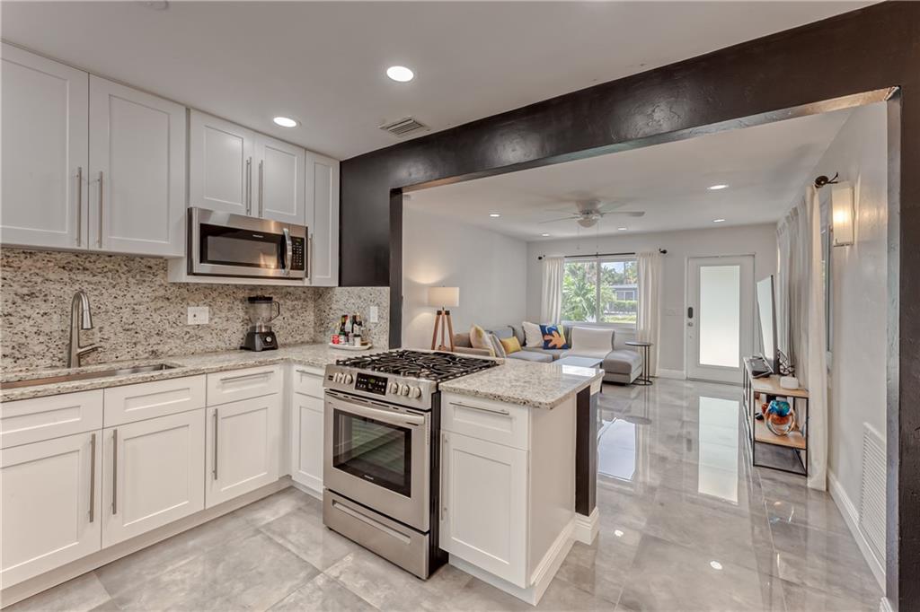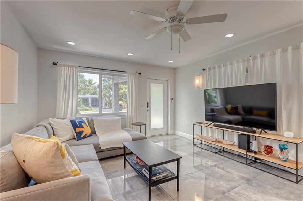 Bright and modern 3 bed, 2 bath home with plenty of room for a pool. Open Kitchen with dining area and indoor laundry room. Primary /Owner's suite on the back of the house, with separate entry door. Renovations done in 2017: porcelain flooring throughout, all impact windows and doors, new roof in 2015, plumbing line trenched and replaced in 2021. A/C new in 2013. Natural gas line from the street runs the stove / oven, dryer, tankless hot water heater, and the A/C heater. Nice paver patio in the large back yard for lovely outdoor dining experiences. One car carport with large storage closet. Very pleasant home ready for you!