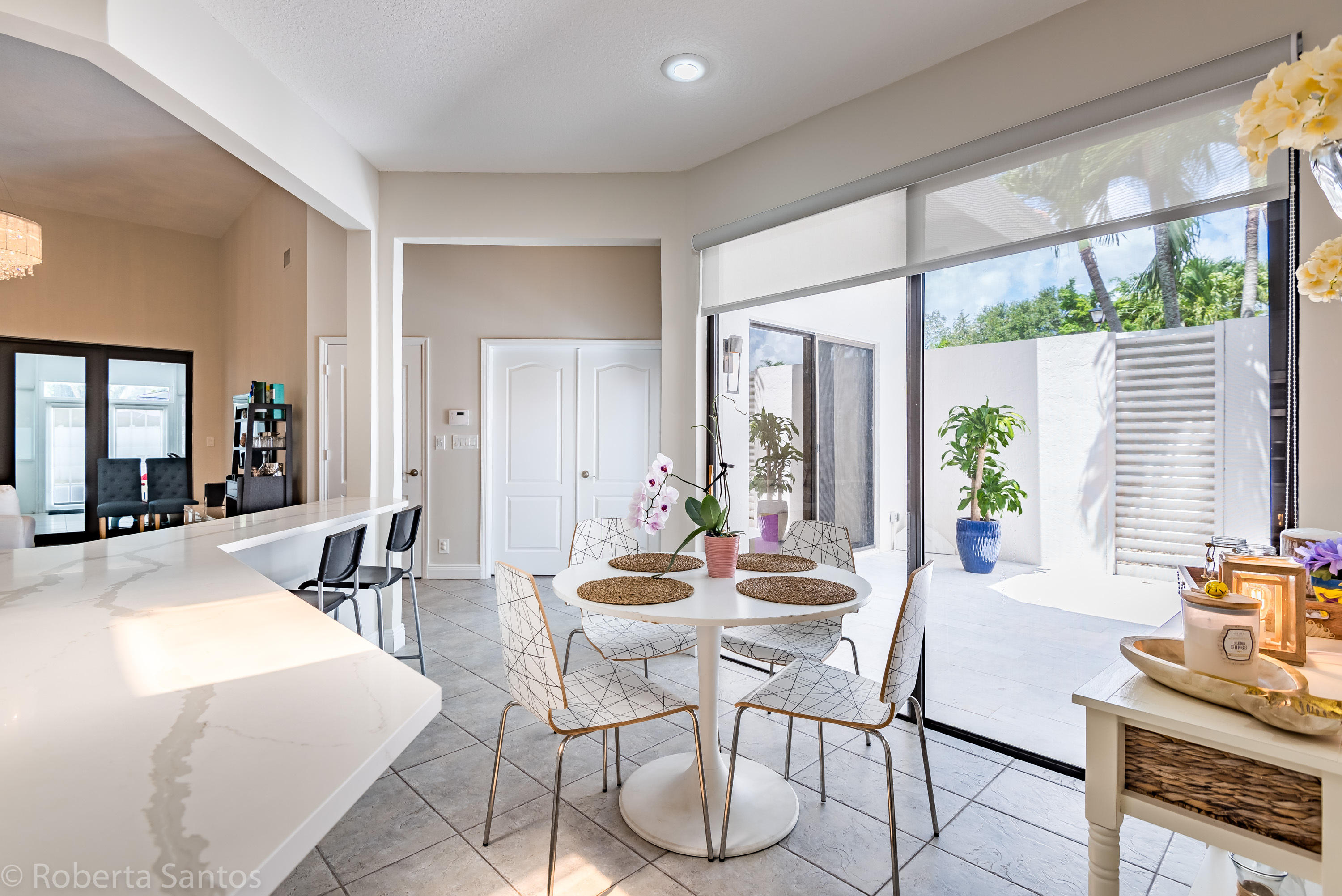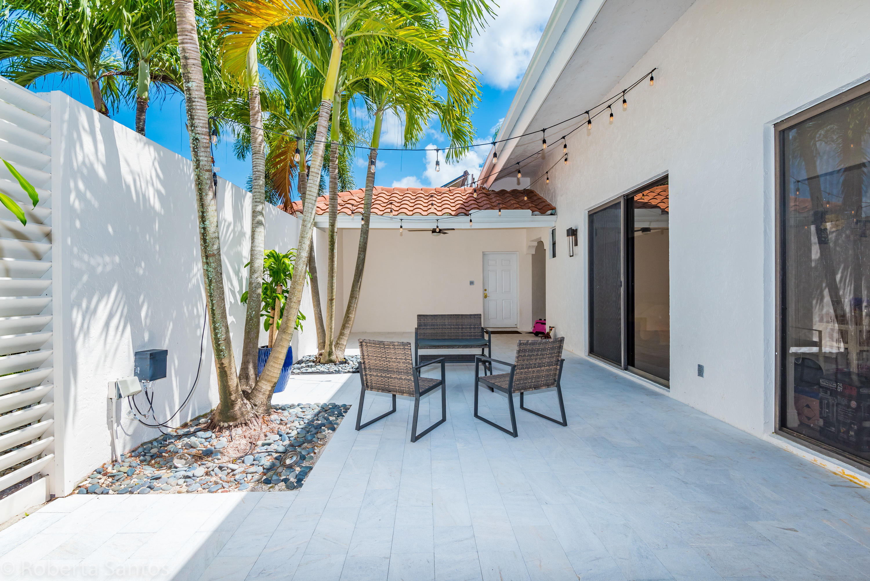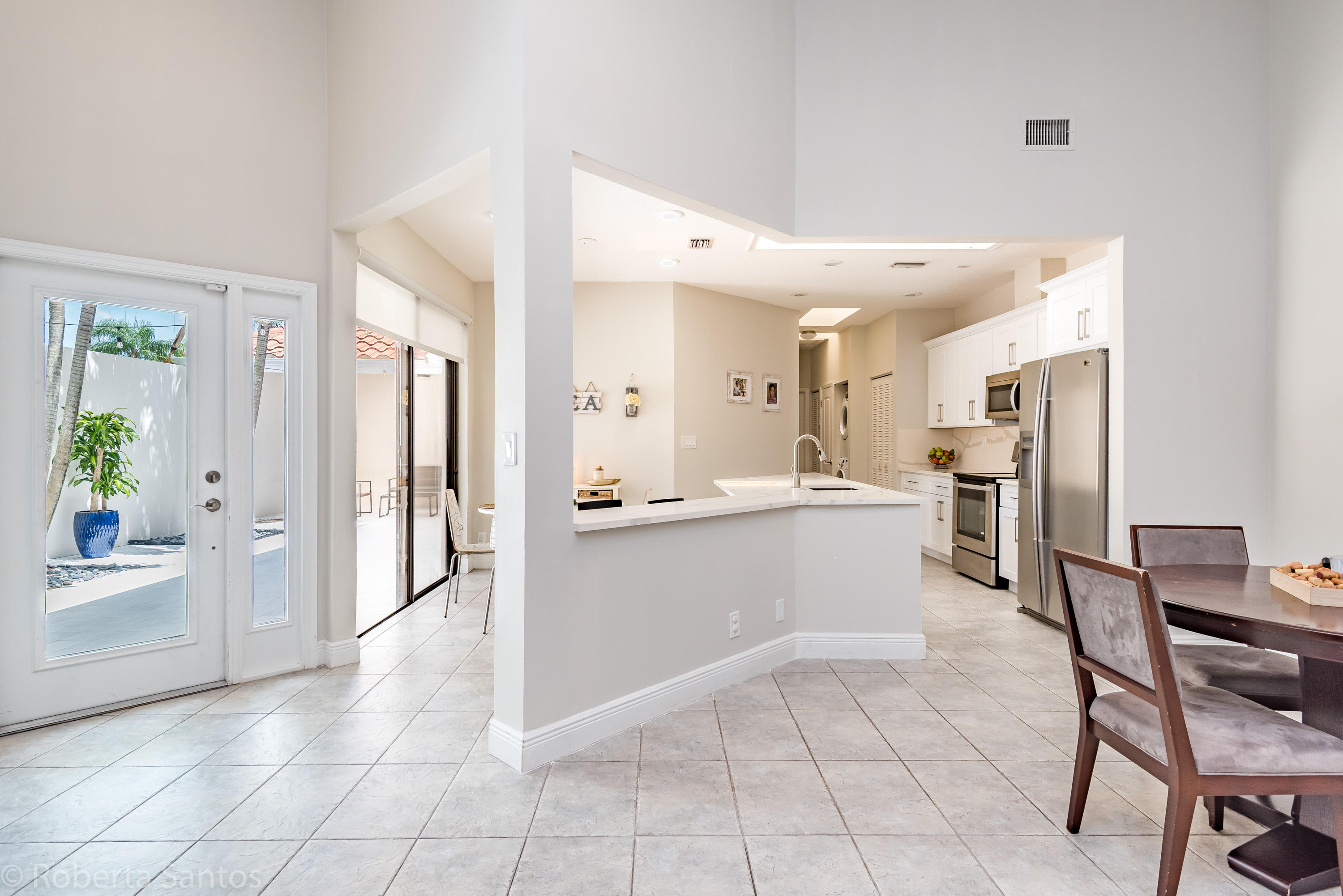 ABSOLUTELY GORGEOUS! Enter this fully renovated 3 bedroom, 2.1 bath villa! Open the front door to a tropical paradise! Professionally paved with marble & landscaped 19 x 13 courtyard with timer for night lighting. Upon entering through the double custom glass front doors this light and bright spacious home will make you feel welcome, featuring a brand new kitchen, matching quartz counters and backsplash, vaulted ceilings, neutral tile throughout the living areas, 2 car garage, and a BONUS 18x18 air conditioned Florida room, oversize corner lot with room for a pool in the backyard. Villa San Remo is an all-age community with a resort style clubhouse, pool, gym, tennis, basketball & playground located in an A-rated school district. Manned gated security.