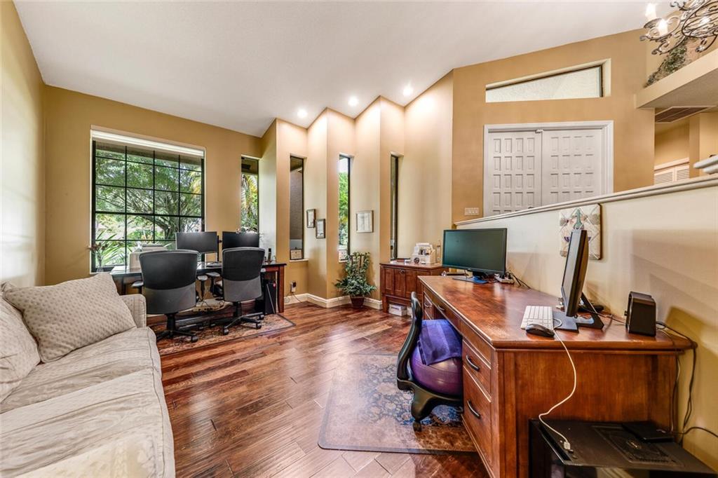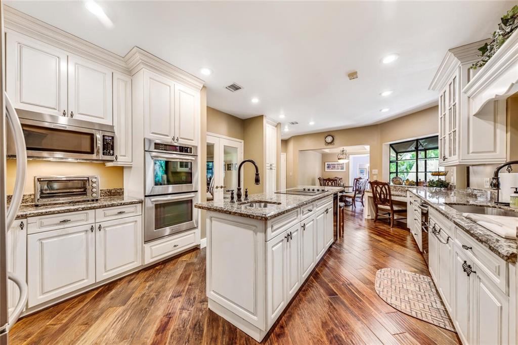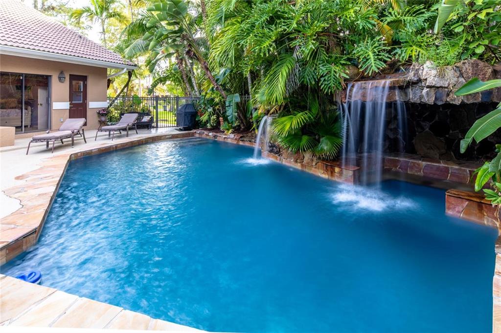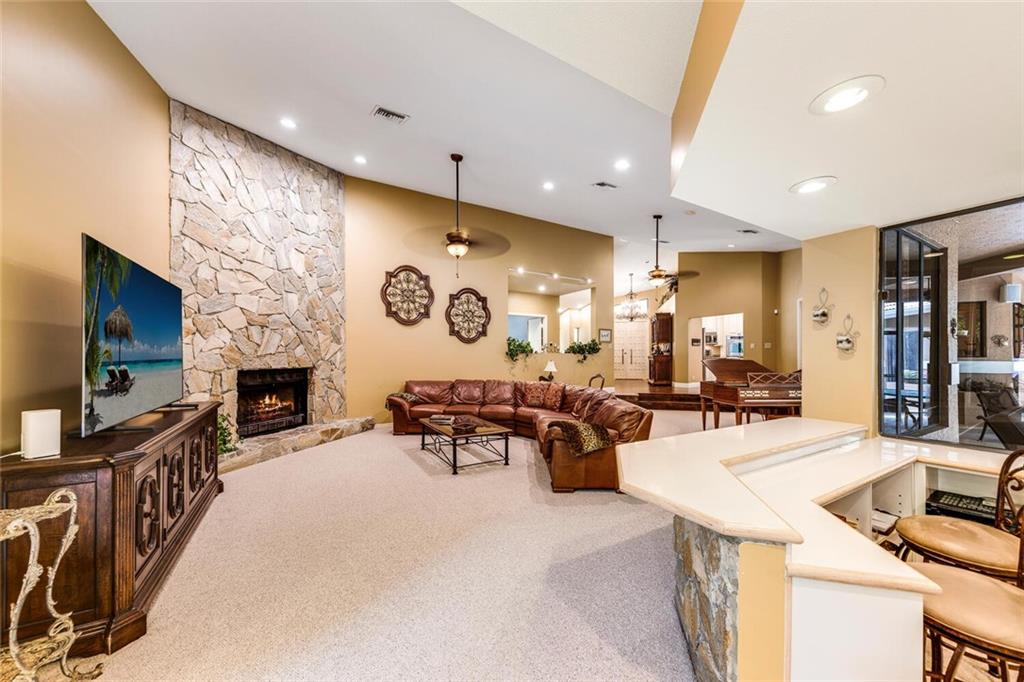 Sellers installing BRAND NEW ROOF (incl. flat roof)!! In addition, BRAND NEW A/C! The huge family/great room features vaulted ceilings, plantation shutters, stunning floor-to-ceiling, flagstone fireplace & double French doors & wet bar w/pass through to screened loggia! The custom kitchen offers beautiful wood cabinets, granite counters, & huge center island w/cooktop, veg. sink & breakfast bar. The breakfast room w/tray ceiling opens to loggia. More upgrades include: stunning hardwood floors; numerous French doors & plantation shutters, & updated baths--MBA boasts exquisite, stacked stone detail! Beautiful atrium to backyard; spacious, screen-enclosed loggia, and amazing, open pool with breathtaking stone "cave" and triple waterfall!! Lushly landscaped and fenced for complete privacy!
