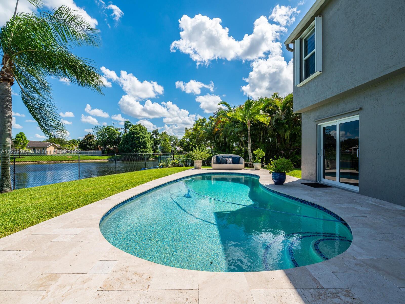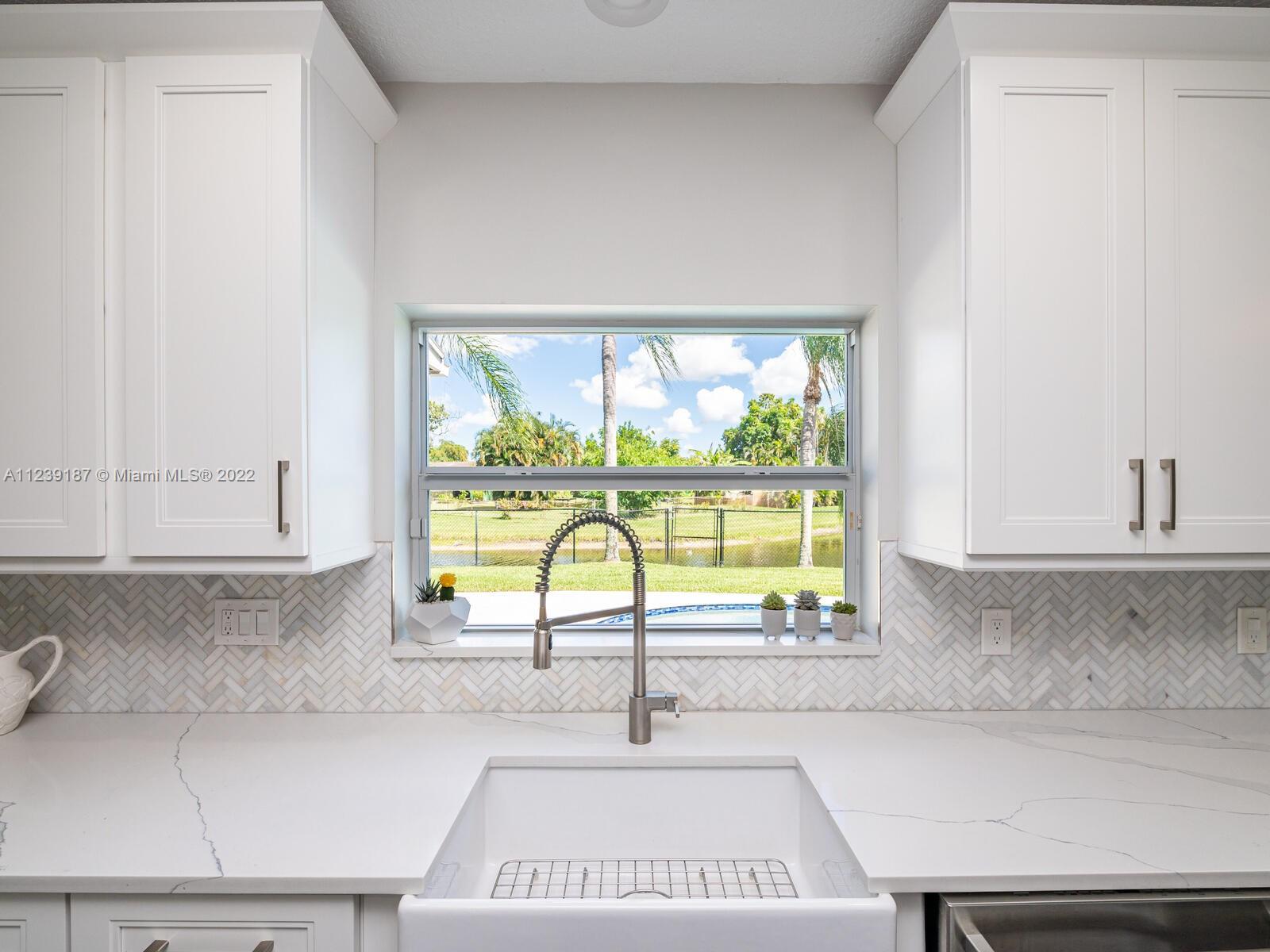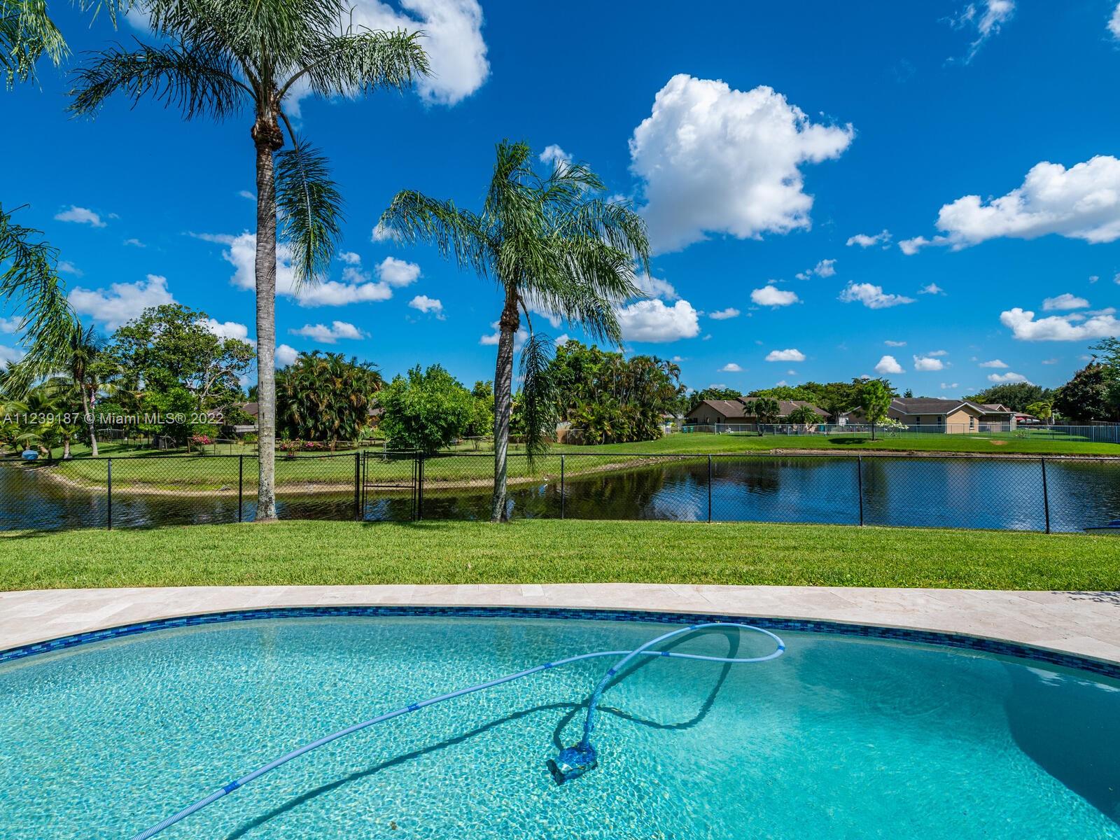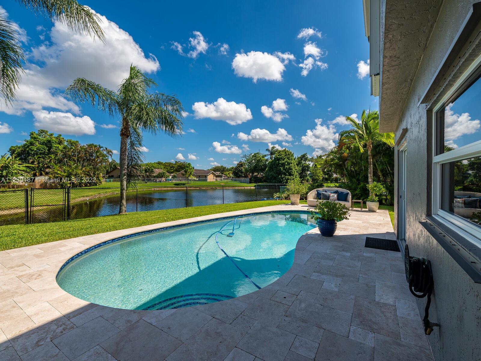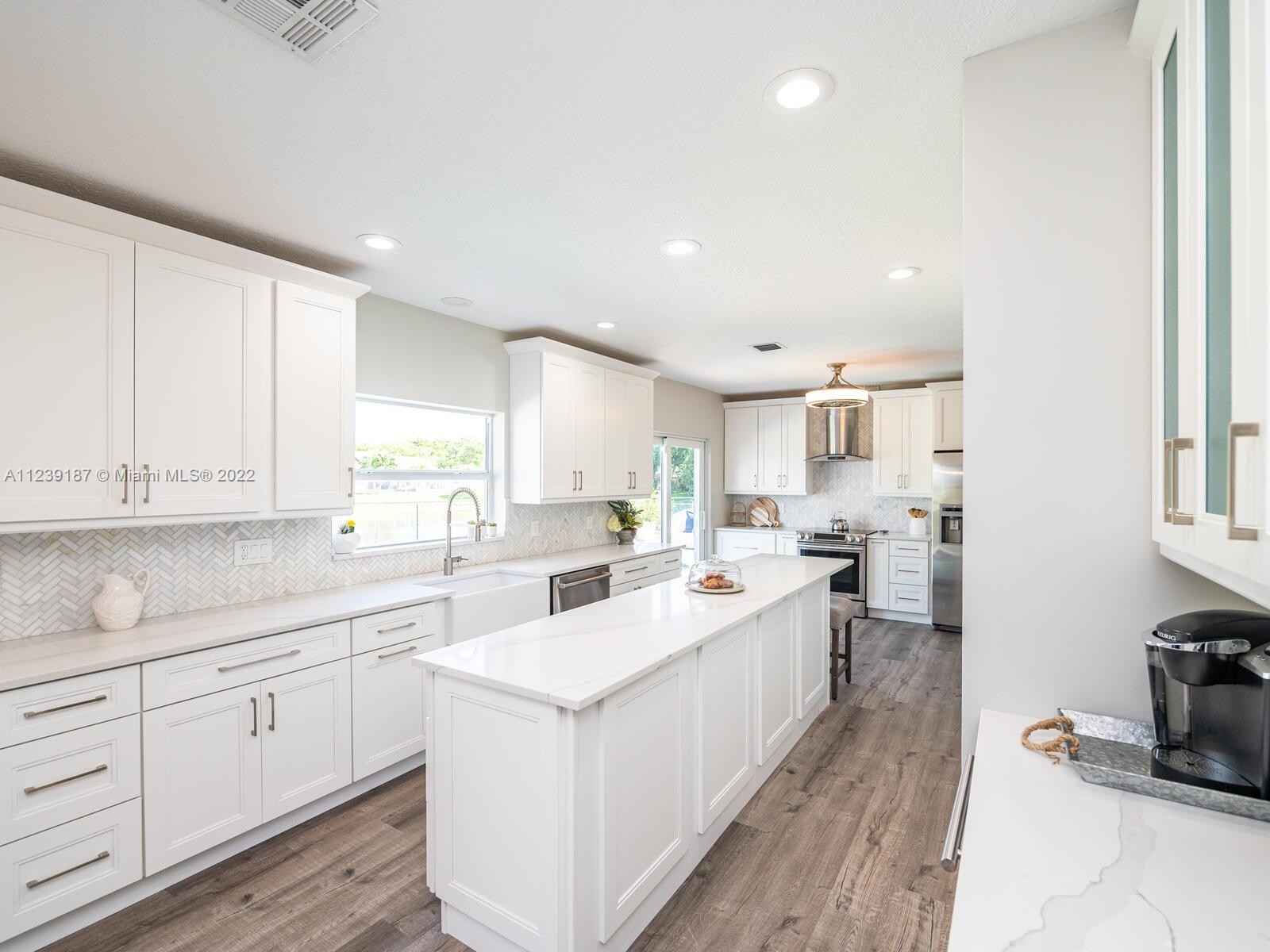 Gorgeous Cooper City 4 bedroom lakefront pool home. Stunning newly remodeled kitchen with huge center island, quartz counters, white shaker cabinets, soft-close draws, all new stainless appliances, LED lighting, new waterproof wood laminate flooring with lake and pool view. Newer impact windows and sliding glass doors. Panels & accordions for extra protection. Recently resurfaced - salt system pool and paver driveway and walkway. Other features include new a/c, sprinkler water from lake, patio fan w/blue tooth speakers. Reroofed after hurricane Wilma.