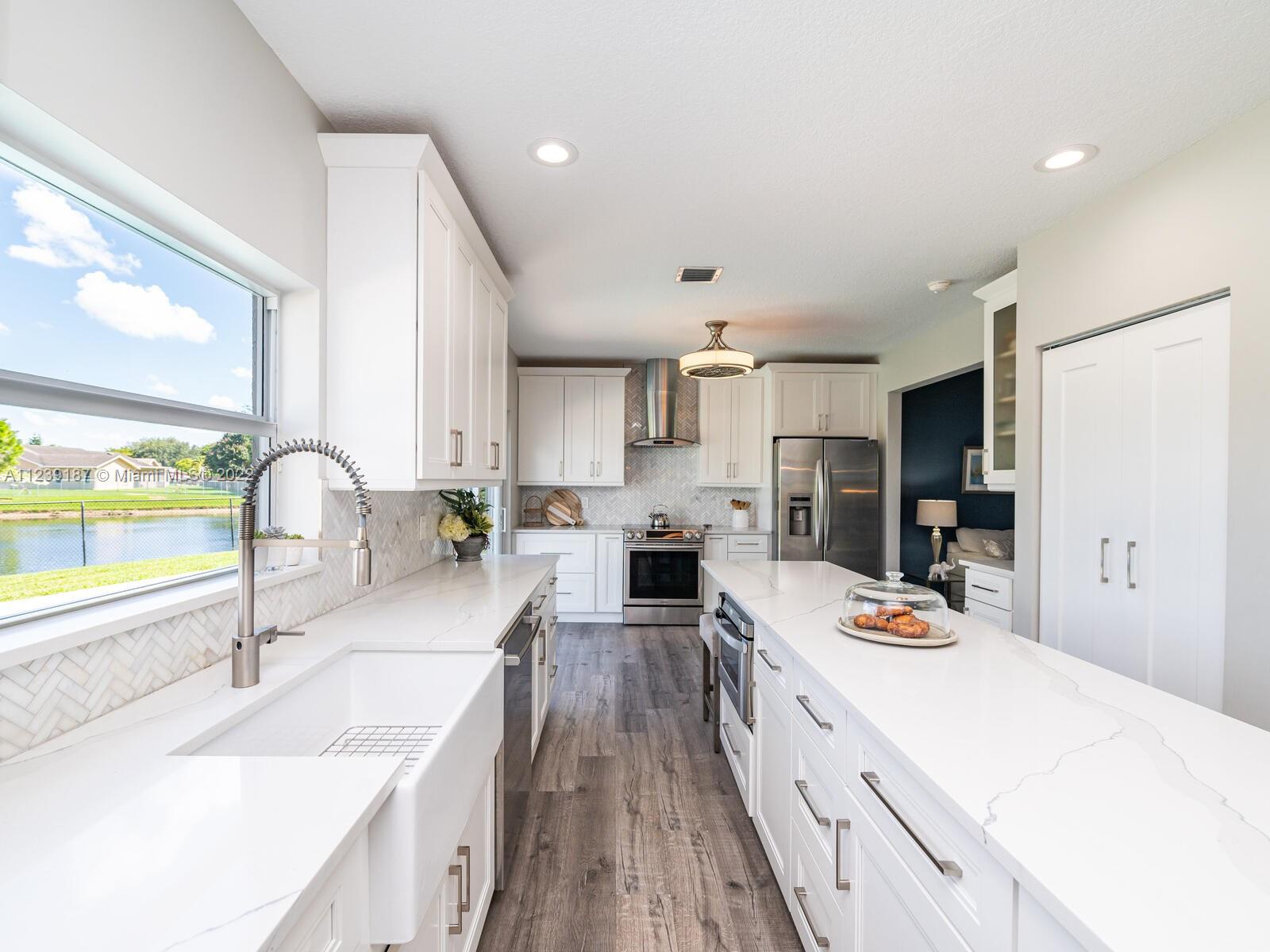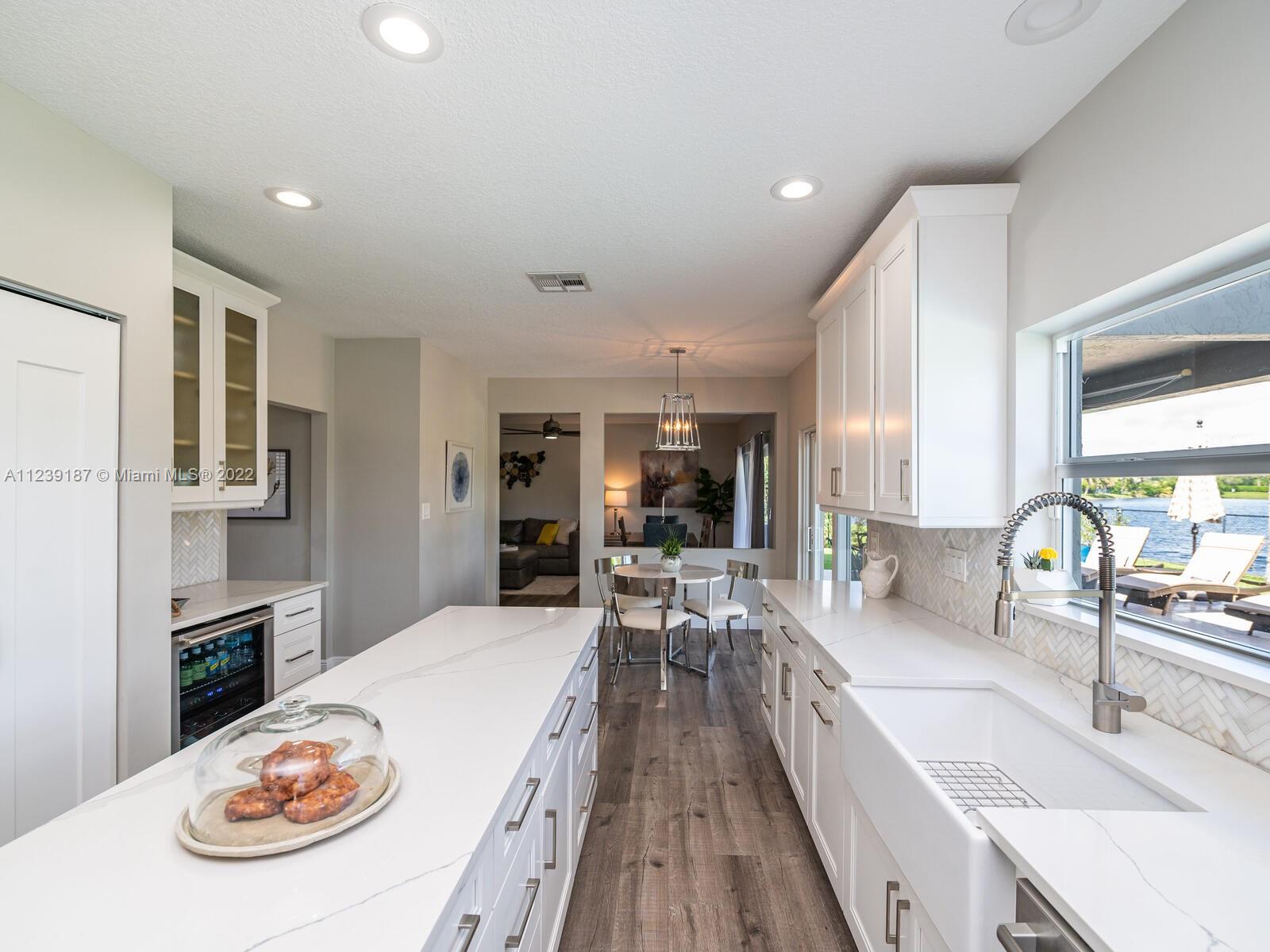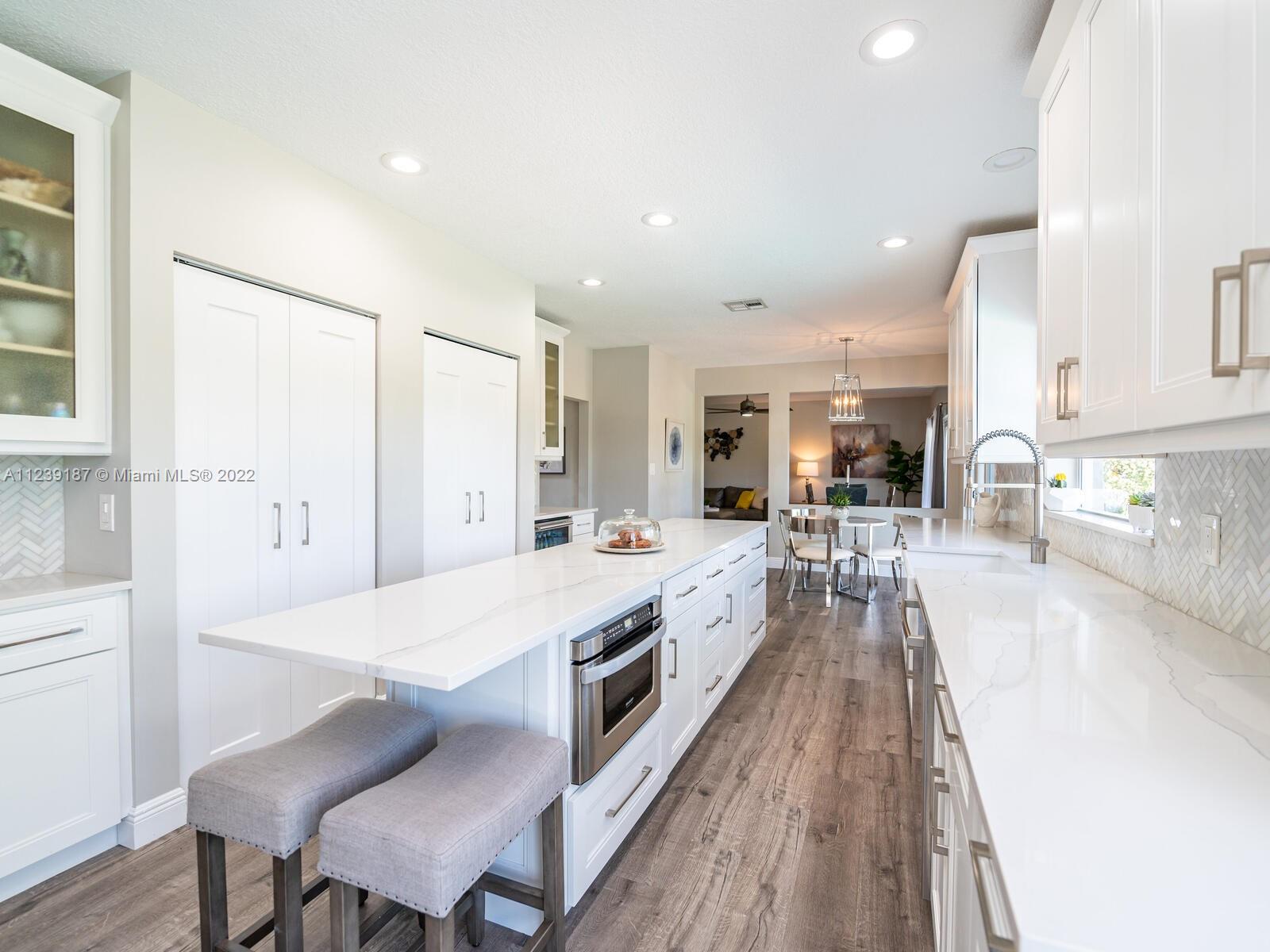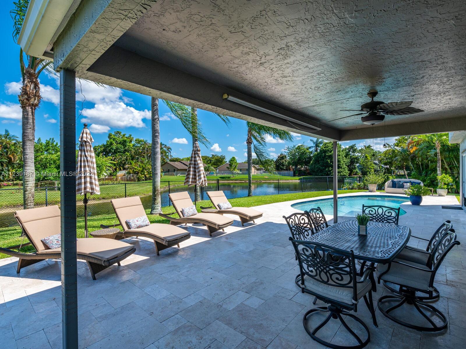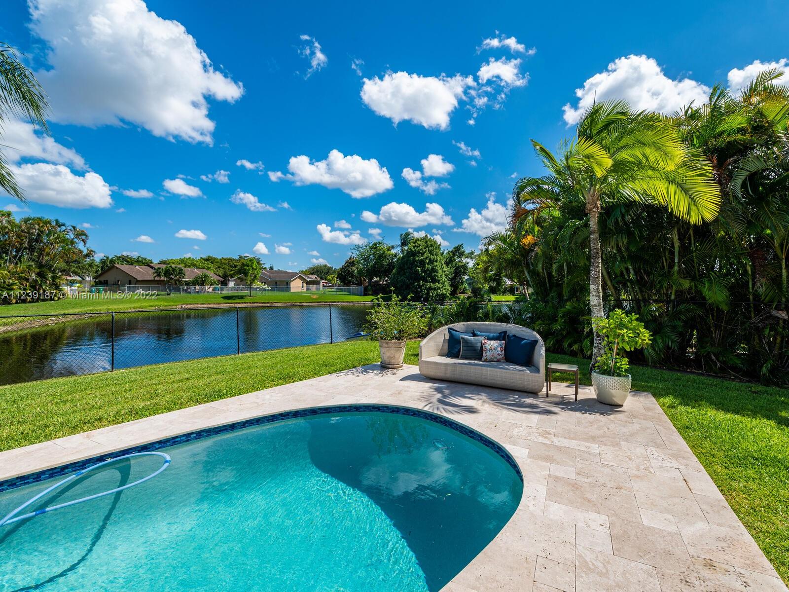 Gorgeous Cooper City 4 bedroom lakefront pool home. Stunning newly remodeled kitchen with huge center island, quartz counters, white shaker cabinets, soft-close draws, all new stainless appliances, LED lighting, new waterproof wood laminate flooring with lake and pool view. Newer impact windows and sliding glass doors. Panels & accordions for extra protection. Recently resurfaced - salt system pool and paver driveway and walkway. Other features include new a/c, sprinkler water from lake, patio fan w/blue tooth speakers. Reroofed after hurricane Wilma.