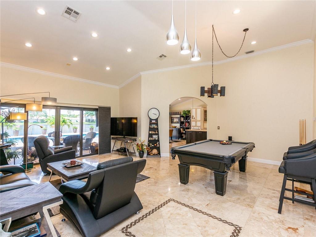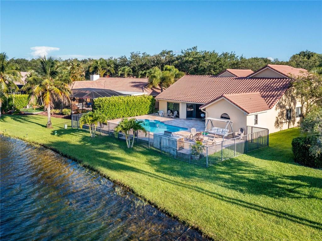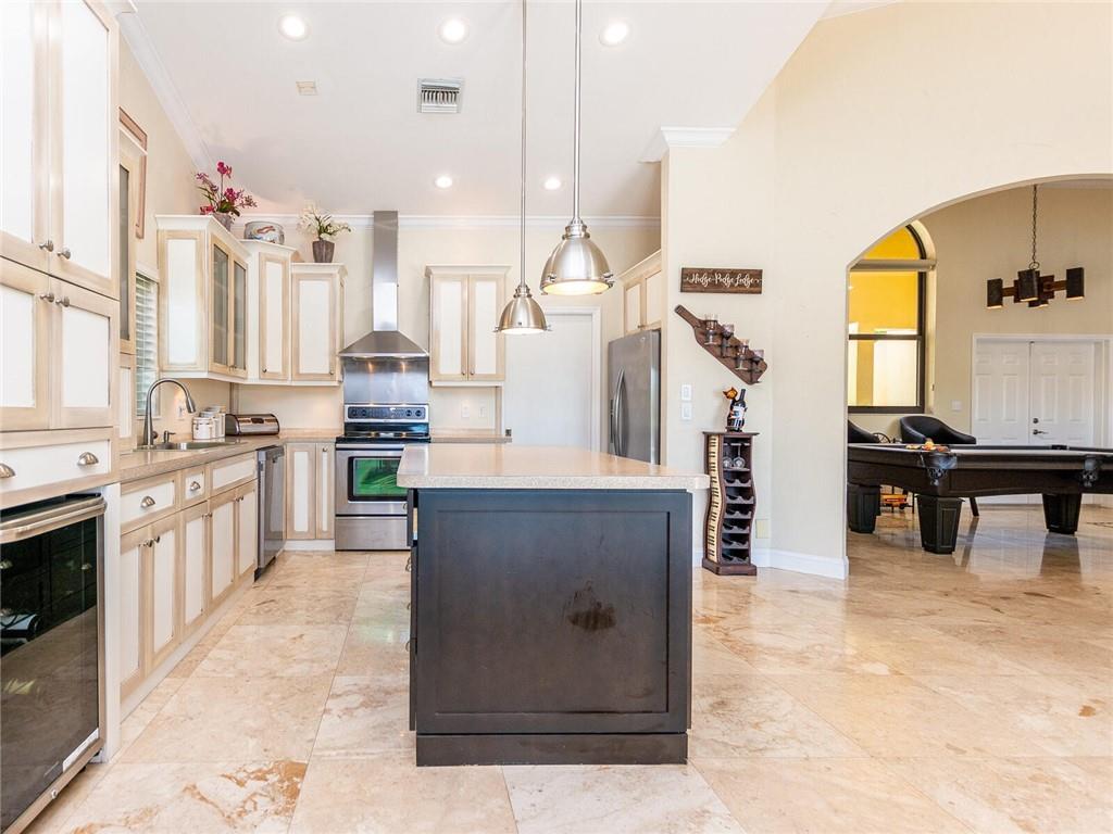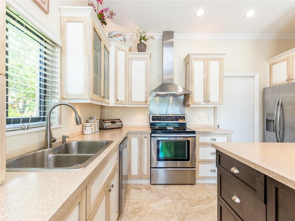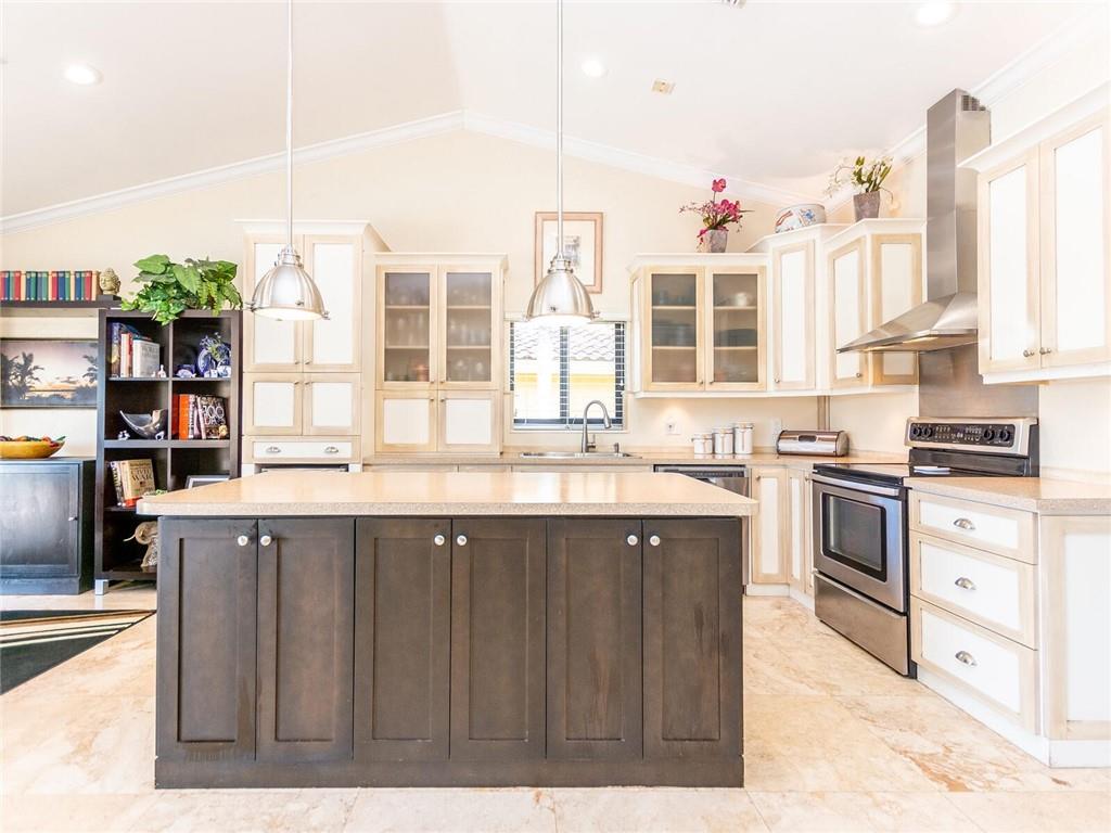 Wow!! Absolutely Stunning!! Premium waterfront location with expansive views! Full impact windows & doors. Updated kitchen and baths, wood cabinets, high volume ceilings, crown molding, travertine floors, walkway and patio. Kitchen features center work island, SS appliances, wood cabinets, wine cooler, under cabinet lighting, separate breakfast area. Roof replaced. Master and 2 bedrooms on 1st floor, 2 bedrooms upstairs with high end laminate flooring and updated bath. Incredible pool/patio area with extended travertine deck, built-in grill, large covered area and fenced yard. Fabulous location within walking distance to Country Isles Elementary, Publix, Town Center and Parks. Won't last!!