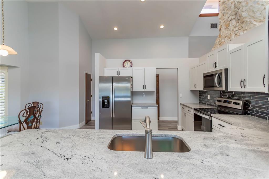 Fantastic waterfront home with 4-bedrooms and 2.5 bathrooms in Cypress Glen. as you enter you are greeted with a Bright and airy formal living room with a stone fireplace, cathedral ceilings with new LED lighting and long lake views from the 80 ft of waterfront (sunset views west exposure). BRAND NEW Custom kitchen with new Stainless-steel appliances. Offers new light tone wood like waterproof vinyl throughout living areas. Large master suite w/walk-in closets, remodeled bathrooms, all bedrooms have brand new carpet. new screened in area with outdoor kitchen. LARGE PATIO W/ ROOM FOR POOL. No association fees. AC 2021, ROOF 2001. Circular driveway & 2 car garage. No Assoc fees.