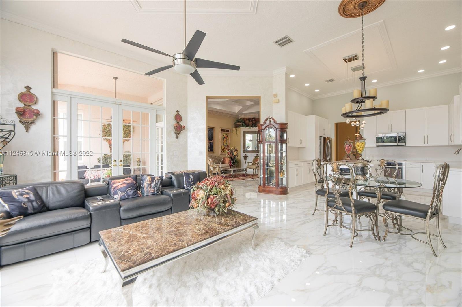 Breathtaking pool and lake view welcomes you upon entering the front door of this upgraded dream home ideal for entertaining, and located in resort style neighborhood. Many upgrades: New huge 4.5 X 4.5 Calacatta Gold Porcelain floors throughout common area. Built in stone mantle; Faux stone crown moldings; Brand new white Gourmet Kitchen w/new Quartz counter tops/back splash and large island. New stainless steel refrigerator, microwave, wine cooler, washer/dryer and water heater. Pool recently remarcited W/LED lighting installed, pool patio redone, built-in bar and grill. Clubhouse, newly renovated w/lagoon style pool, recreation room, party room, Gym, tennis courts, basketball courts and playgrounds. Excellent schools. This is a MUST SEE at Riviera Isles - Portofino!