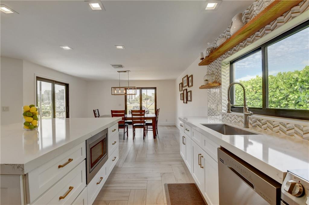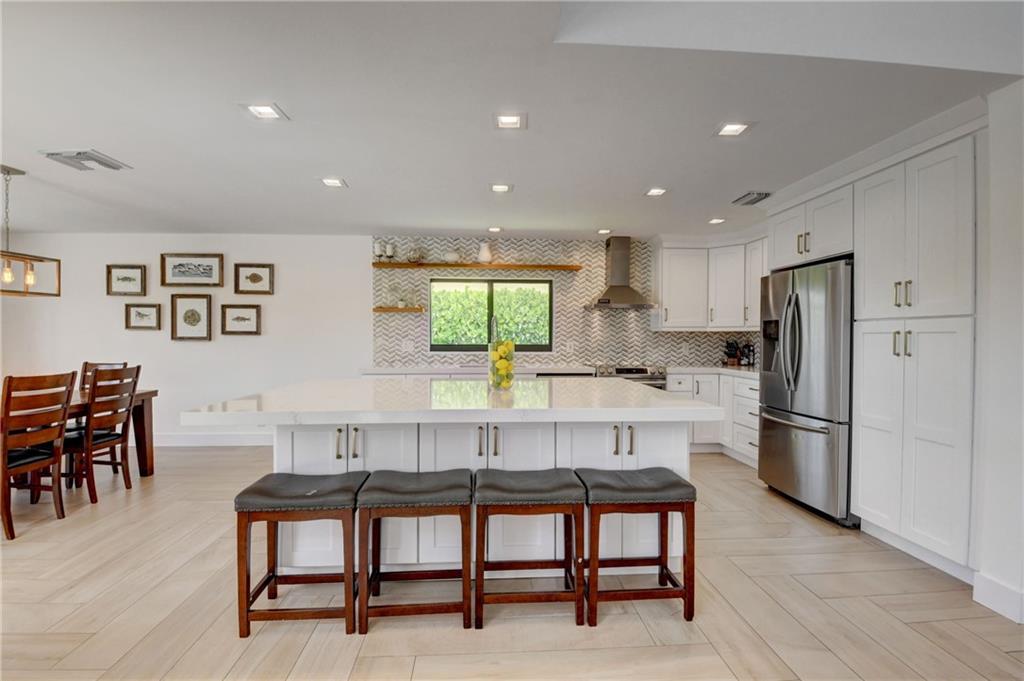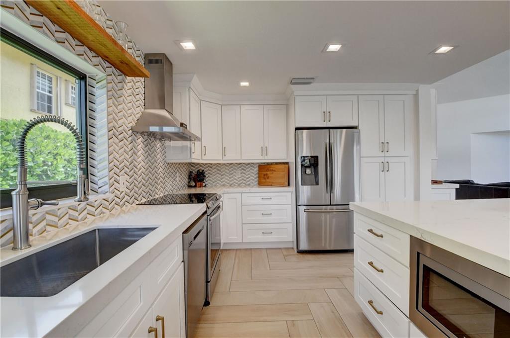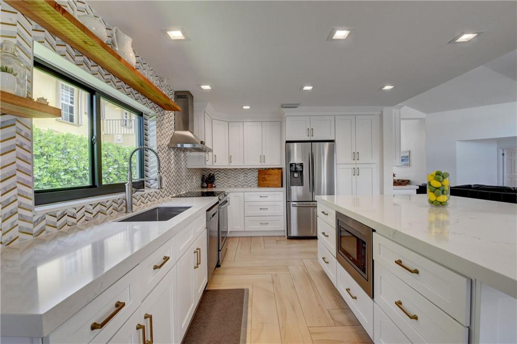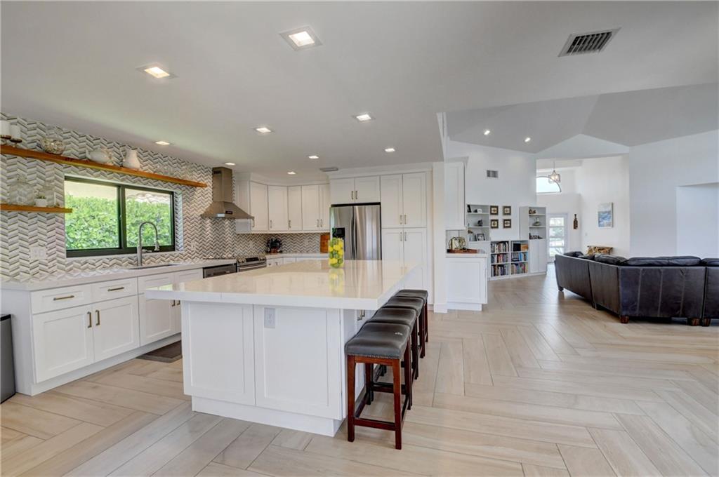 Move-in ready 4BR/3BA three way split totally redesigned in 2019! You'll be impressed with the natural light from the 2019 installed impact windows and doors. The herringbone pattern tile floor will "wow" you! The great room is open to the gorgeous, white kitchen with bronze accents. Gather the guests by the massive island, the dining table or the screened patio. The split floor plan allows for a private primary bedroom and bath with great views of the patio. The 2nd bedroom is perfect for guests, located away from the other bedrooms. The 3rd and 4th bedroom share a bathroom and can be closed off with the hallway door. Nice size lot with 11,583 sf, water views in the rear, and large space out front for parking in driveway. Culdesac location! Close to beach and restaurants. Low HOA!