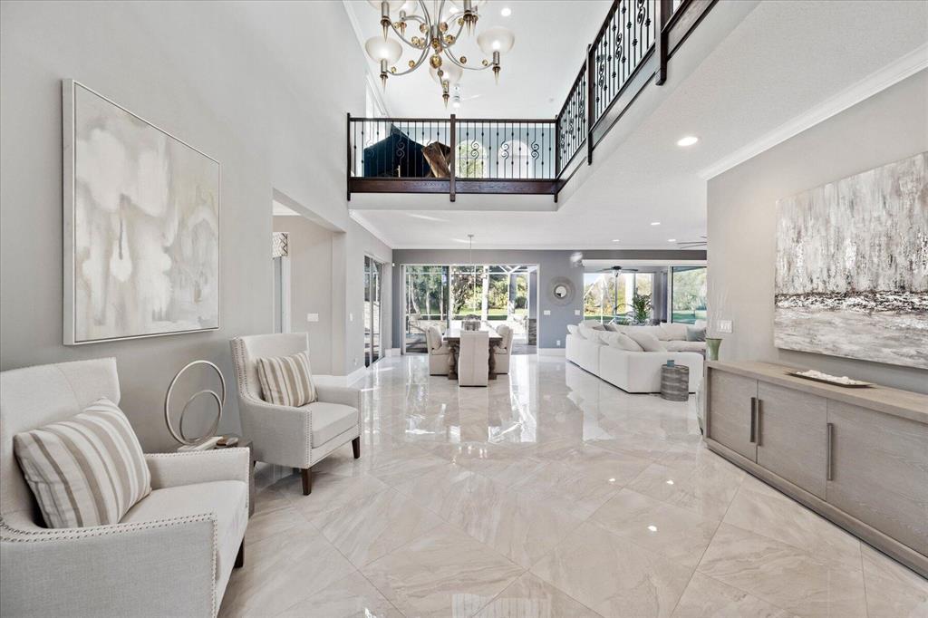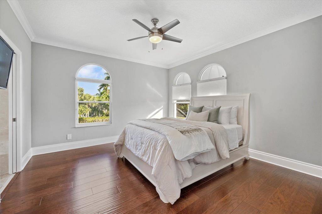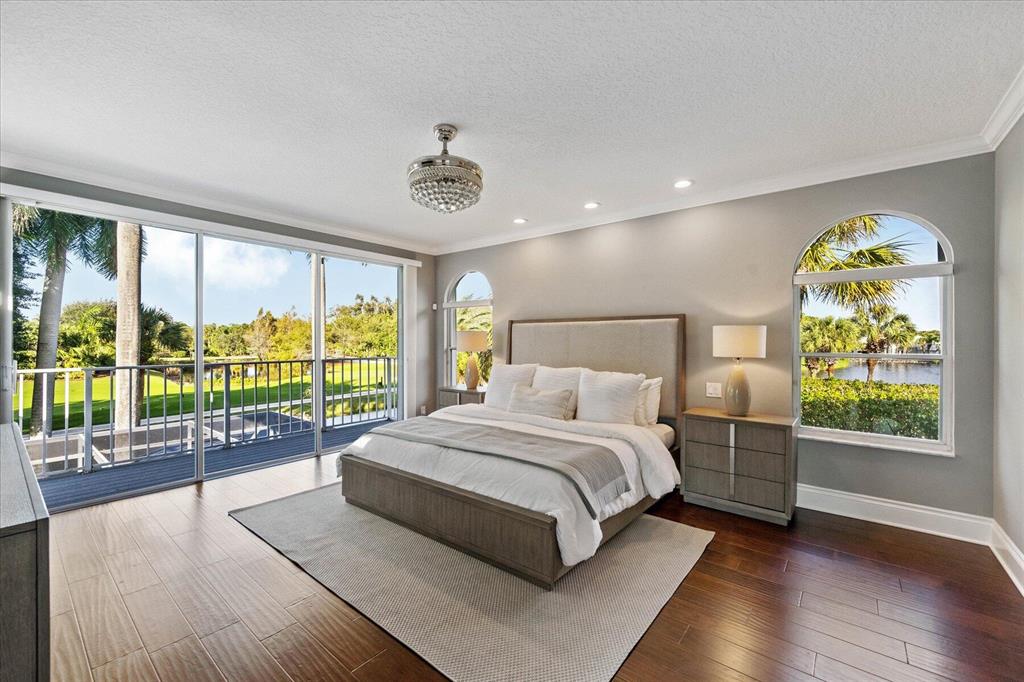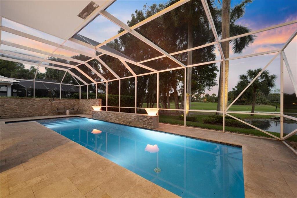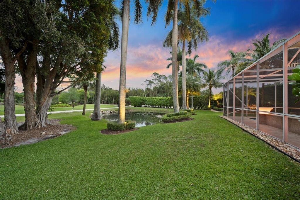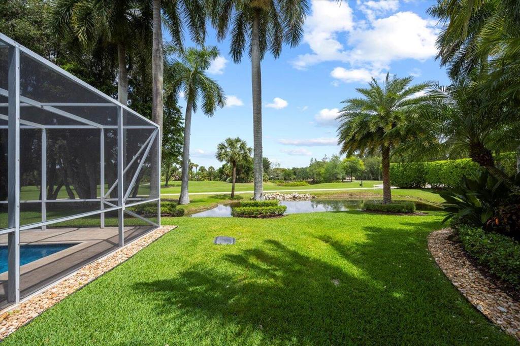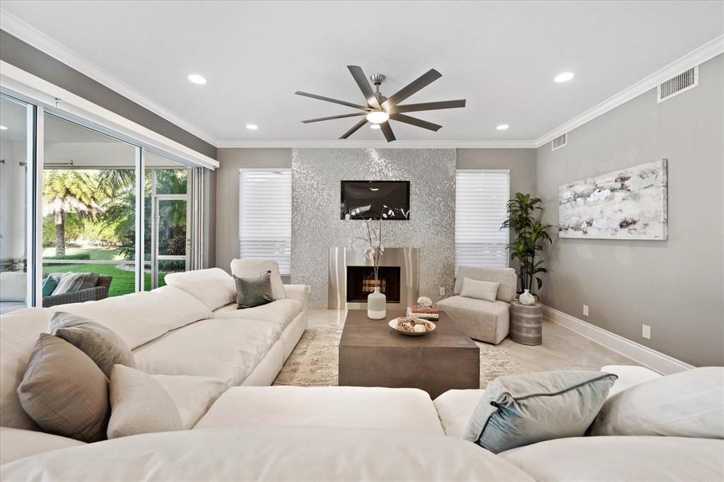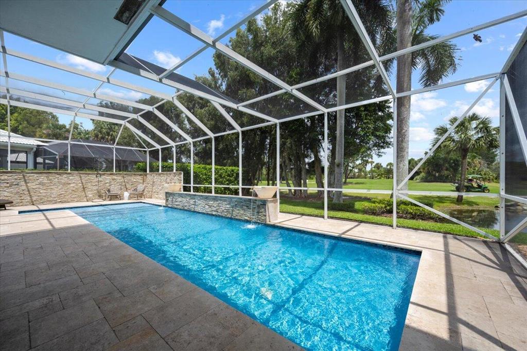 Just what you have been waiting for... Elegant & sophisticated 3 Bedroom+Loft, 3.5 Baths home with sweeping golf course views in sought-after gated community of Breakers West in West Palm Beach. Located on hedged cul-de-sac street, this home boasts manicured landscaping, Royal Palms as well as other specimen palms all high-lighted by landscape lighting. The contemporary interior finishes in this 2-story home will immediately catch your eye with its porcelain tile floors on the 1st floor, wood floors upstairs and high ceilings. The Great Room features fireplace with mosaic tile surround, wet bar and wall of sliding doors opening to a gorgeous screened outdoor entertainment patio with marble stone deck & outdoor grill/bar area. The 10' x 35'