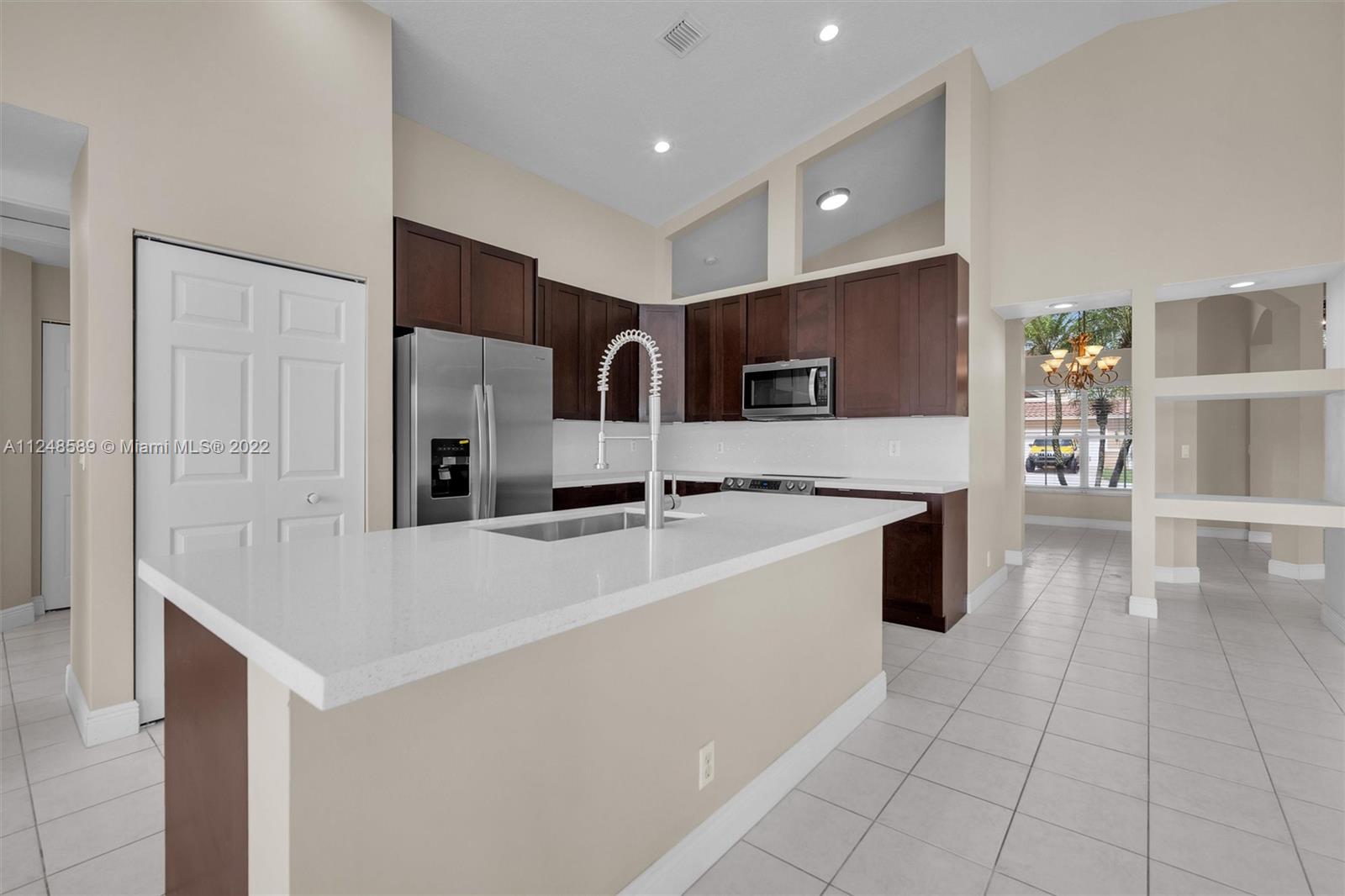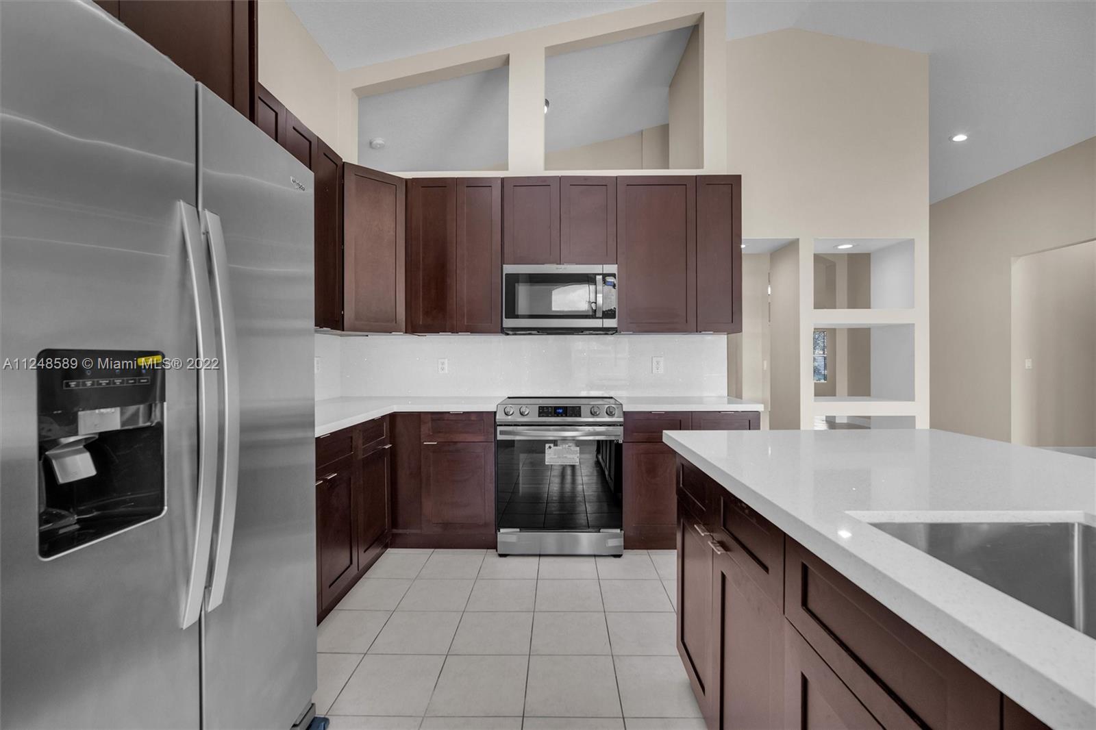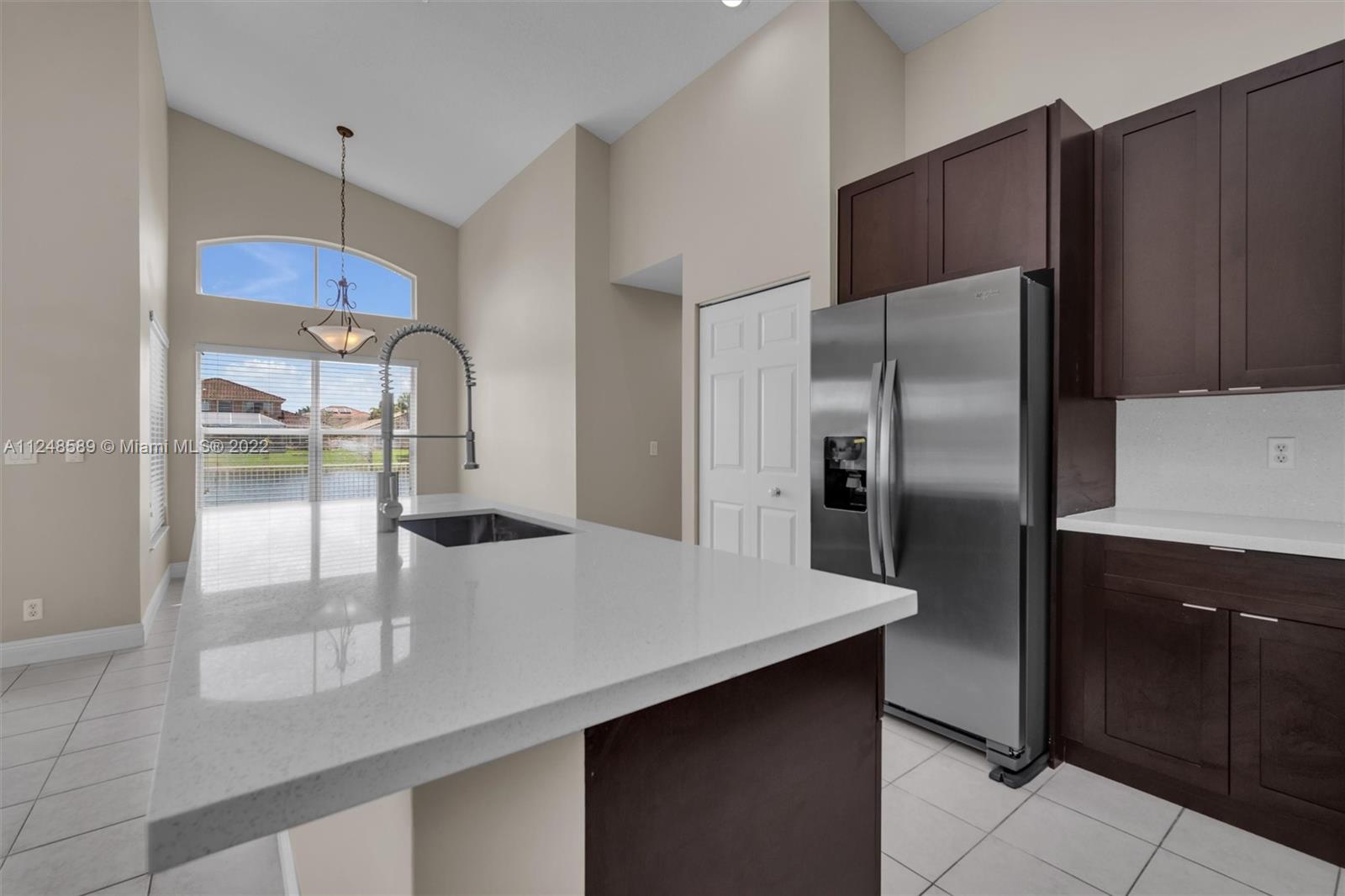 Superb, just remodeled lake front 5 BR, 3 full bath home in manned gated Encantada of western Pembroke Pines. Brand new kitchen w/ all stainless appliances, quartz counters and top wood cabinetry. Cabana bath also remodeled, new washer and dryer, newer A/C. Top schools including Sunset Lakes Elem, West Broward HS plus nationally recognized City of Pembroke Pines Charter West Elem and Middle right at community gate. Oversized waterfront fenced yard to enjoy your tropical paradise. Resort level amenities incl pool, club house, fitness center, tennis. Optional 5th BR currently configured as huge den/office/play room. Great location close to parks, shopping, dining and easy commutes in every direction.