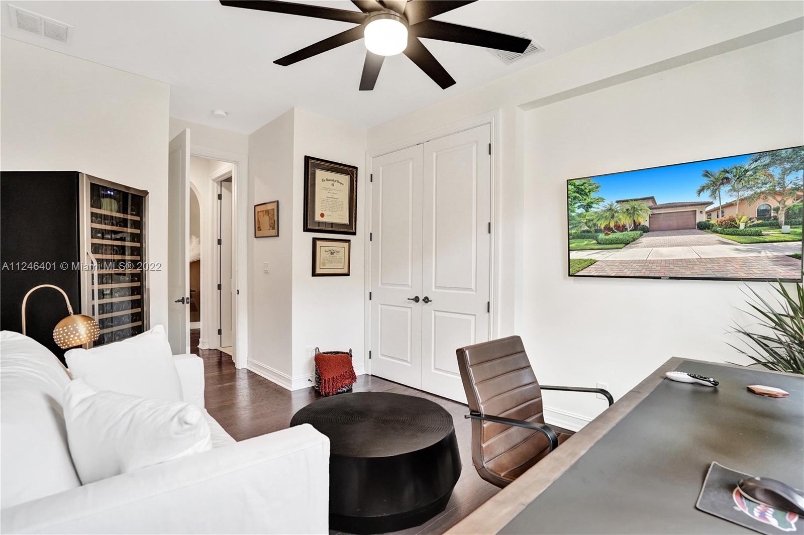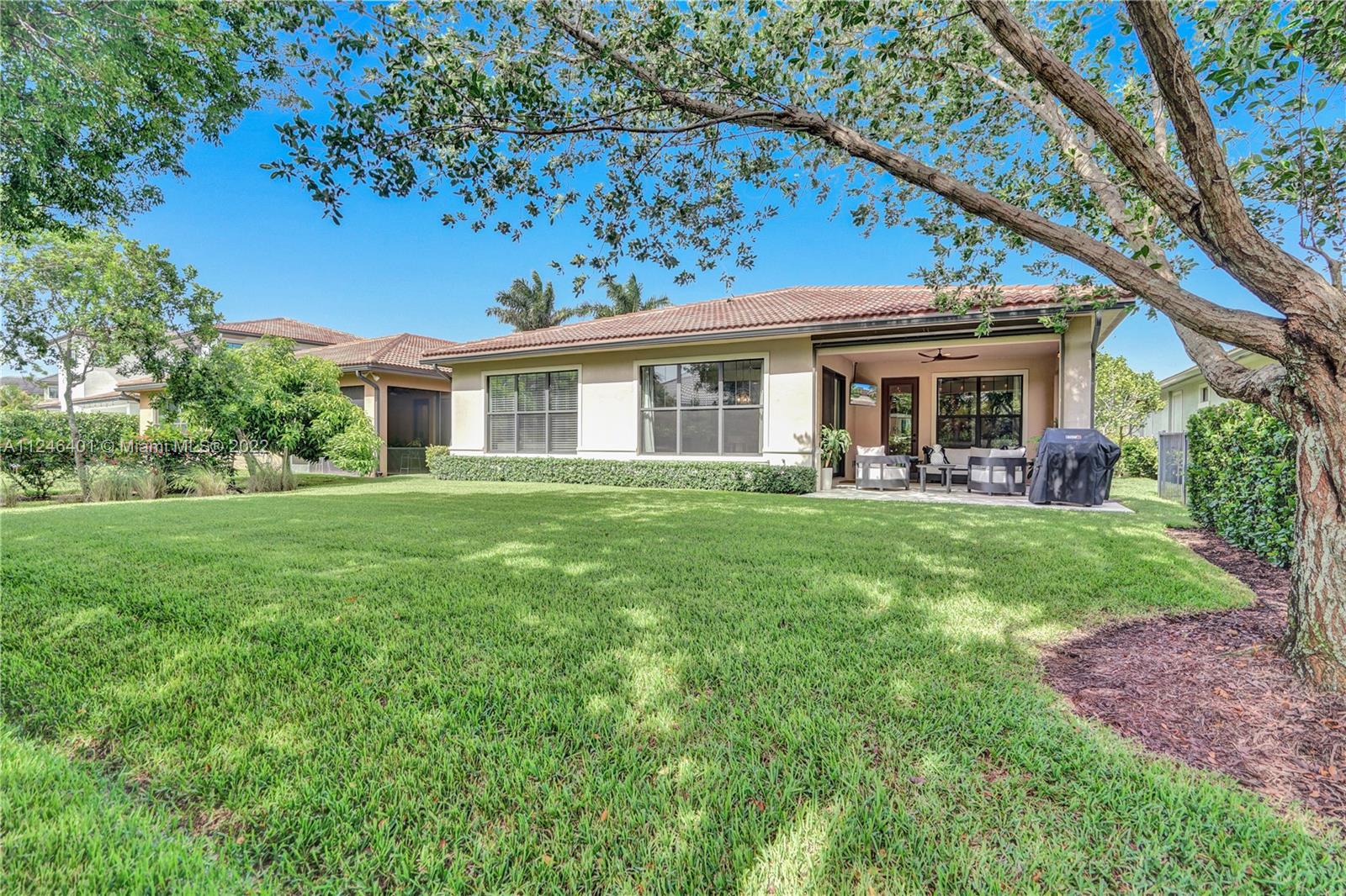 This upgraded Kensington Model offers a triple-split floor plan and features stunning wood floors and coffered ceilings. The chef’s kitchen boasts custom cabinetry, quality appliances including double ovens and gas cooktop, and a breakfast bar with ample seating. The light-filled living room and separate formal dining room are surrounded by a wall of windows and doors and seamlessly connect to the screened Lanai with retractable enclosure. The large, private backyard offers great space to add a pool. The interior offers four elegant and generously-sized bedrooms and three stylish bathrooms. Watercrest is a resort-style gated community with a host of amenities including a clubhouse, pool, fitness center, tennis, dog park and more. Parkland is known for A-rated schools and amenities.
