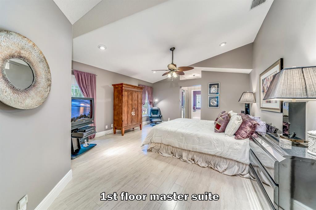 Dramatic entrance w/soaring 2 story high volume ceilings & picturesque wall of windows that flood the inside w/natural light. Enjoy the sense of openness, volume & space. Fabulous foyer w/glass tile mosaic inlay. Porcelain tile downstairs & real wood floors on staircase & loft area. Newer plush carpet in 2 upstairs bedrooms. Tons of recessed lighting. Featuring 3 spacious bedrooms plus big loft area, 1st floor master suite w/two walk-in fitted closets, master bath w/ double sink vanity, soaking tub and step-in shower. 2 additional bedrooms upstairs w/Jack & Jill bathroom PLUS a Huge loft upstairs that could be used for office or playroom area. Everything is oversized...Huge living & dining room...plus family room off the large gourmet eat-in kitchen which features granite countertops.