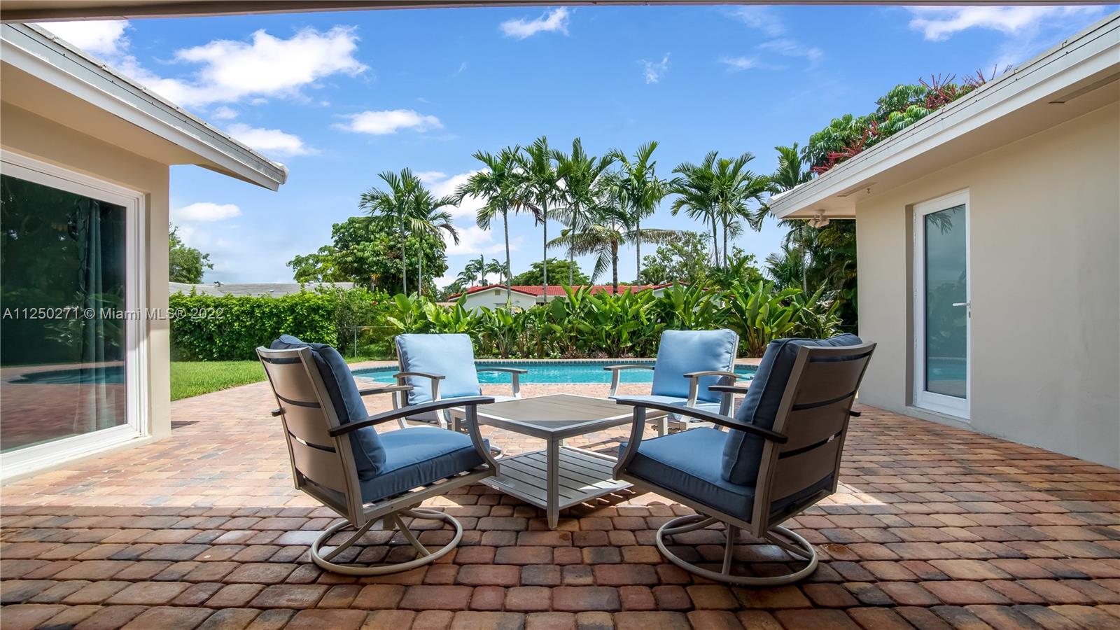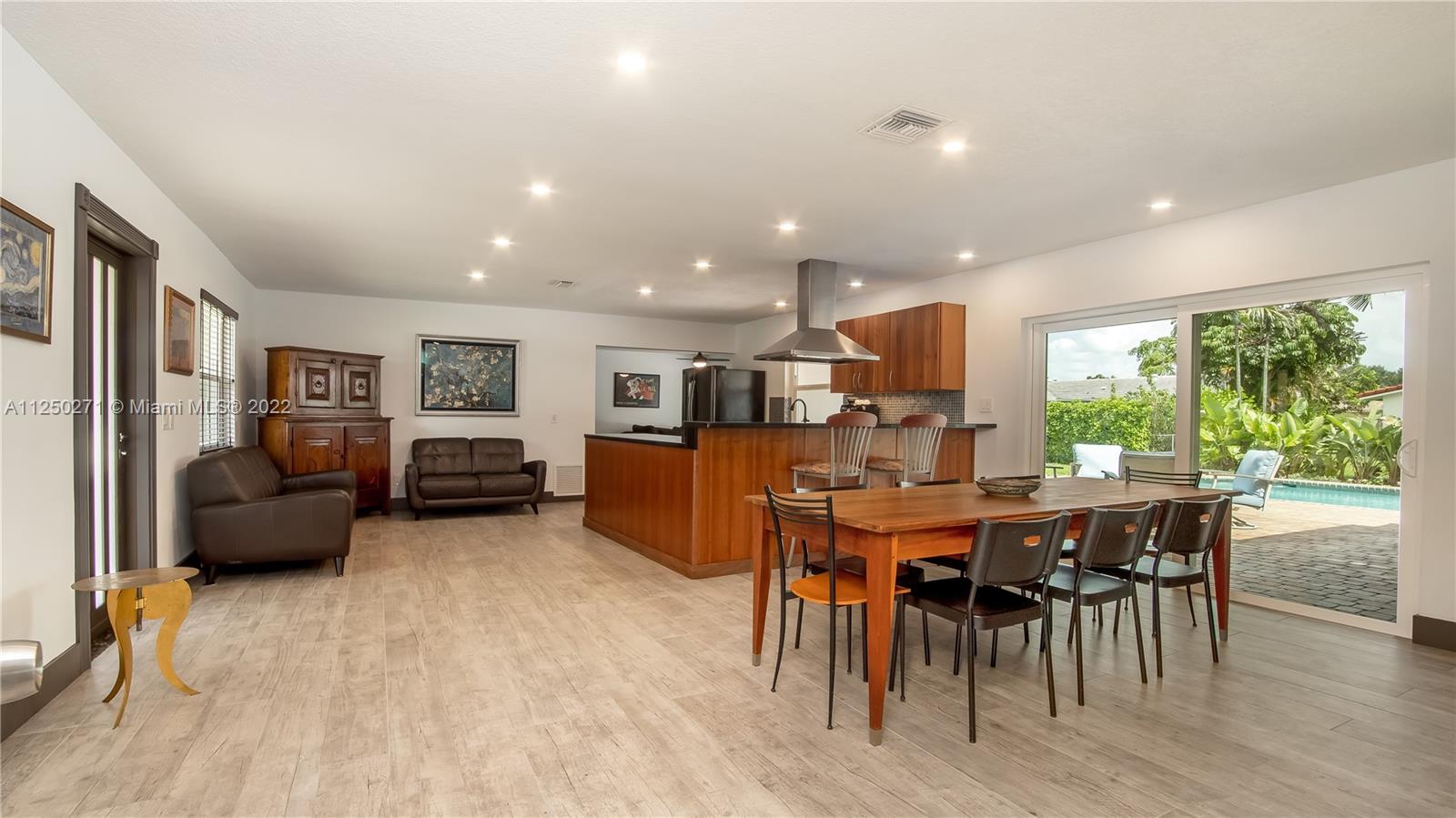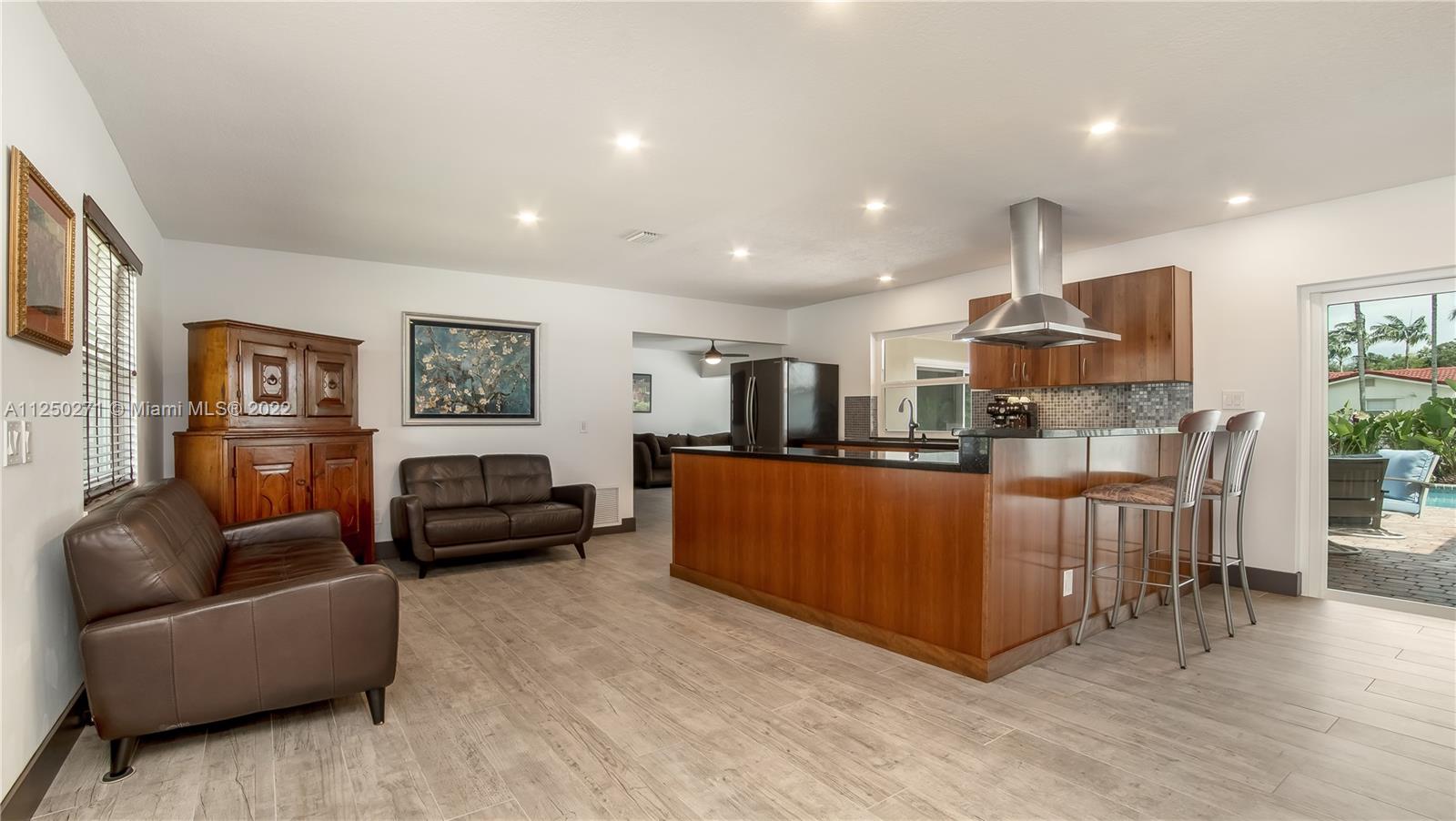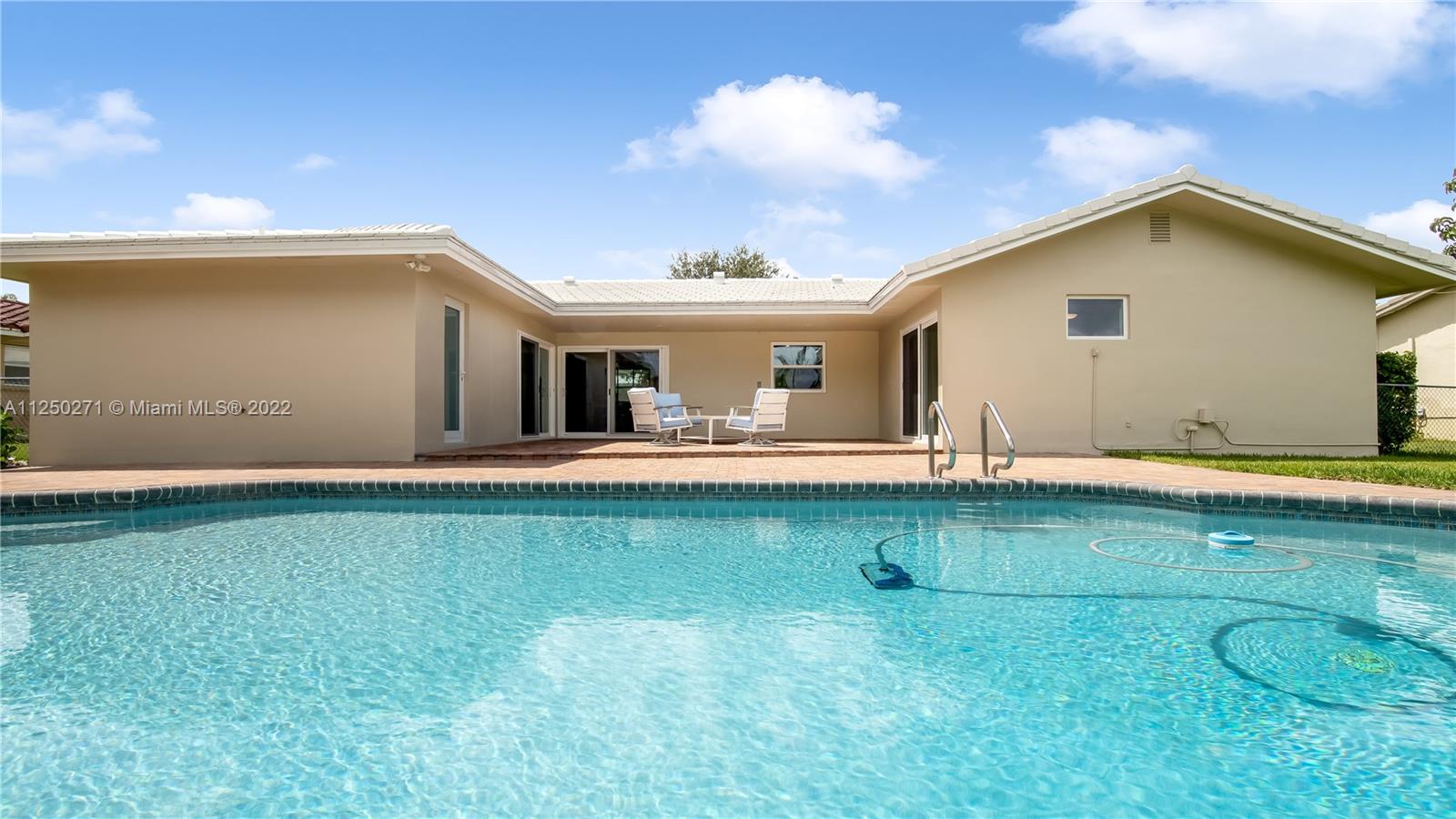 Upgraded and meticulously maintained Chevy Chase 3 Bedroom 2 Bath saltwater pool home with 2 car garage, All entry points are hurricane impact rated. New roof (2021). Chef’s kitchen with solid cherry wood cabinets, stainless steel appliances and granite countertops. Formal dining and den with double pane impact sliders leading out to large outdoor patio for entertaining. Porcelain tile imported from Spain in living areas with wood floors in bedrooms. Large paver circular driveway for guest parking. Central location to schools, dining, entertainment, and shopping. NO HOA.