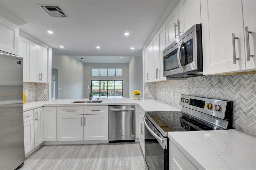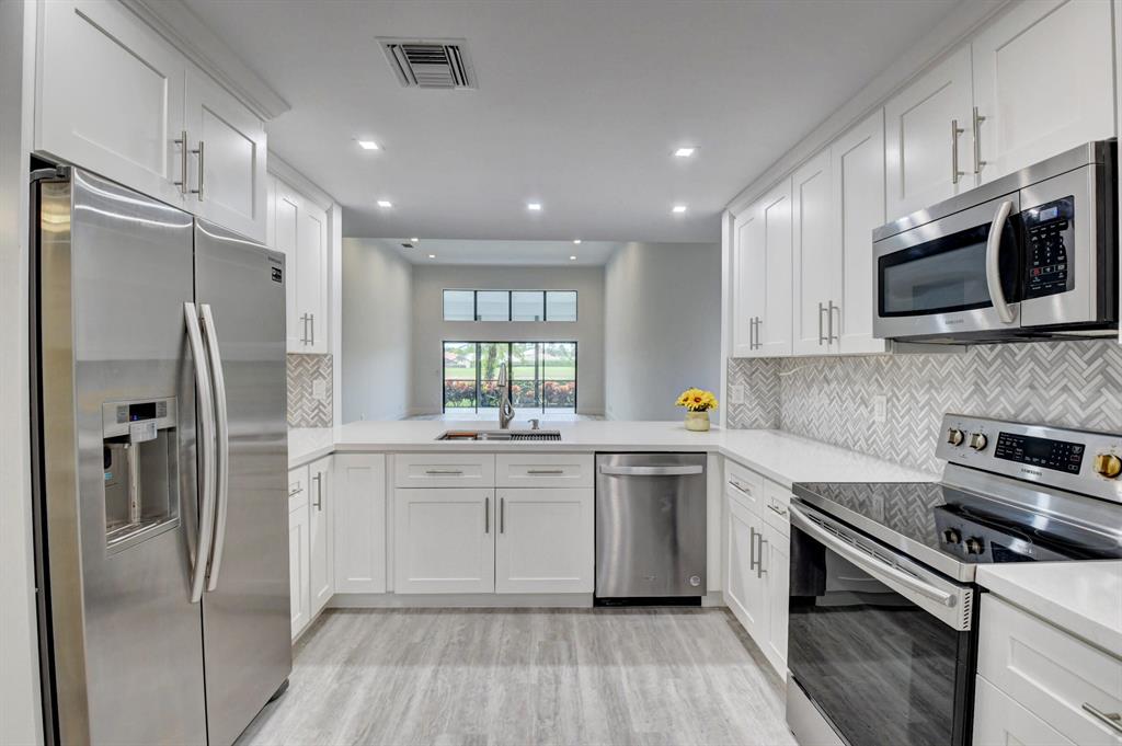 THIS IS AN UNBELIEVABLE LOW PRICE FOR THIS GORGEOUS UNIT !!! TAKE ADVANTAGE - DON'T MISS OUT.RENOVATED and REDONE luxurious townhouse in Meridiana. Open the door to this unit and see beautiful lake and golf course views.Large eat in kitchen has new white cabinets with quartz countertops and open pass thru to enjoy the fabulous views. Ensuite master bath area is totally redone with double marble shower and redone dressing area with double sinks. Guest bath is redone . Smooth ceilings throughout. Loads of storage and closet space. Master is downstairs and 2 bedrooms and beautiful upgraded marble bath upstairs. Very neutral colors and ready to move right in. There is a large screened in covered patio to enjoy the beautiful views. Community has pool and small clubroom.