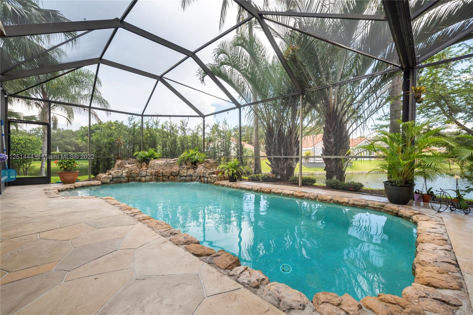 Beautifully updated one story pool home with spectacular lake views nestled on a cul-de-sac lot in the desirable Mayfair at Jacaranda Community. Impeccably maintained. Here you will be greeted by vaulted ceilings and a nice bright living/dining room followed by a gourmet kitchen with granite counters, breakfast bar, and stainless appliances. The owners suite features sweeping lake views, a large walk-in closet and en-suite bath with separate tub/shower and granite counters. The back screened patio is perfect for gatherings or your own personal oasis. Other features include a Cabana bath, Wet Bar, Atrium, Front Load Washer/Dryer, 2 Car Garage, Roof (2006), A/C (2015), Freshly Painted Exterior. Low HOA.