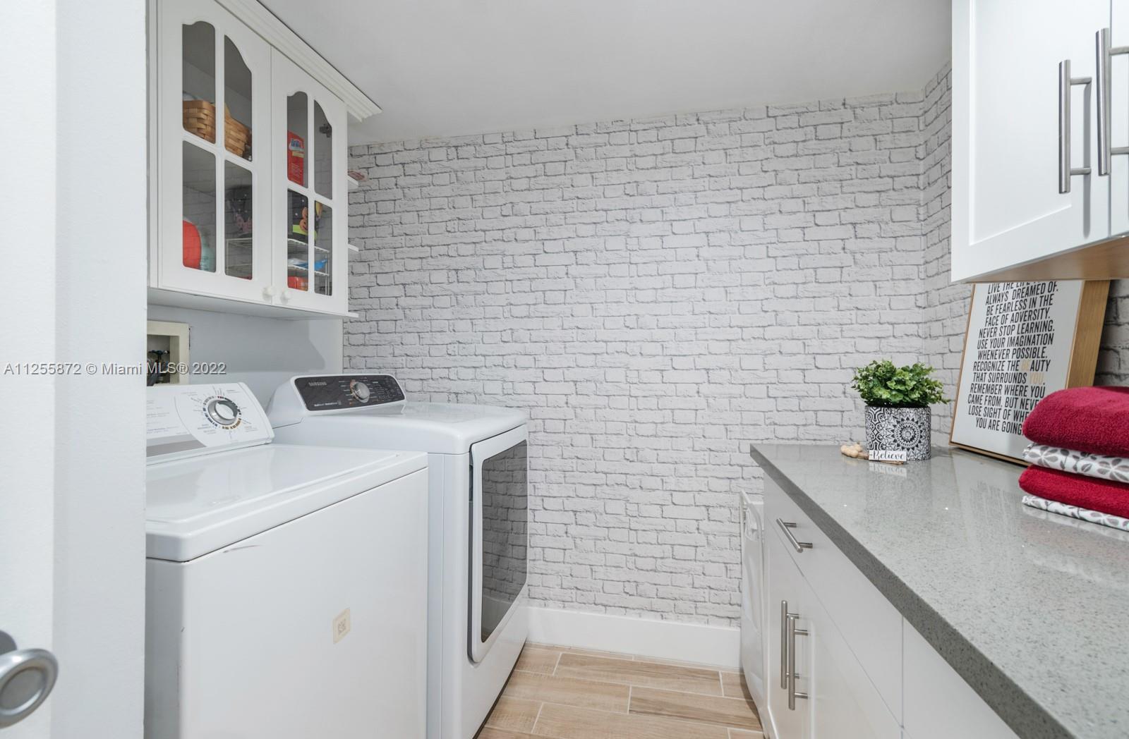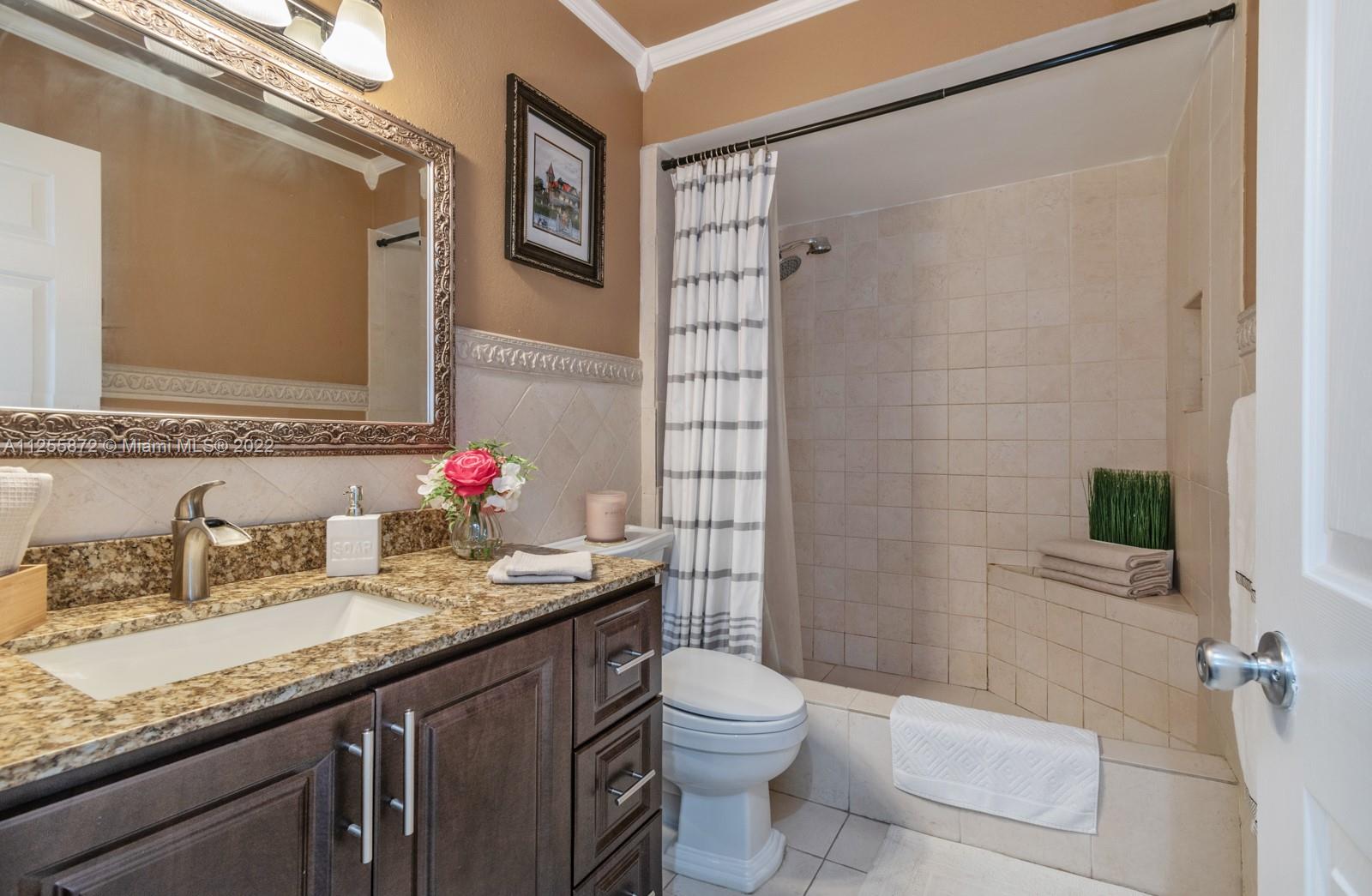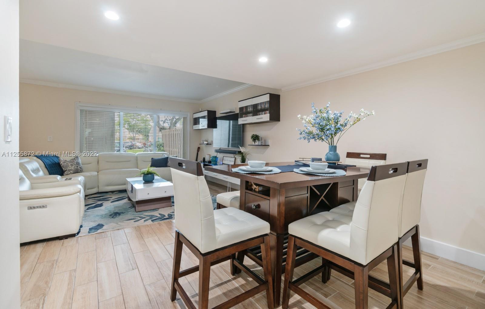 Your future home awaits! Rarely available 3/3 townhome in gated Flamingo Villas. Renovated with NEW modern kitchen, stainless steel, granite counters, 42” cabinets, waterfall island, backsplash, oversized sink. Downstairs features spacious living room, dining area, full bedroom + bath, renovated laundry with new cabinets, ample storage & quartz counters. Closet addition beneath staircase. Upstairs features 2 bedrooms including primary with vaulted ceiling & custom built-in entertainment unit. Popcorn removed + recessed lighting throughout. Custom built-ins in all closets. Back patio upgraded with tile, gazebo & storage. NEW roof, NEW impact windows and doors, NEW screens, NEW flooring, NEW chandeliers, NEW A/C, NEW tankless water heater! Smart home features keyless door & Nest. LOW HOA!