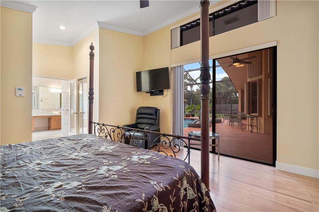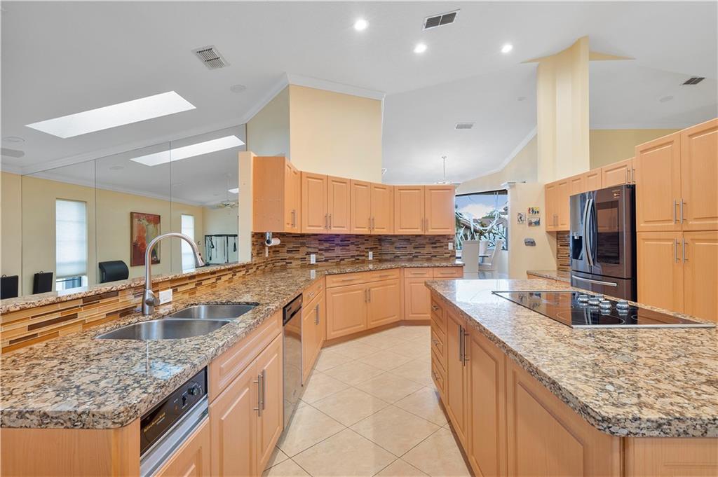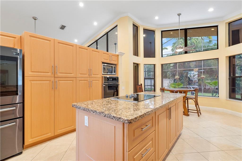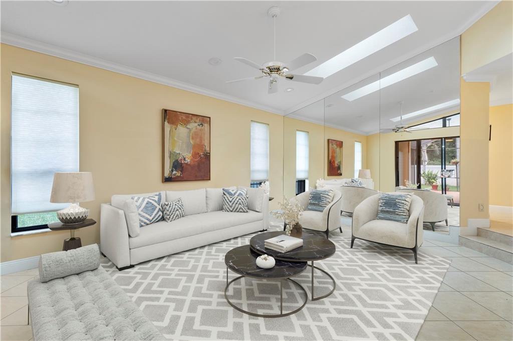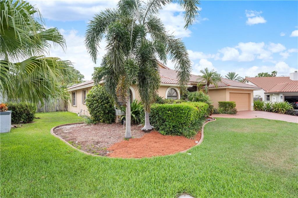One or more photo(s) has been virtually staged. A rare picturesque custom home beautifully designed on both the exterior and interior while being located on a cul-de-sac. Approx. 2600 SF with a 2-car garage and a tile roof. Two sky lights located in living area and one in the master bathroom. Hurricane safe with combination of accordion shutters and impact glass windows. Electric panel recently replaced. Vaulted ceilings with windows extending from ceiling to floor in living areas and kitchen. Bedrooms have laminate wood flooring. Crown moldings throughout home with LED recessed lights in the kitchen and living areas. An oversized kitchen with lots of cabinets, granite counter space, a polished glass backsplash and a central island with views of the pool/patio.