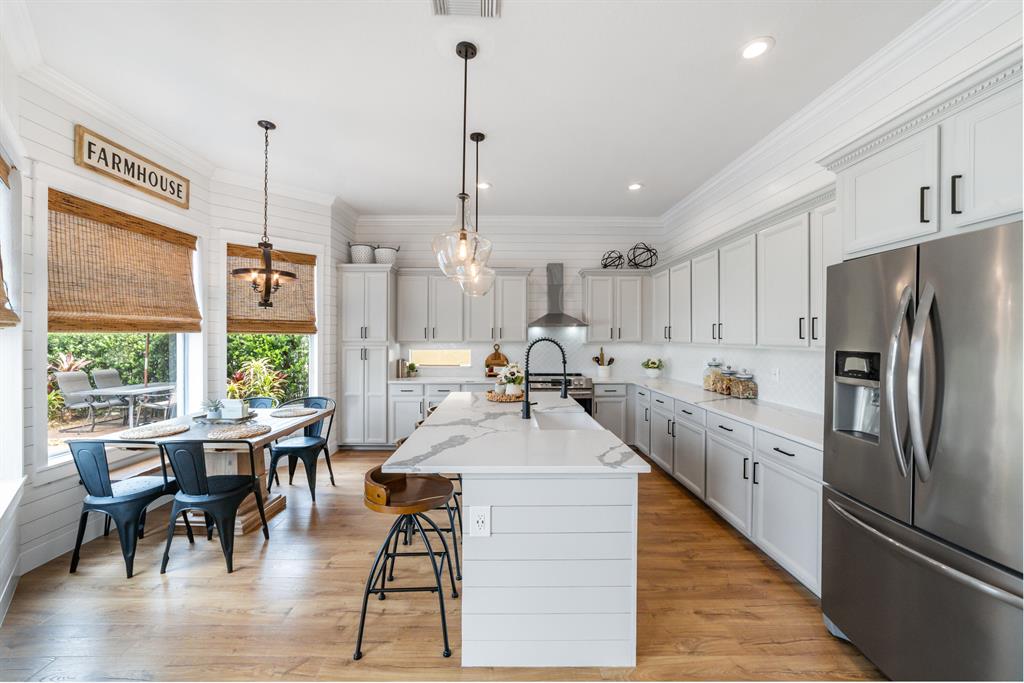 It's true. Gray is the new white and one of the most desirable colors of kitchen cabinets. The soft gray color of the kitchen cabinets allows the farmhouse space to feel relaxed without overwhelming the cabinets. The gorgeous white Farmhouse sink creates a trendy appearance with a visible bowl-front while providing all the benefits of a reliable deep basin. A white quartz countertop with gray veins ties it all together! The countertops don't need much upkeep. You won't need to use harsh chemicals to clean if you quickly wipe up any spills. Quartz countertops are more durable than most natural stone surfaces. At the center of it all, you will find a convection oven. This oven cooks faster than a traditional oven and saves energy compared to a regular range.
